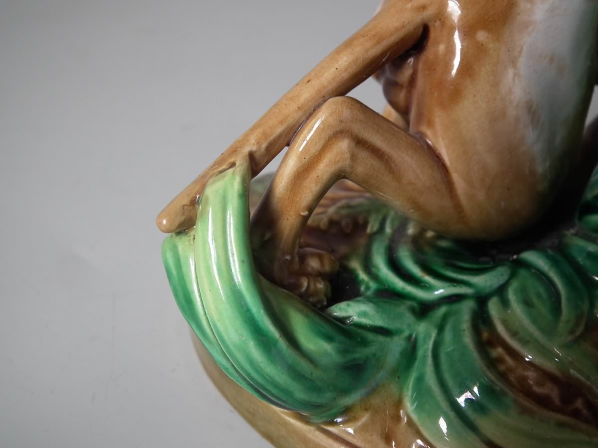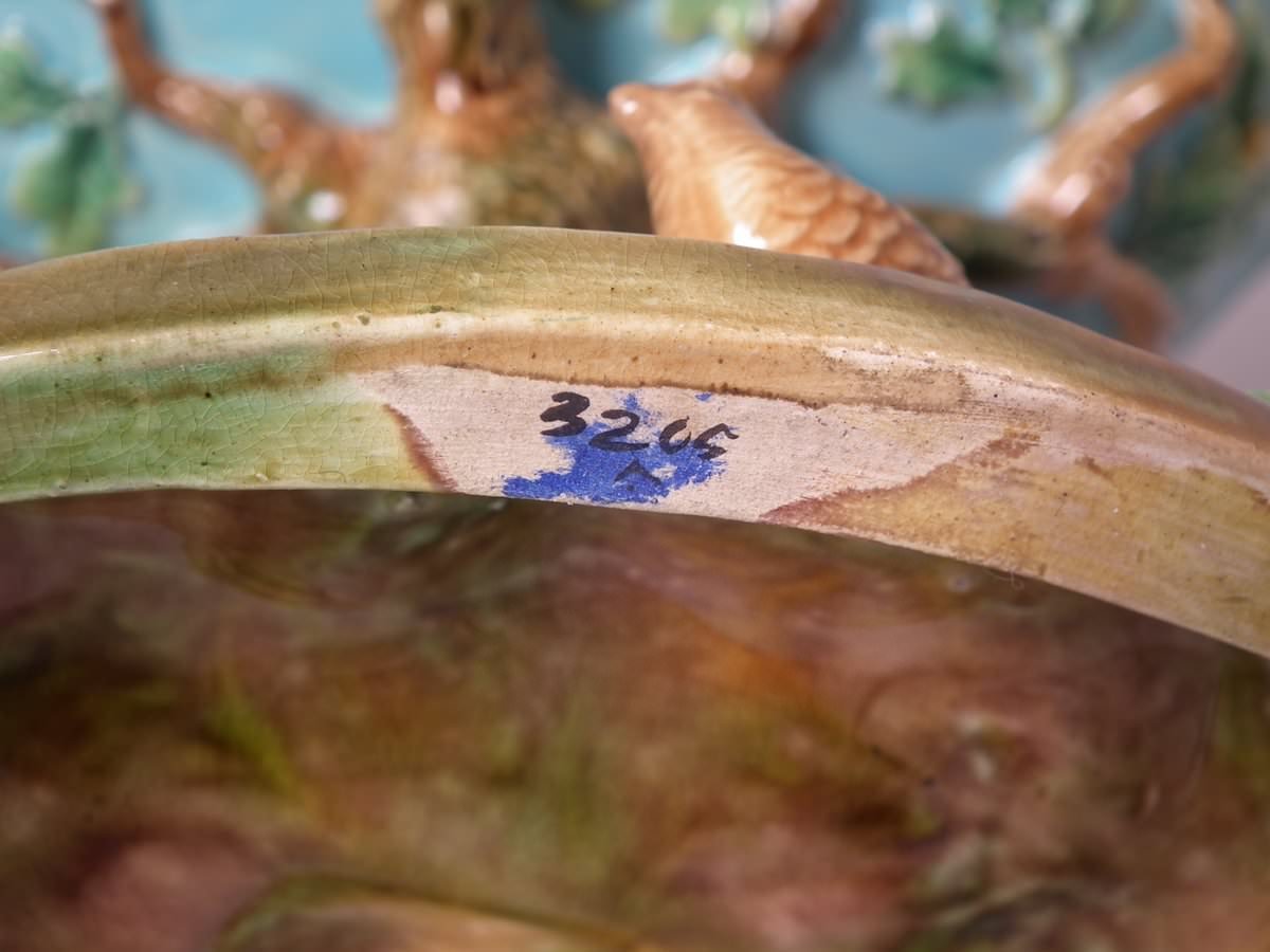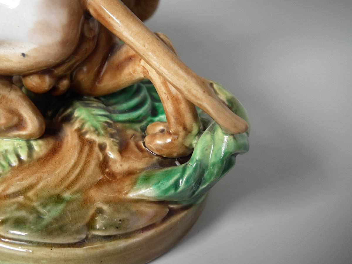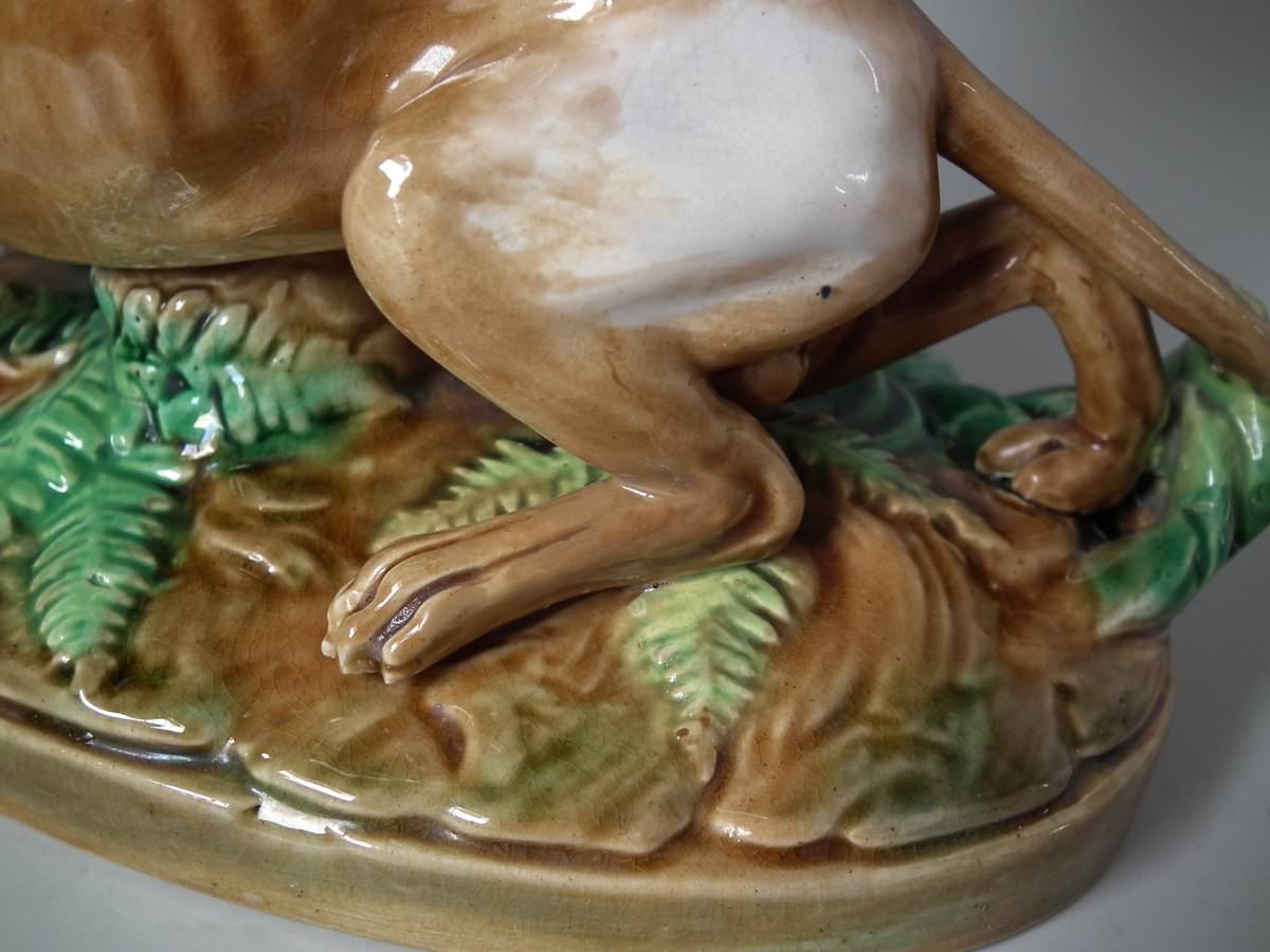Victorian, circa 1870. 7.9ins high, 10.2ins wide, 7.5ins depth. George Jones Majolica compote which features a pointer stalking a bird, under an oak tree.