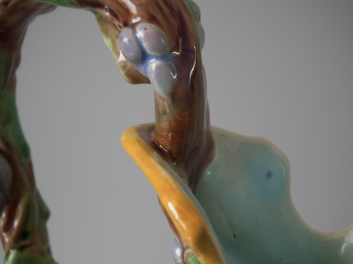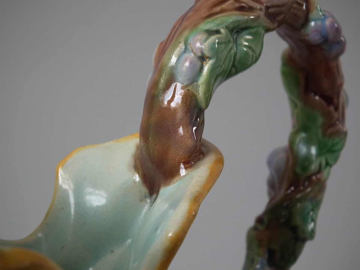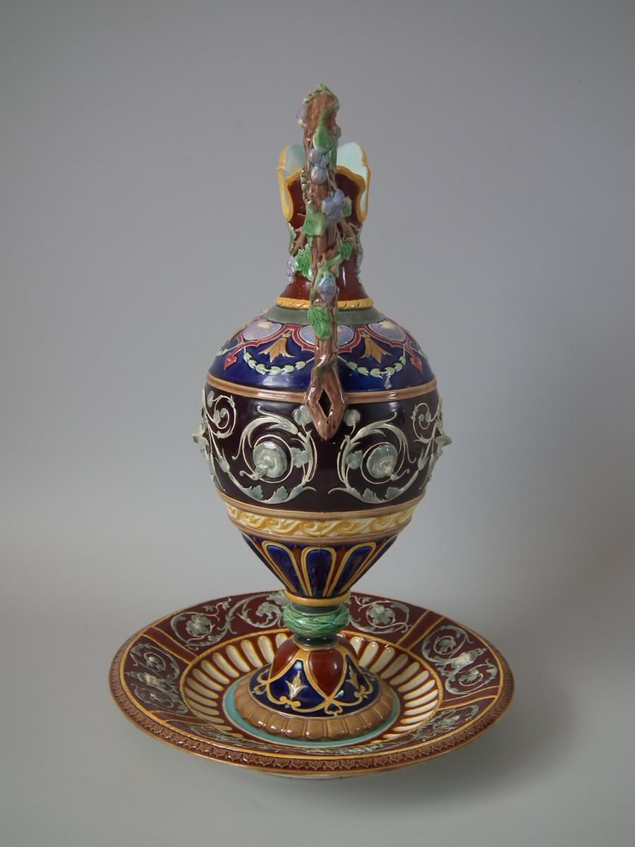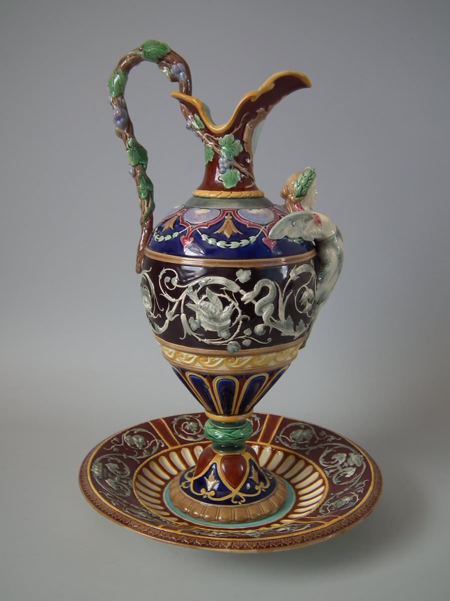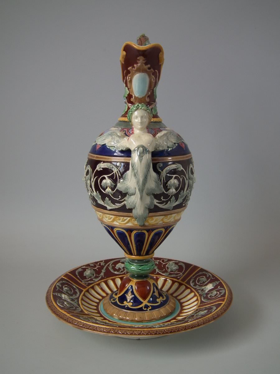 Victorian, circa 1880. 15.4ins high, 9.7ins wide, 9.7ins depth. Copeland Majolica ewer and stand which features winged maiden to front, birds, snakes, foliage and vine fruits decorate sides and handles.