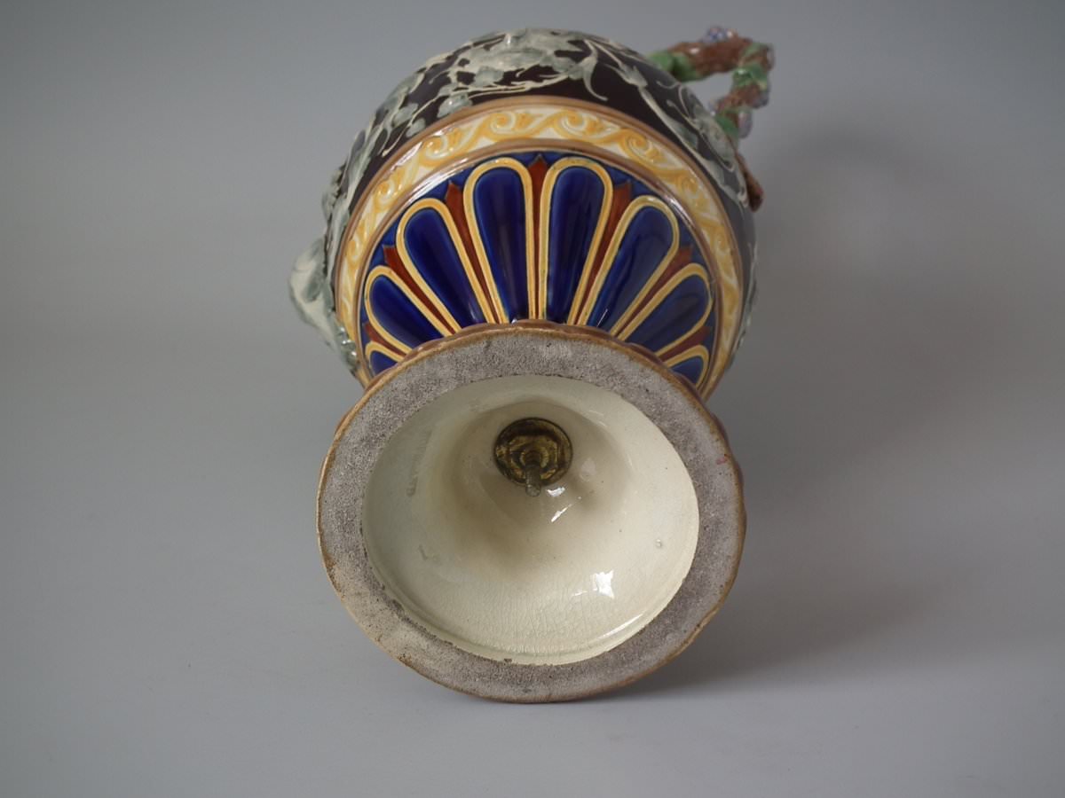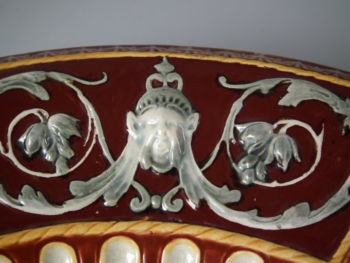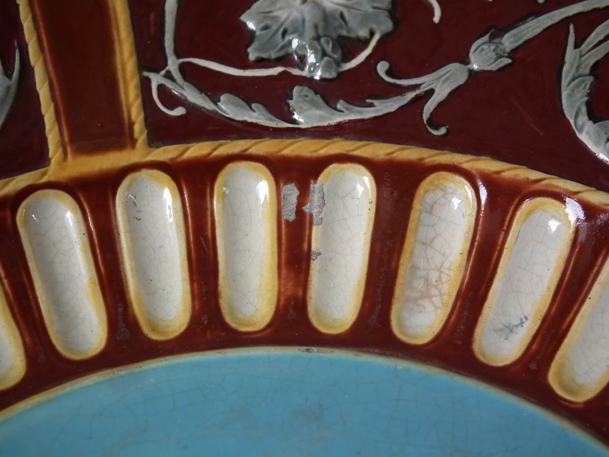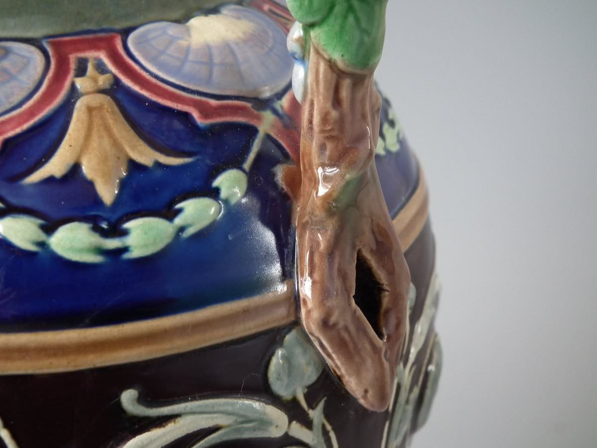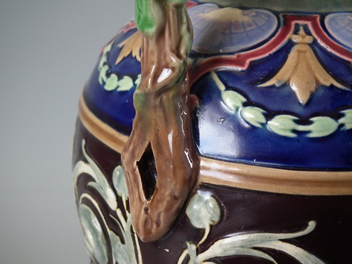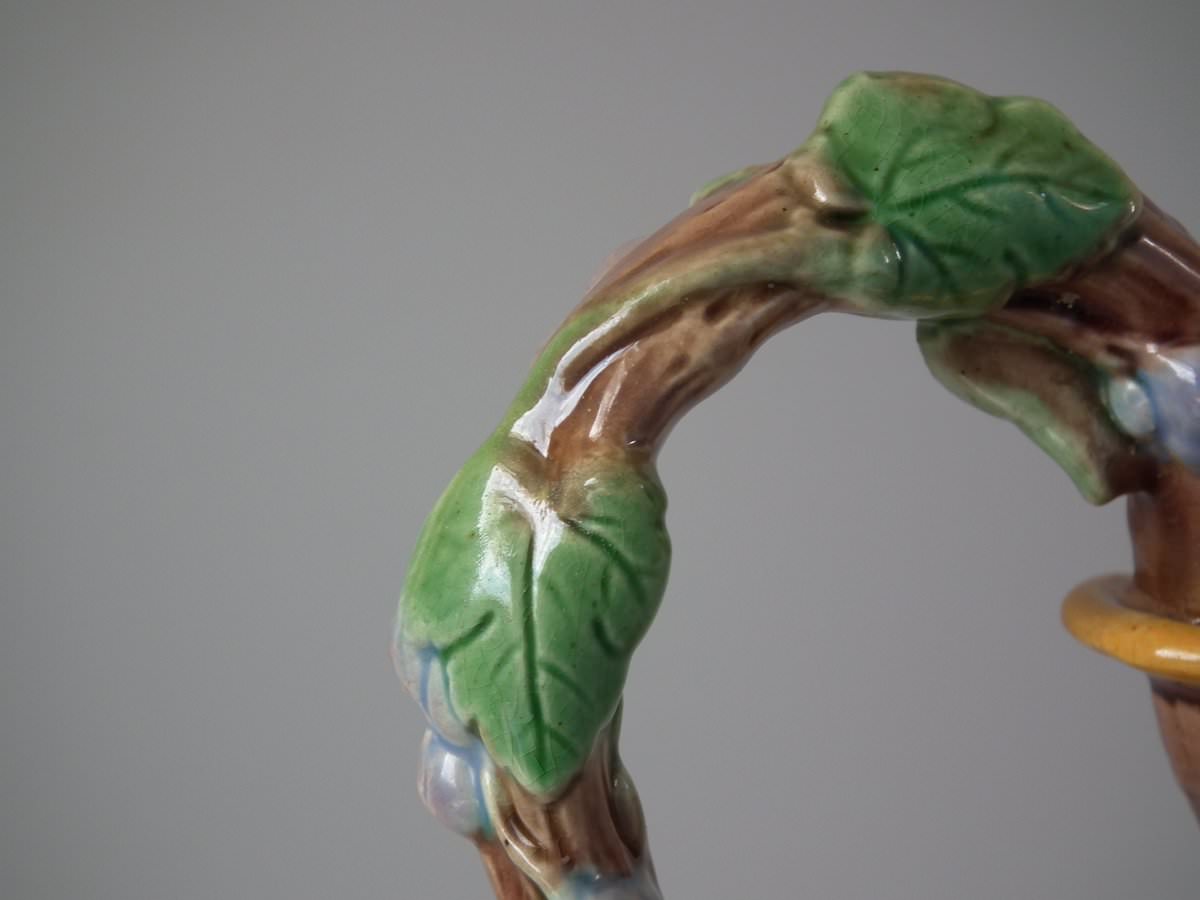 Victorian, circa 1880. 15.4ins high, 9.7ins wide, 9.7ins depth. Copeland Majolica ewer and stand which features winged maiden to front, birds, snakes, foliage and vine fruits decorate sides and handles.