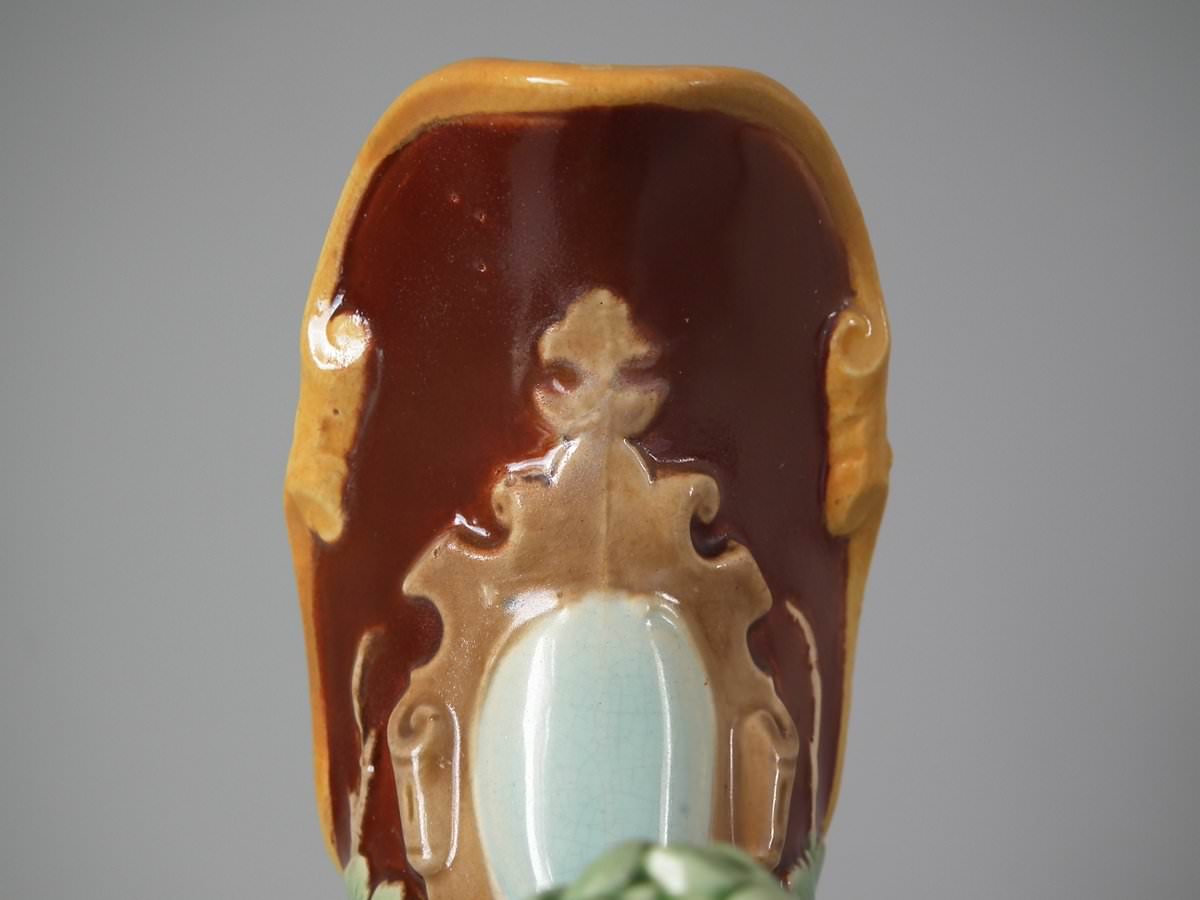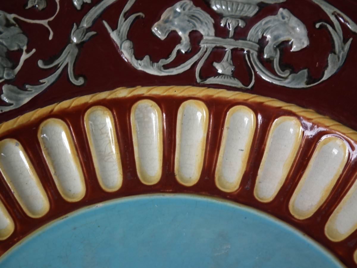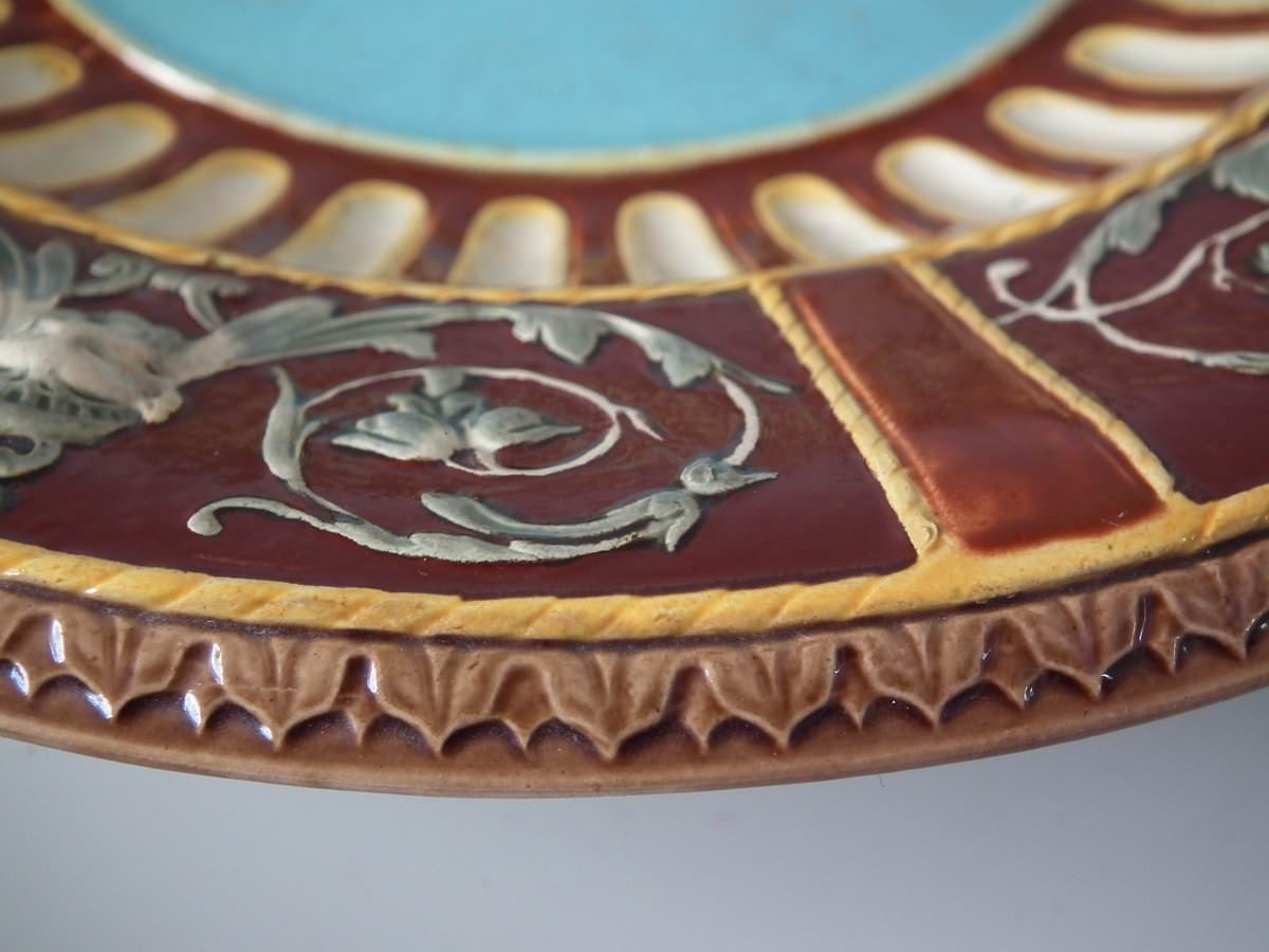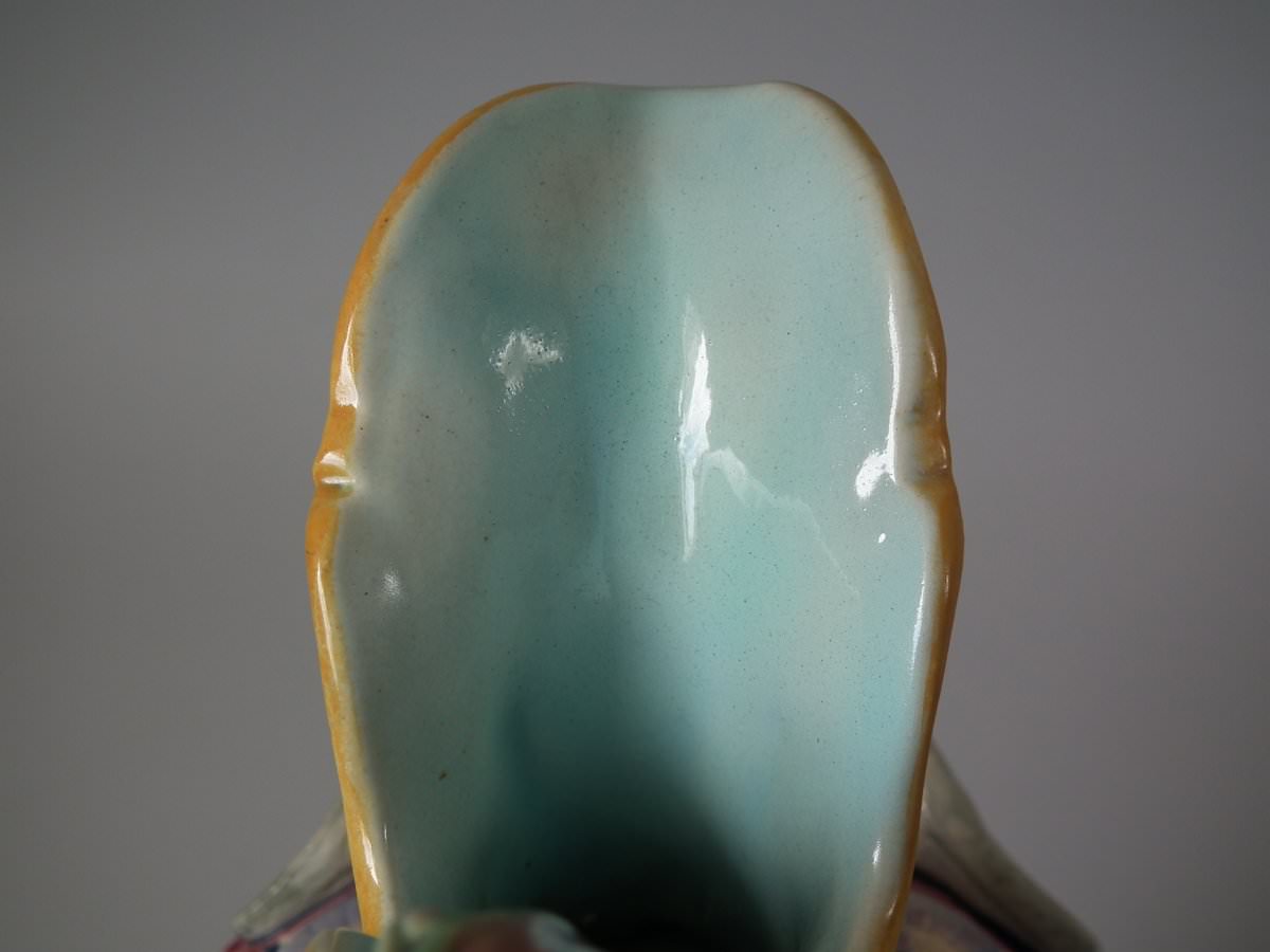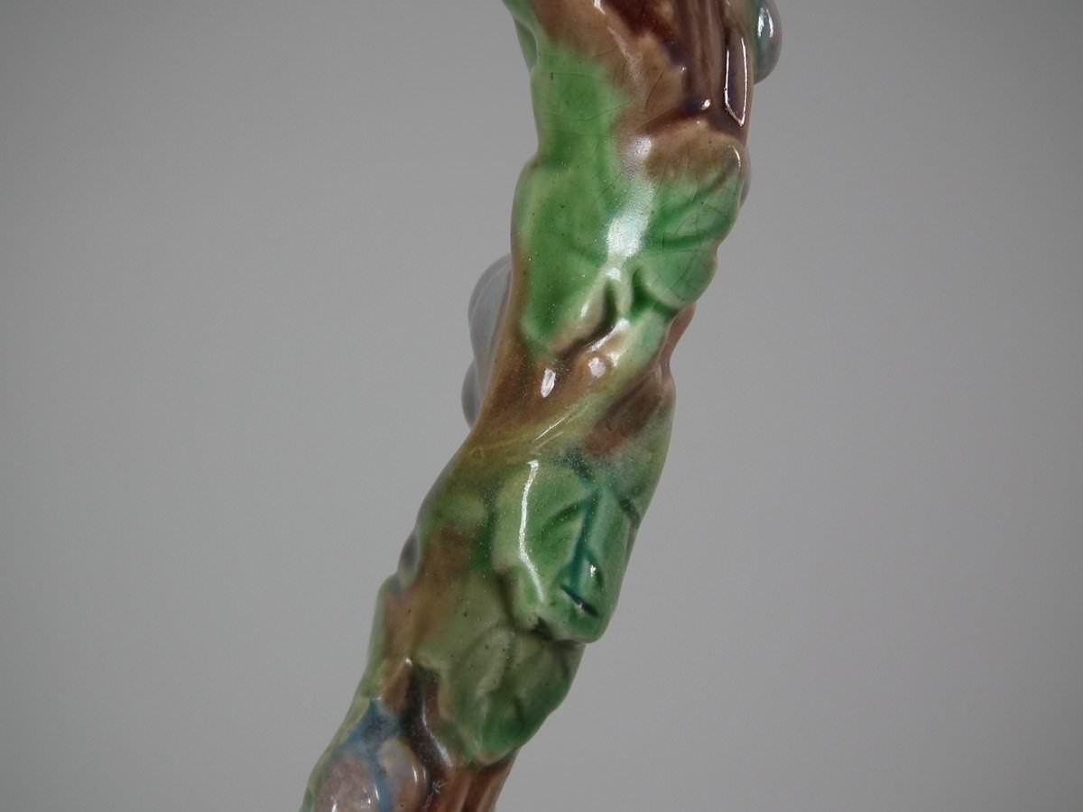 Victorian, circa 1880. 15.4ins high, 9.7ins wide, 9.7ins depth. Copeland Majolica ewer and stand which features winged maiden to front, birds, snakes, foliage and vine fruits decorate sides and handles.