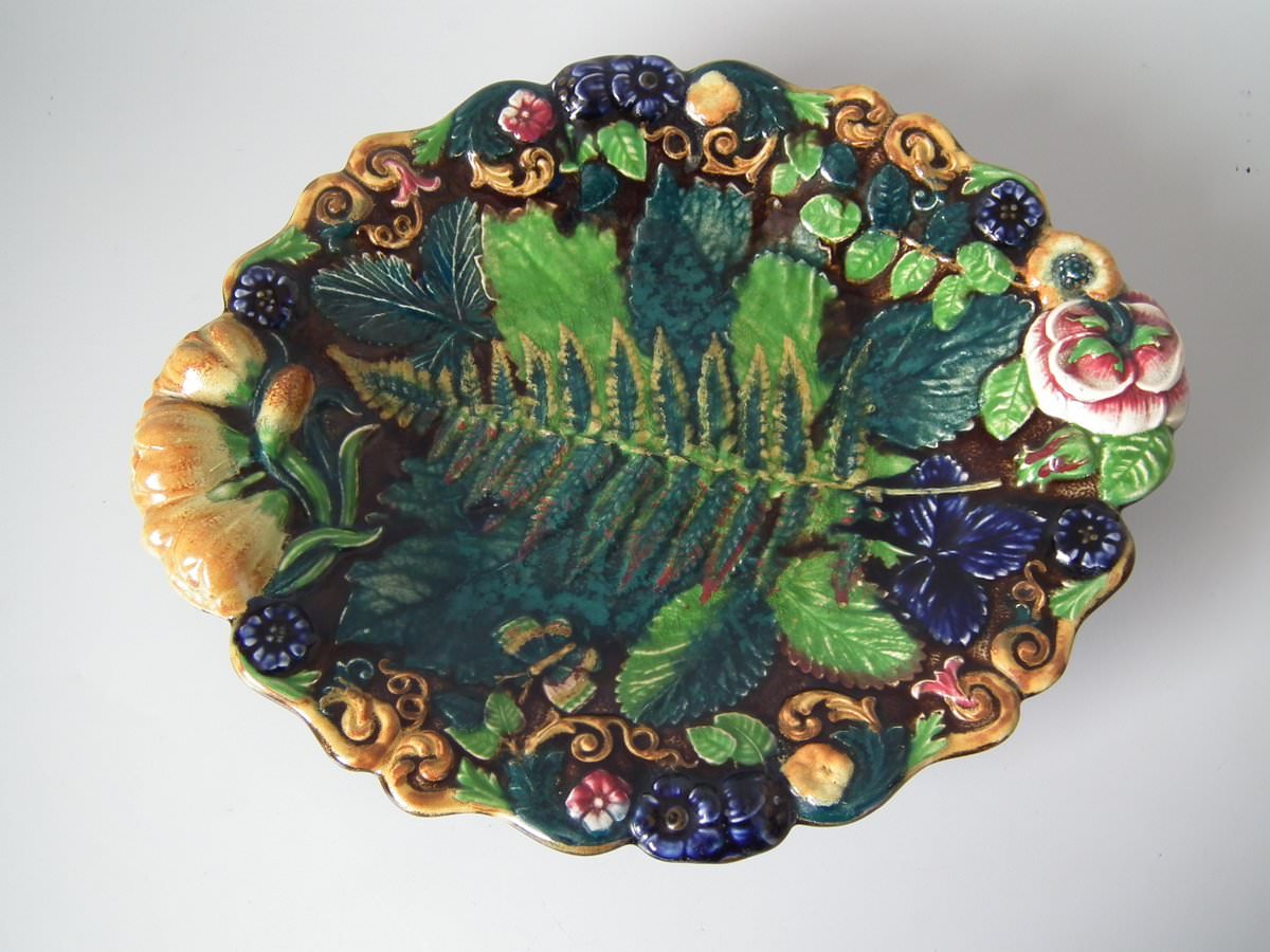 Victorian, circa 1880. 2.6ins high, 11.6ins wide, 9.3ins depth. Alcock Majolica compote which features butterflies, flowers and leaves.