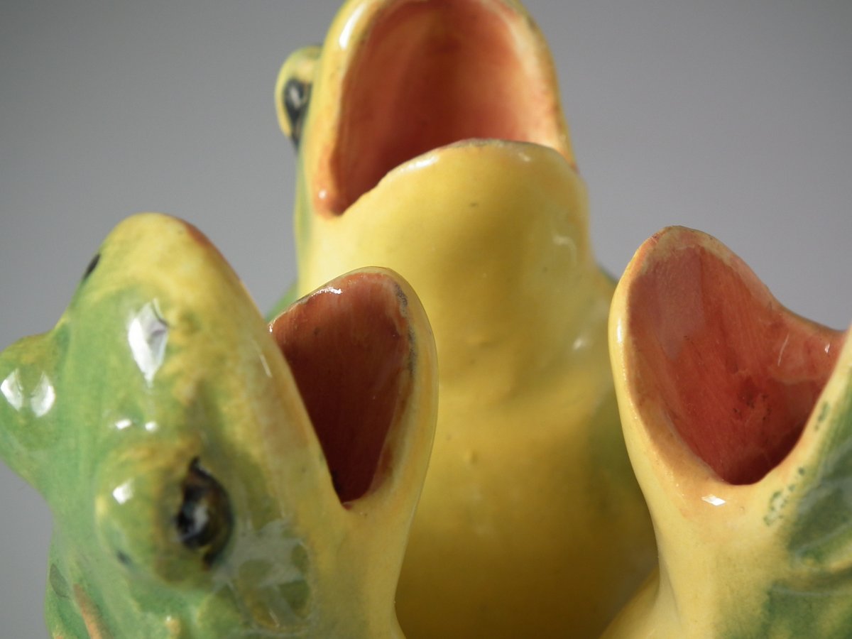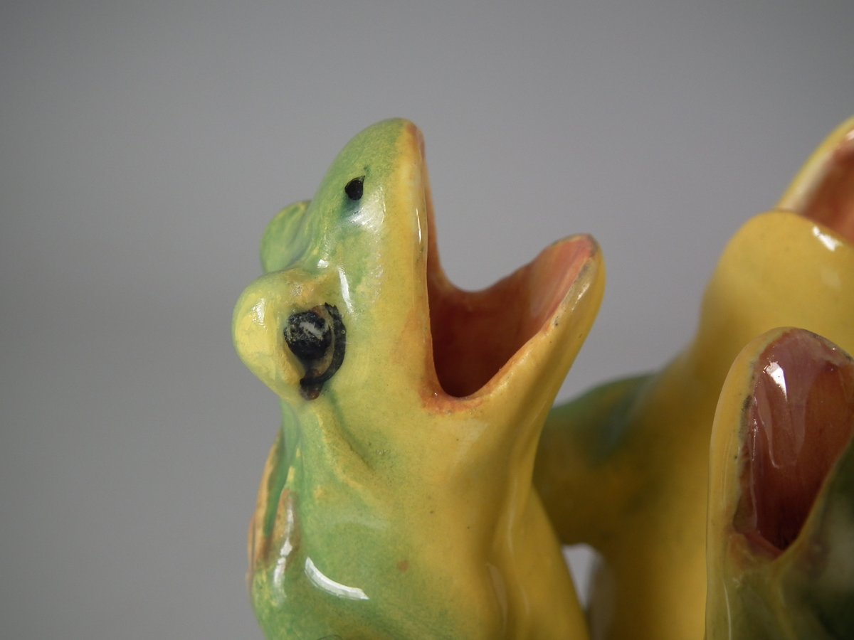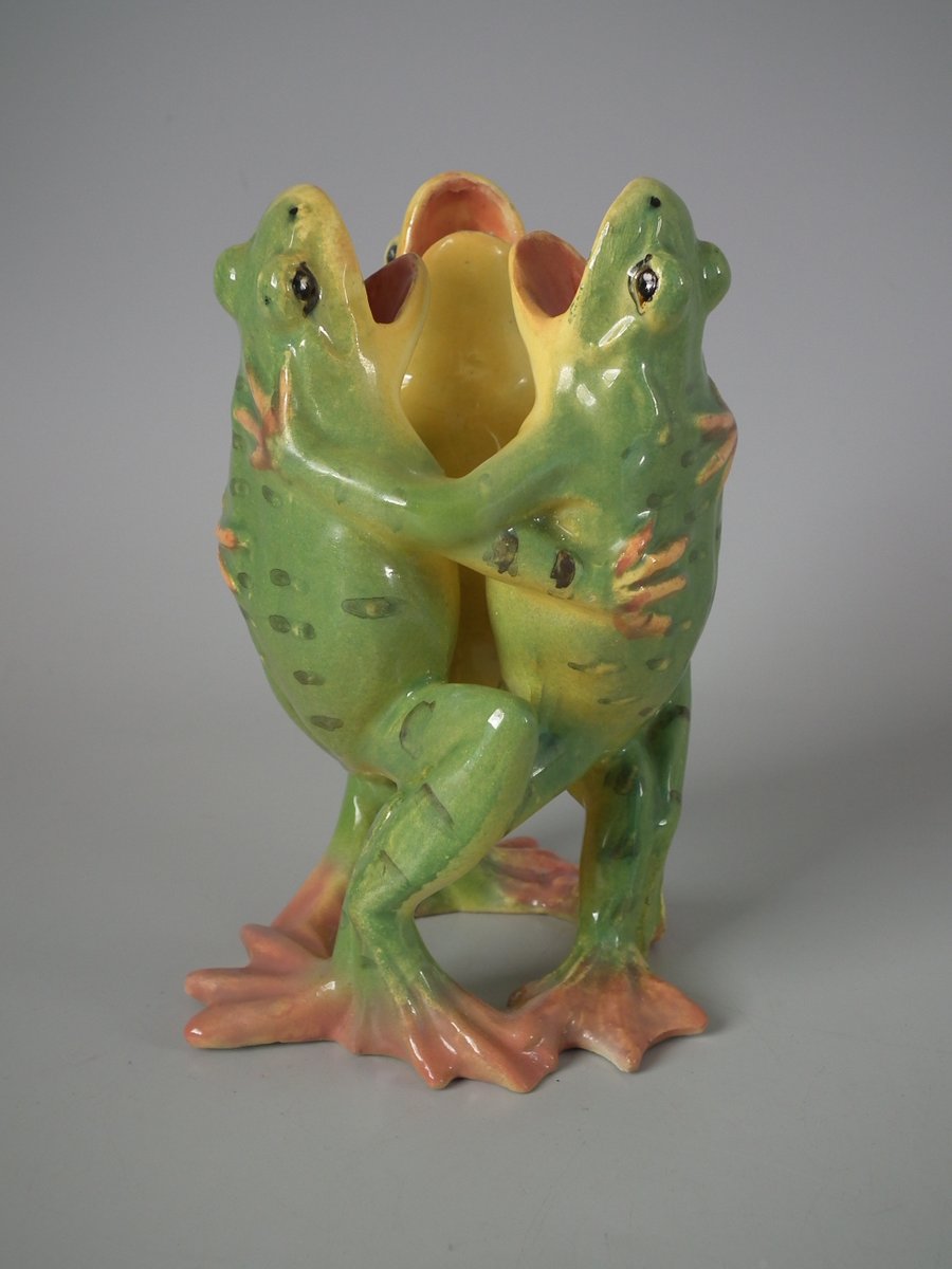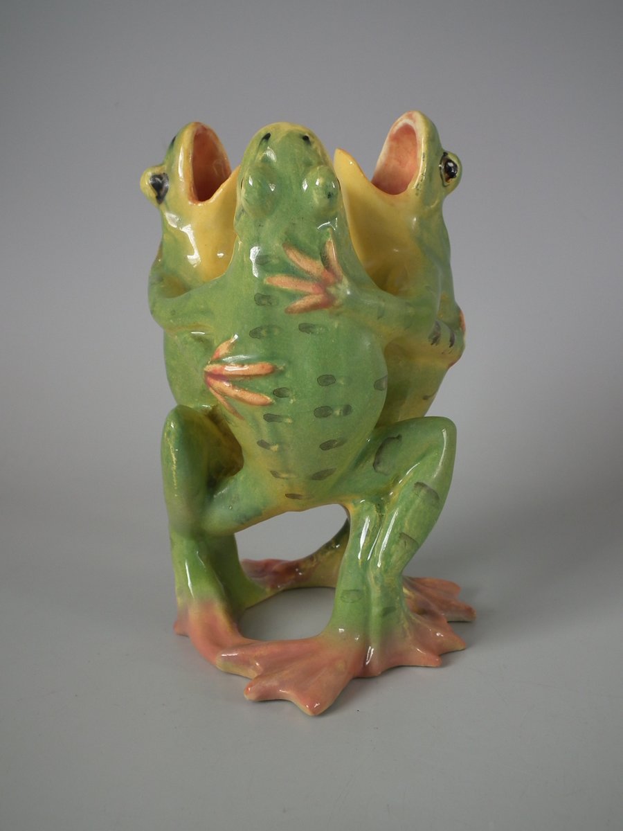 Early 20thC, circa 1908. 5.7ins high, 3.5ins wide, 3.5ins depth. Jerome Massier French Majolica posy holder which features three dancing frogs with open mouths.