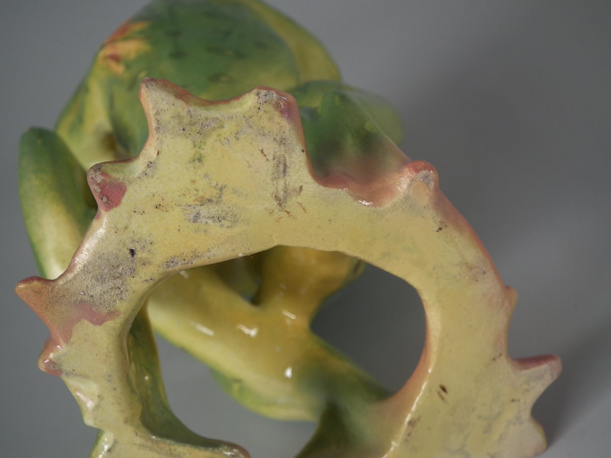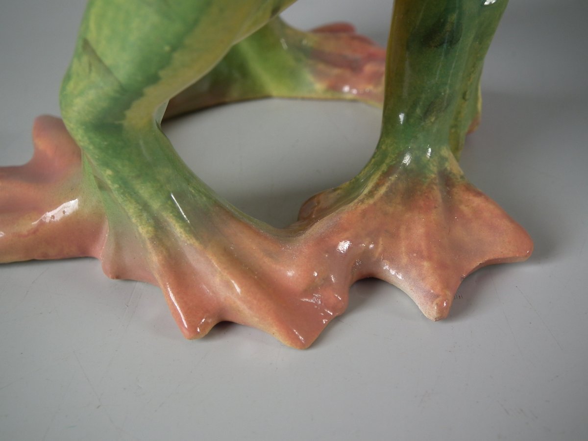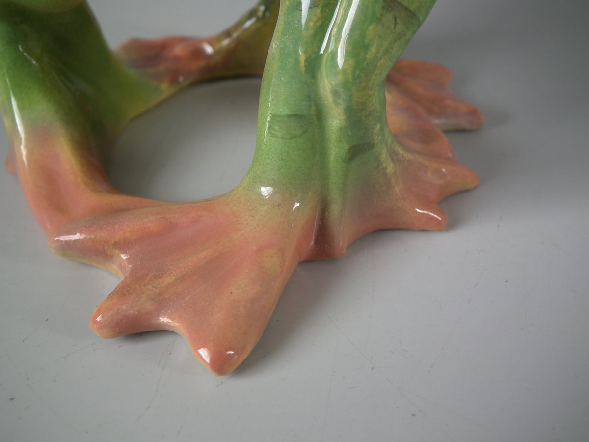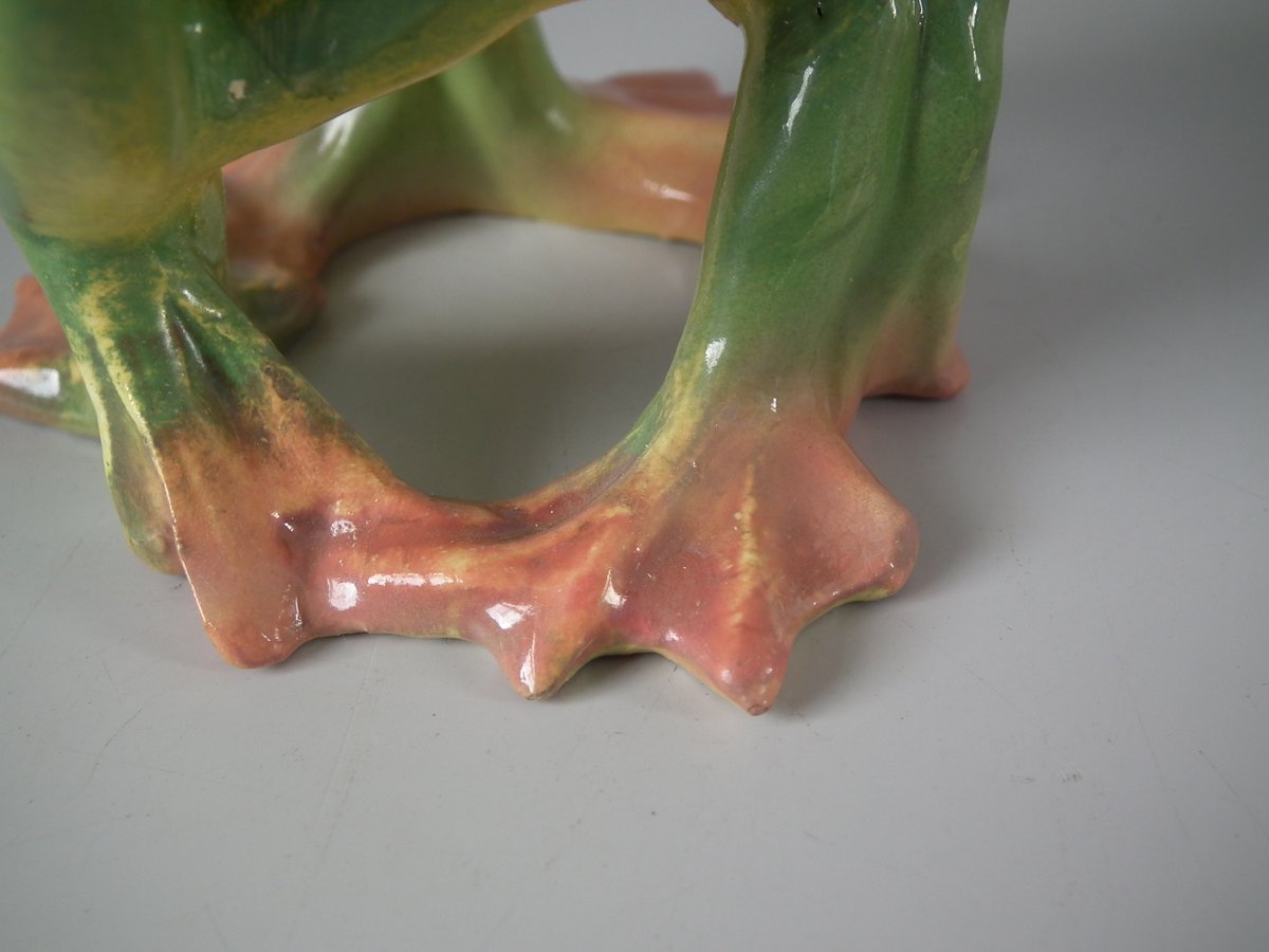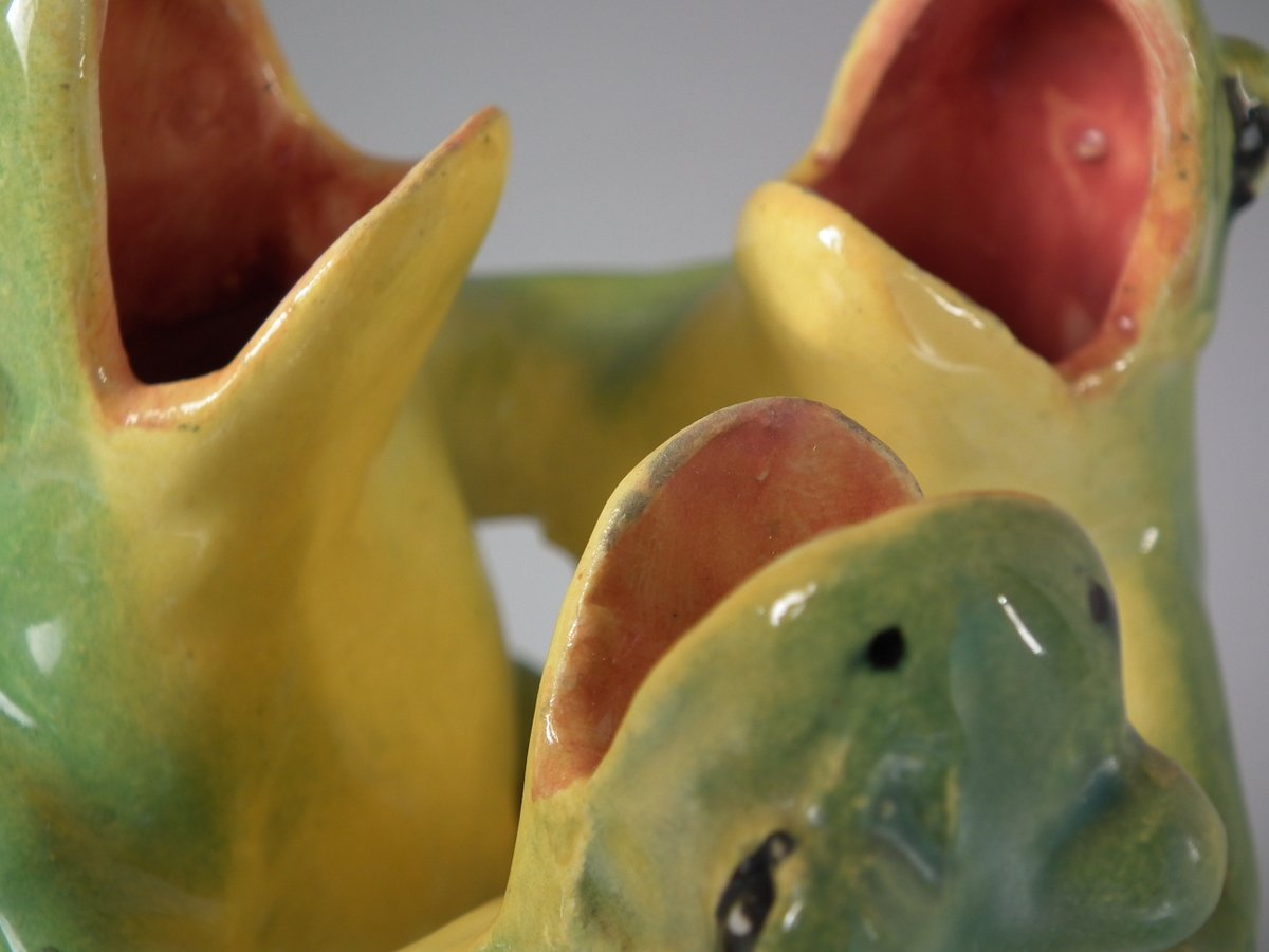 Early 20thC, circa 1908. 5.7ins high, 3.5ins wide, 3.5ins depth. Jerome Massier French Majolica posy holder which features three dancing frogs with open mouths.