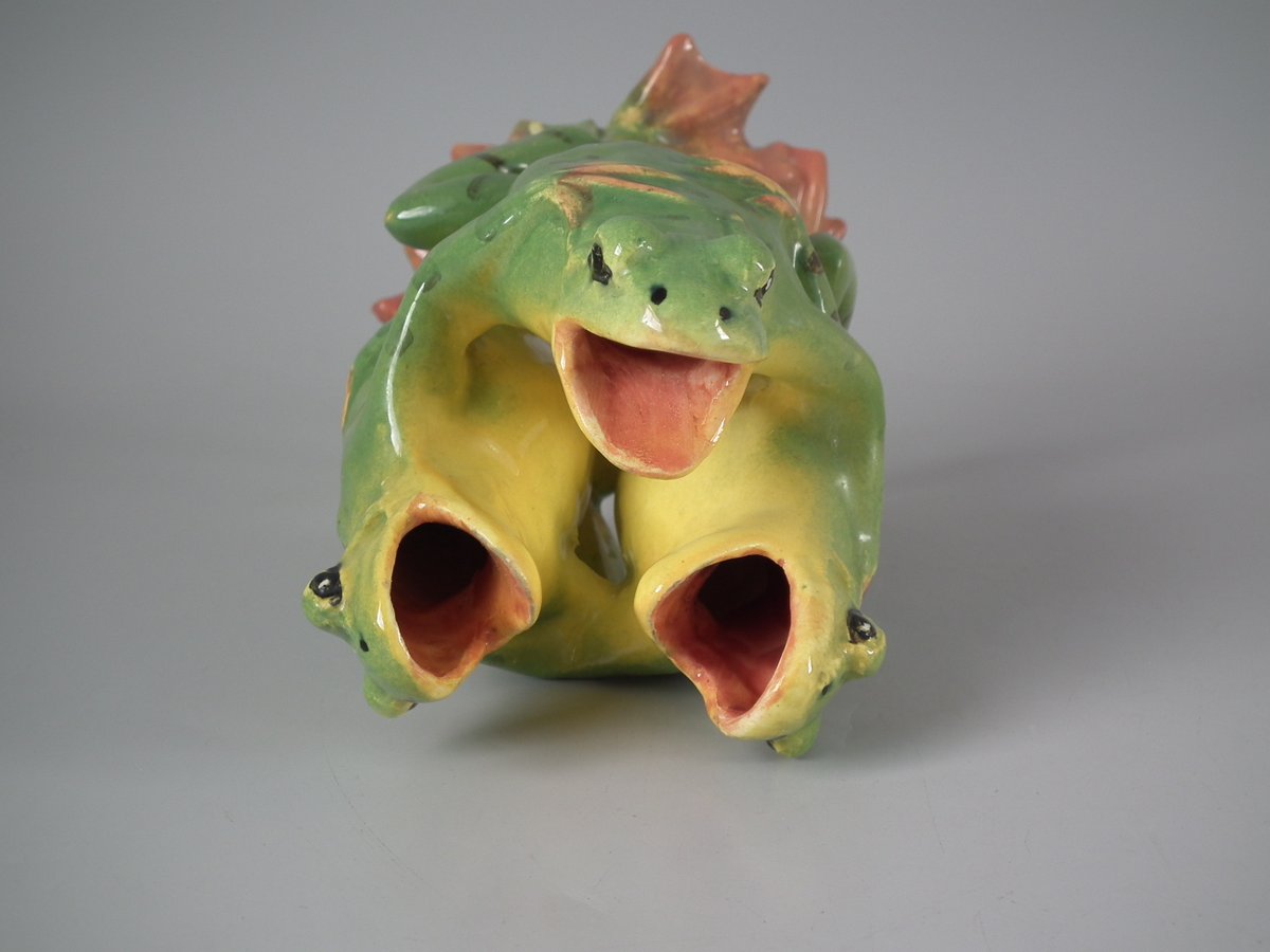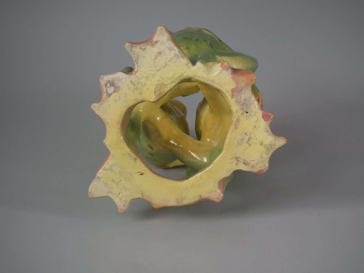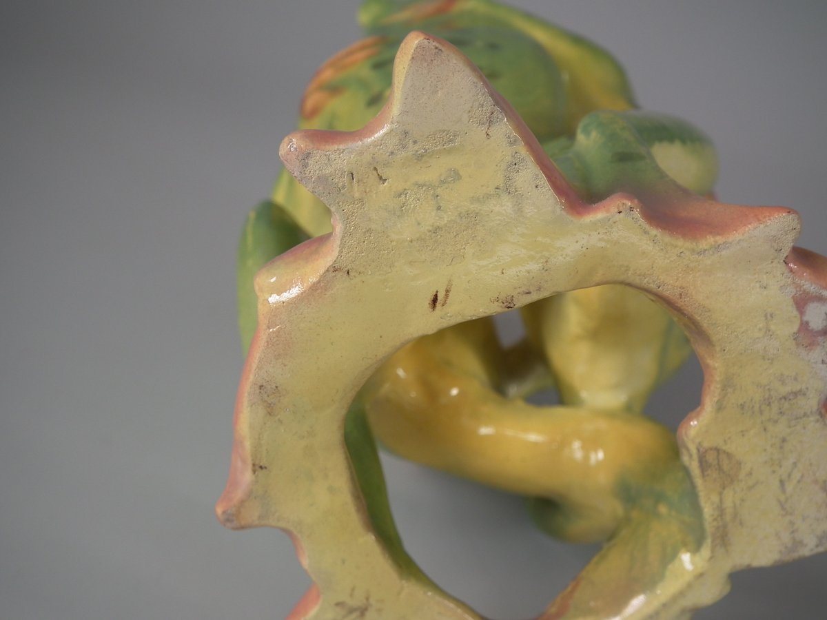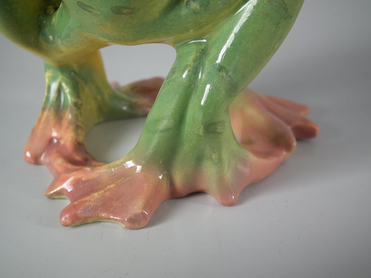 Early 20thC, circa 1908. 5.7ins high, 3.5ins wide, 3.5ins depth. Jerome Massier French Majolica posy holder which features three dancing frogs with open mouths.