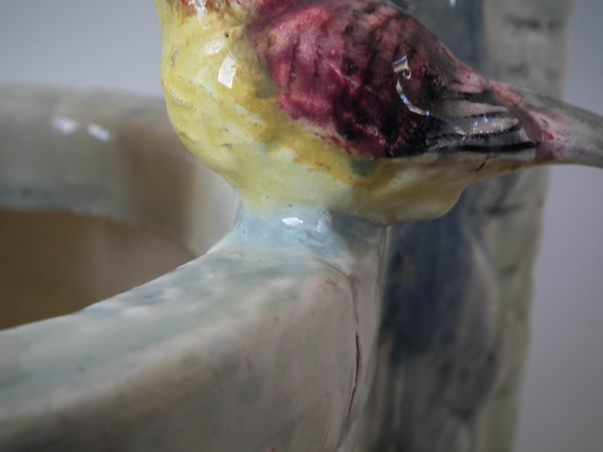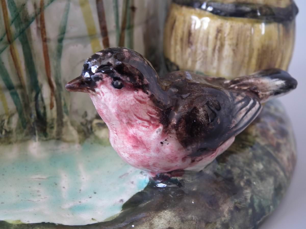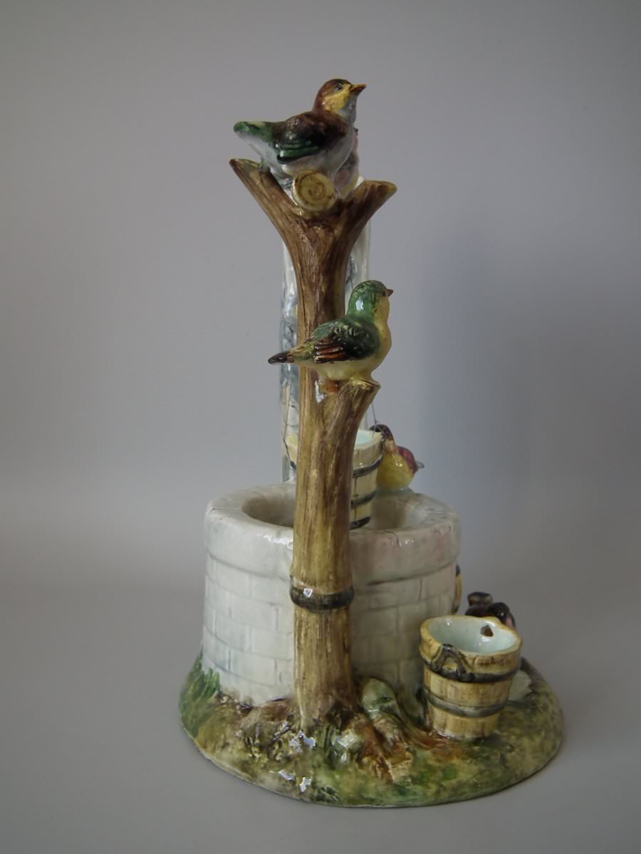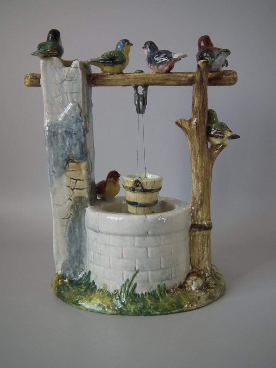Circa 1880. 13.4ins high, 9.1ins wide, 8.7ins depth. Delphin Massier Majolica centrepiece which features seven colourful garden birds, perched around a wishing well.