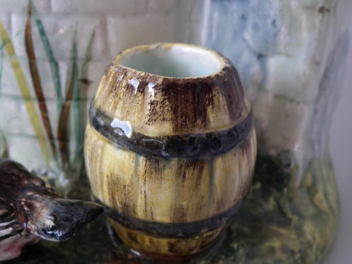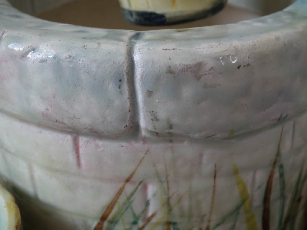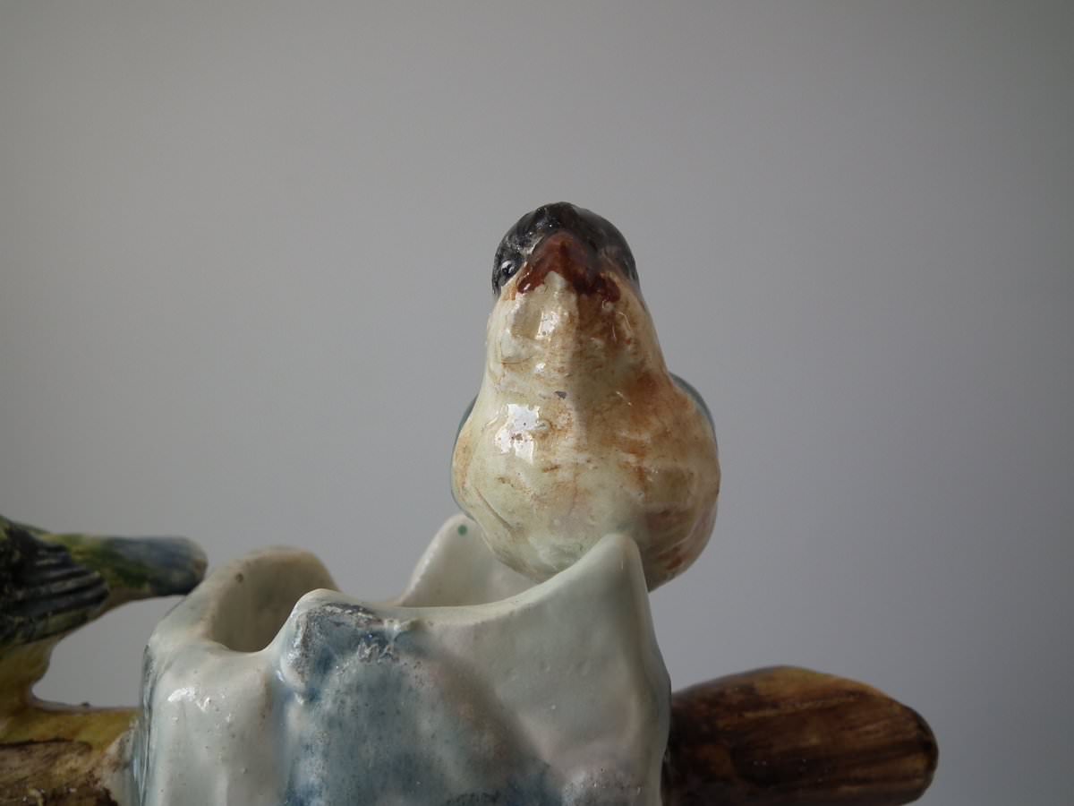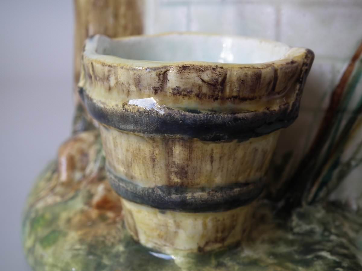Circa 1880. 13.4ins high, 9.1ins wide, 8.7ins depth. Delphin Massier Majolica centrepiece which features seven colourful garden birds, perched around a wishing well.