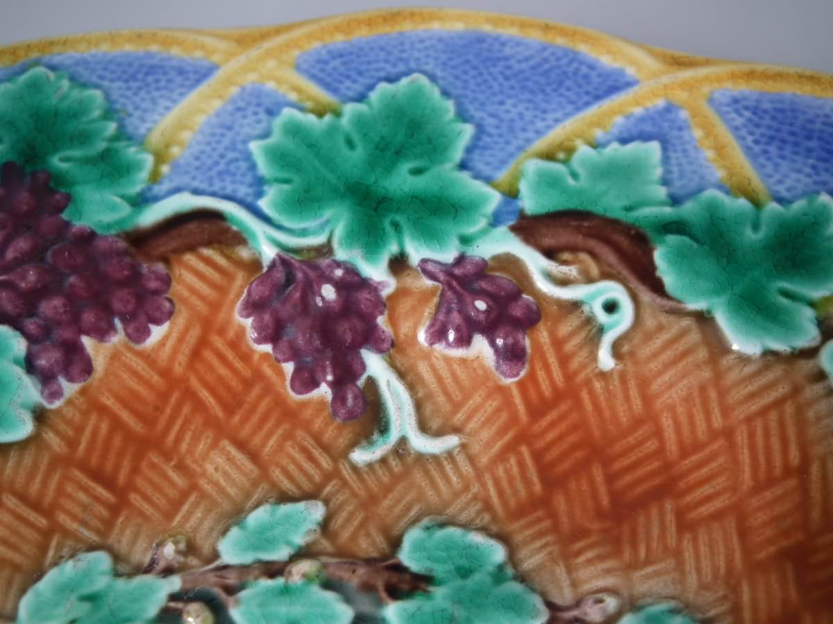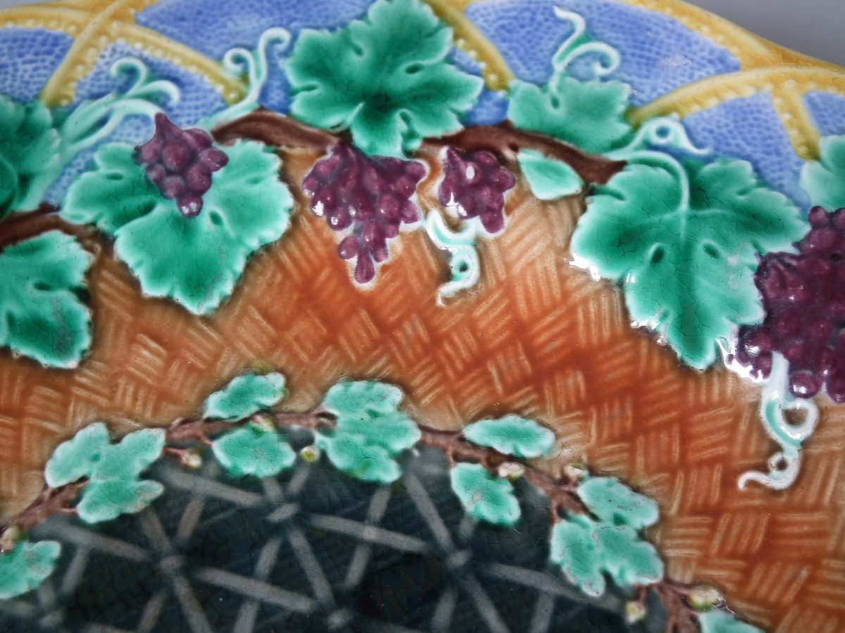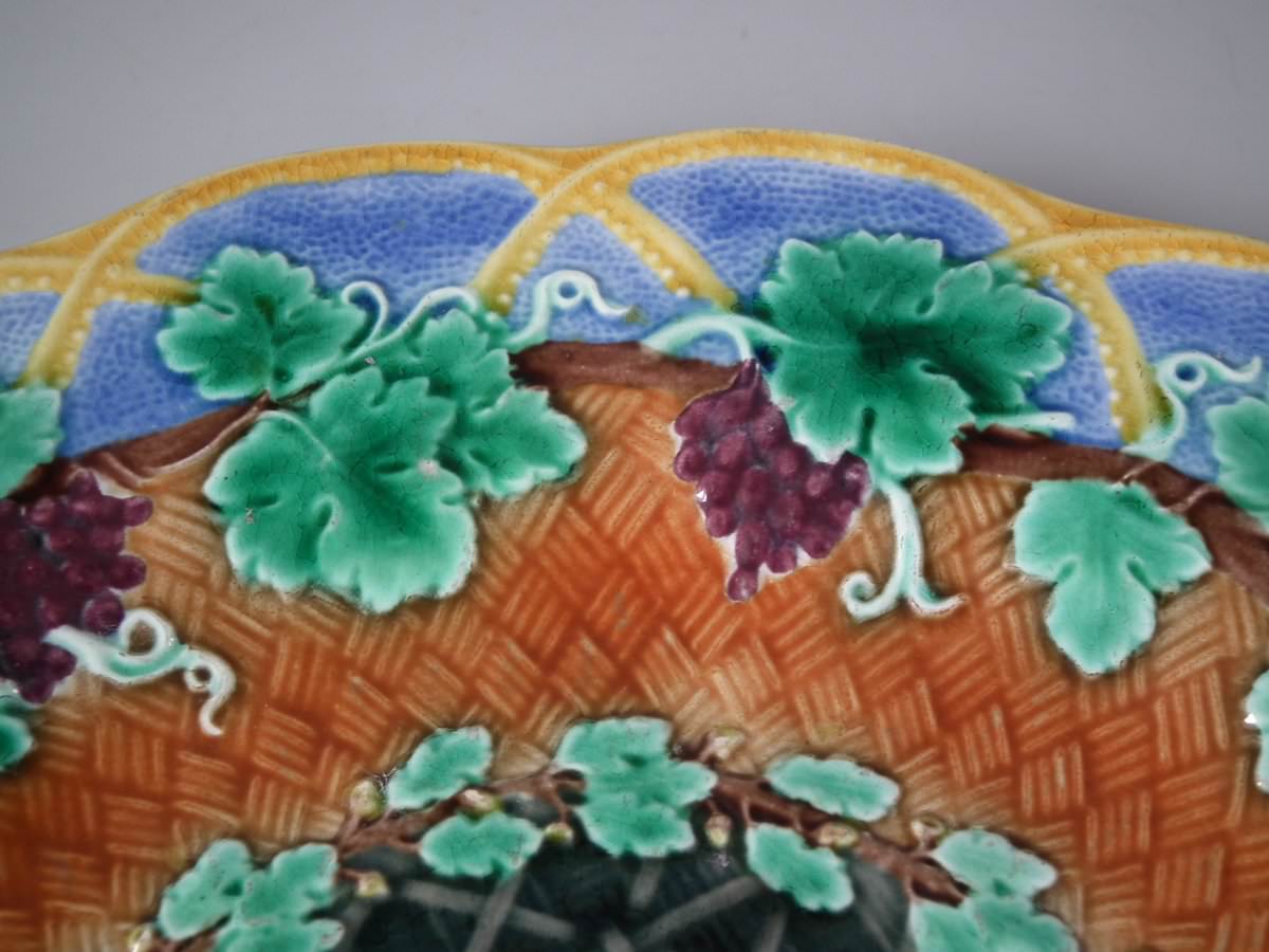 Victorian, circa 1873. 8.9ins high, 8.9ins wide, 0.8ins depth. Wedgwood Majolica plate which features vine leaves and grapes on a basketweave ground.