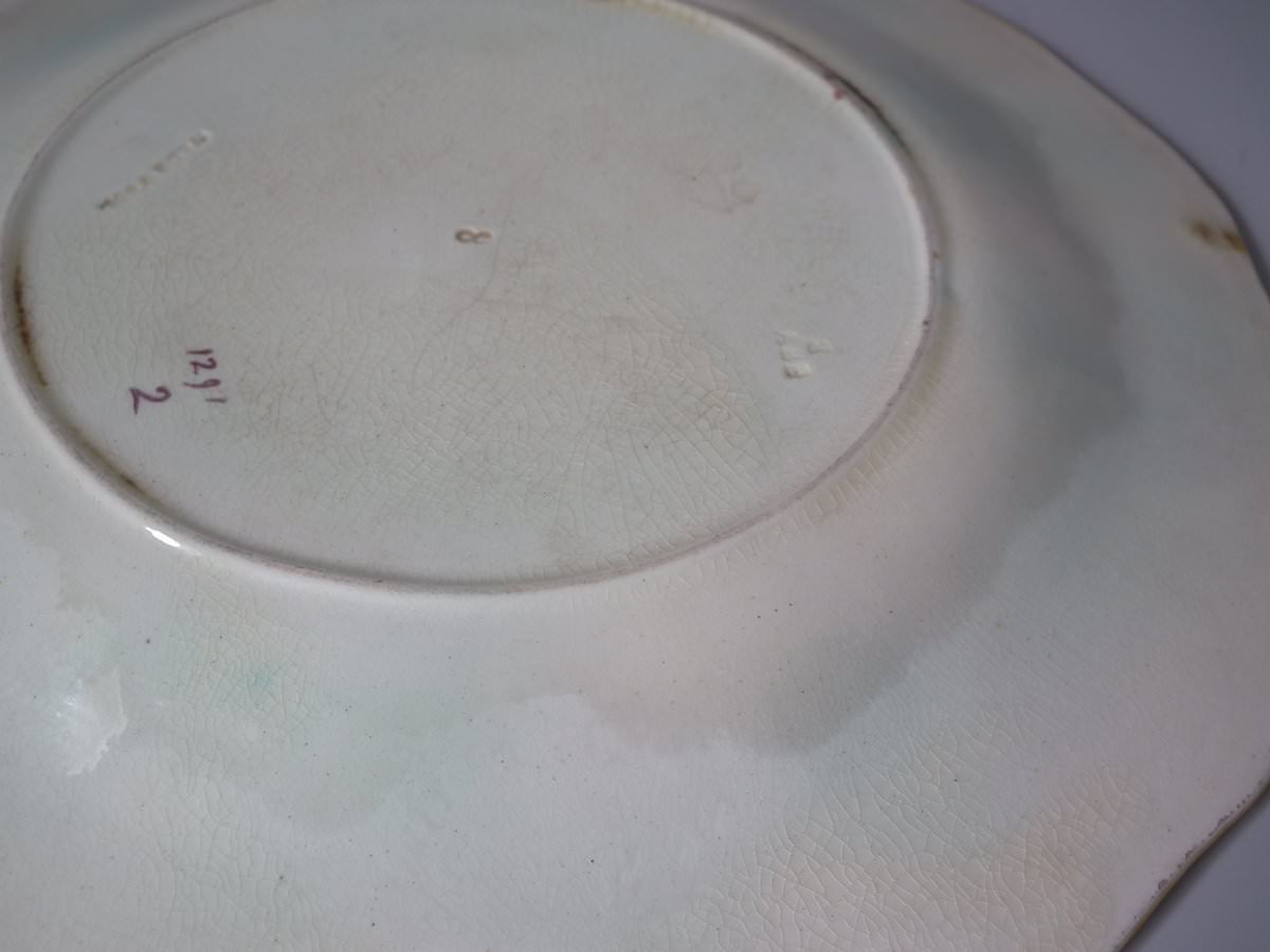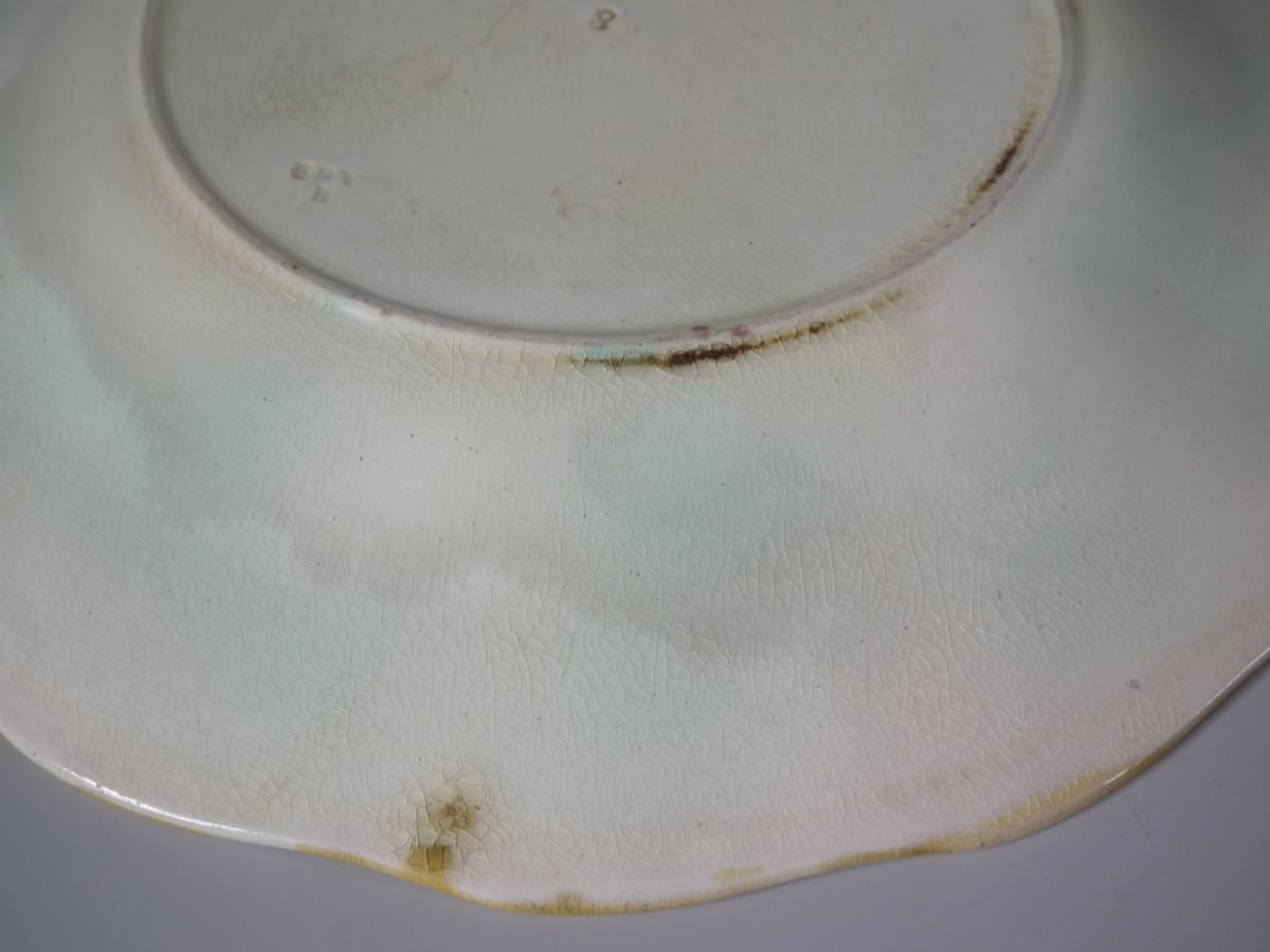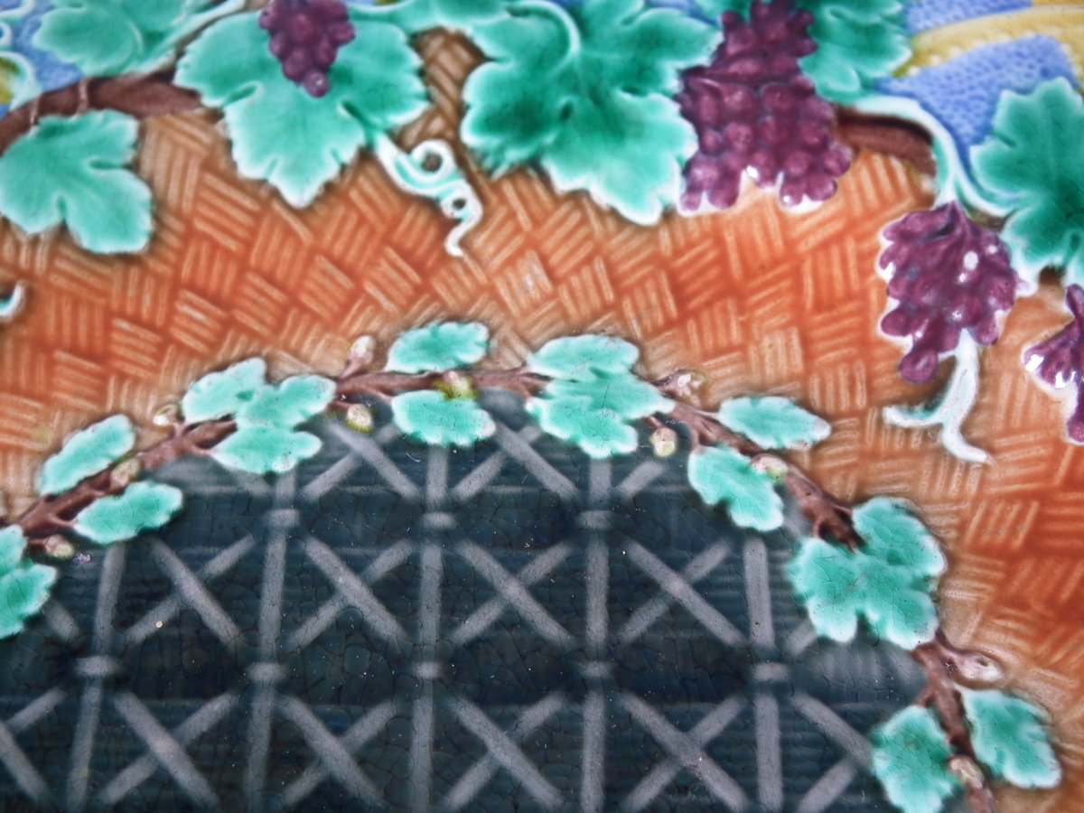 Victorian, circa 1873. 8.9ins high, 8.9ins wide, 0.8ins depth. Wedgwood Majolica plate which features vine leaves and grapes on a basketweave ground.