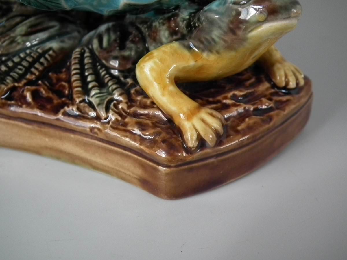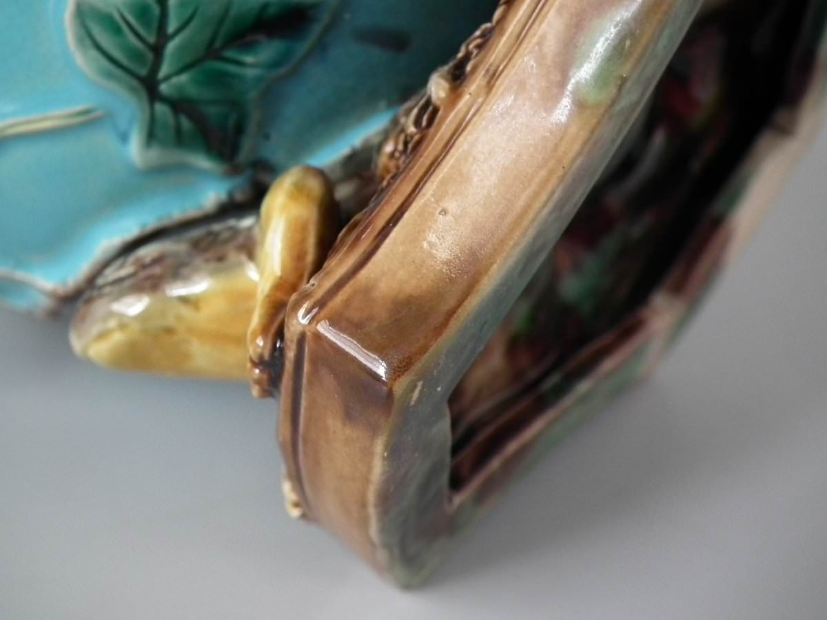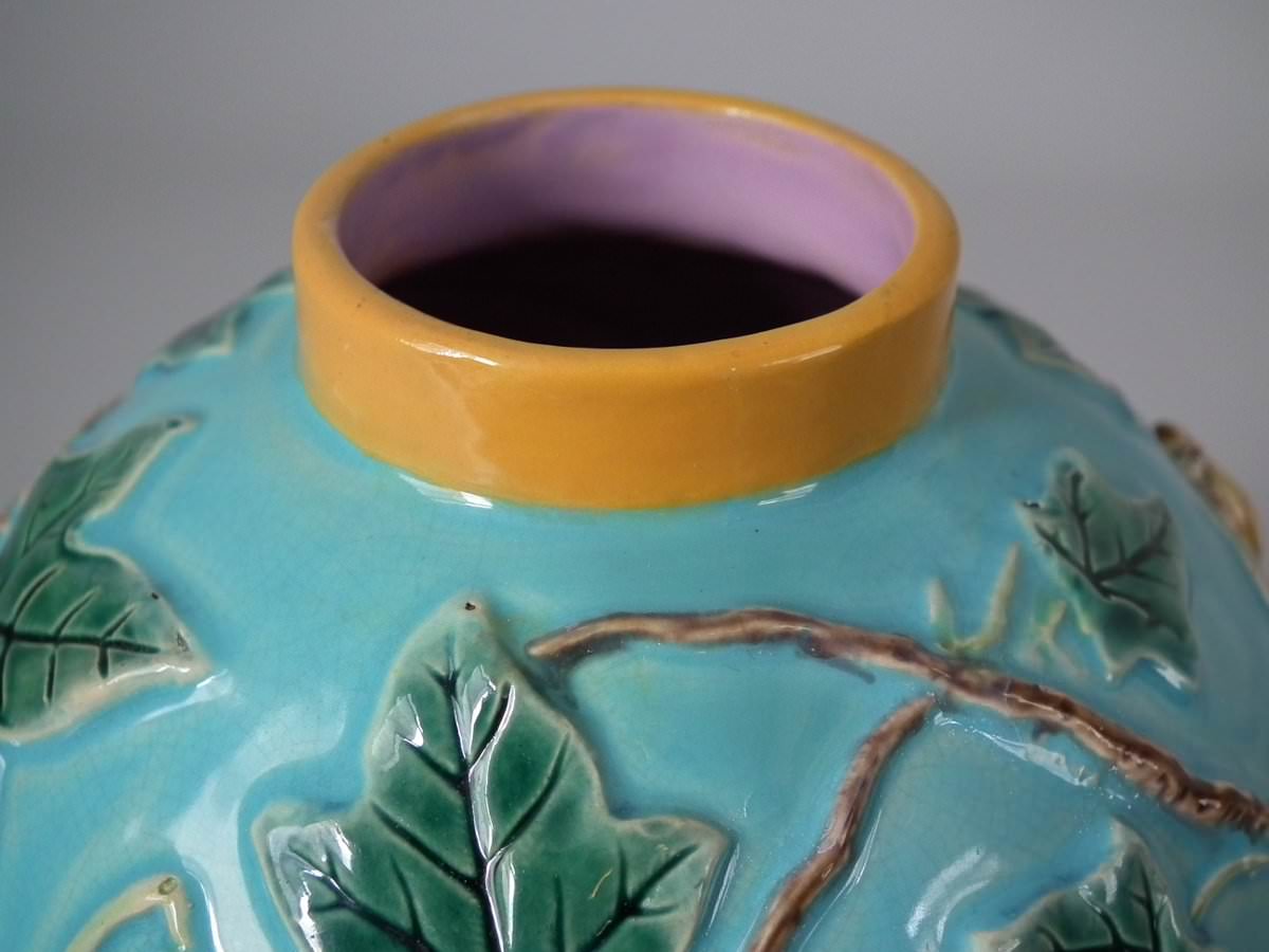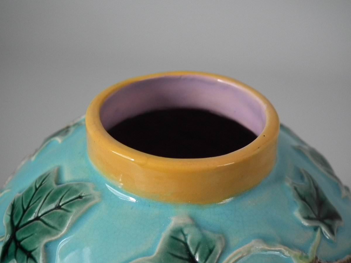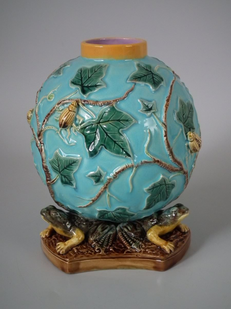 Victorian, circa 1880. 6.7ins high, 4.7ins wide, 4.7ins depth. George Jones Majolica vase which features three frogs supporting a vase covered with ivy and insects.