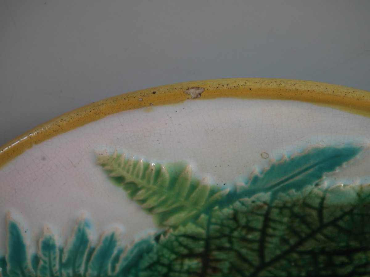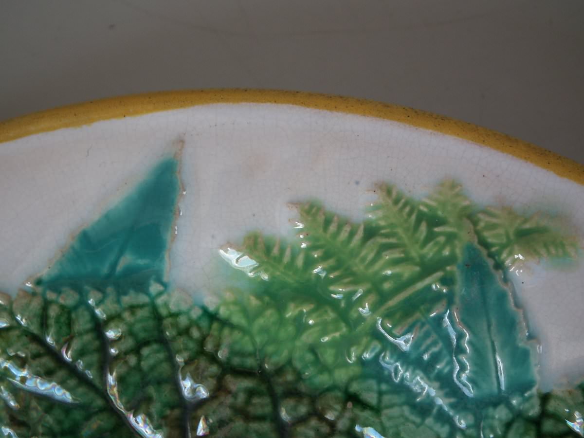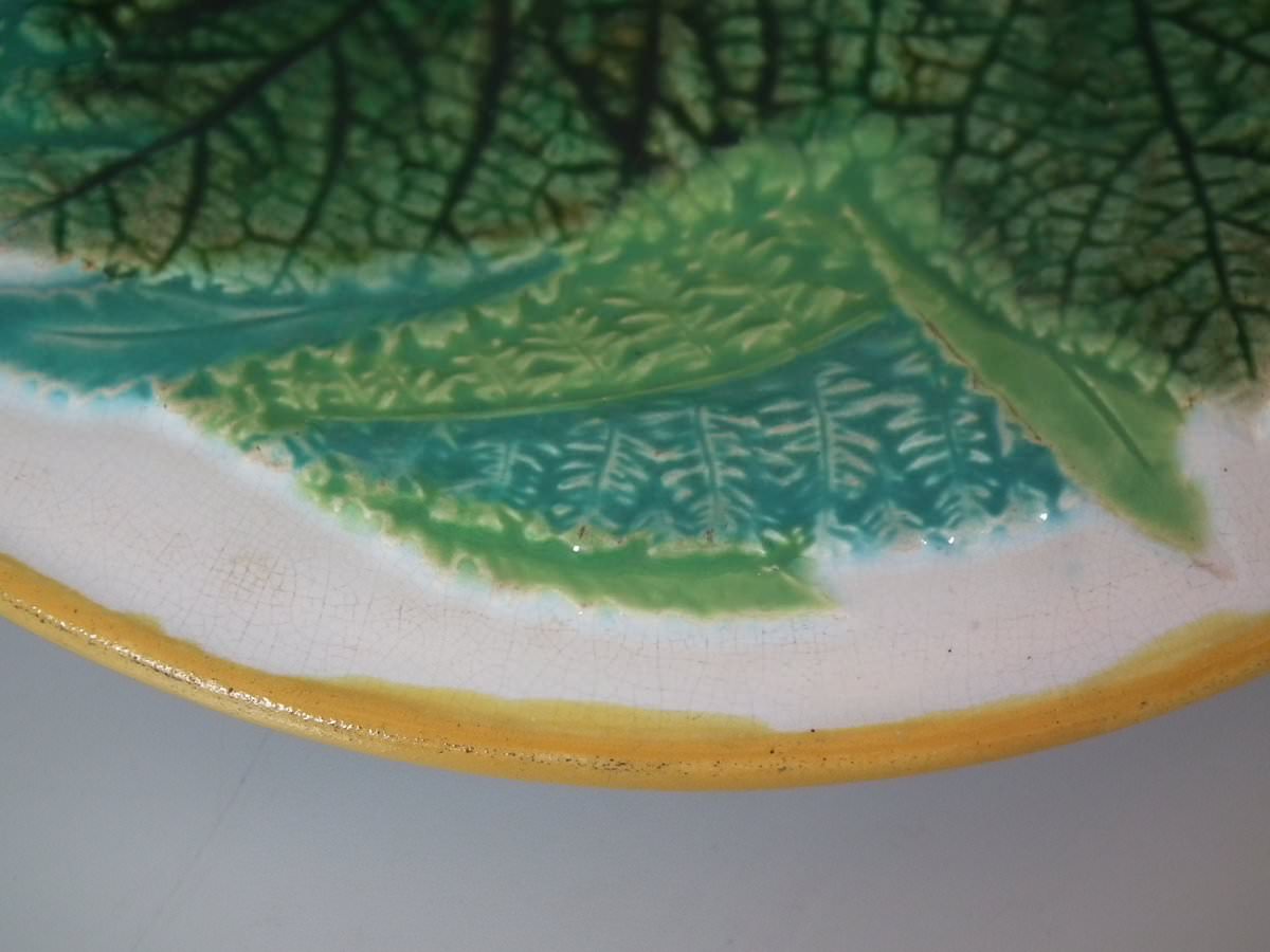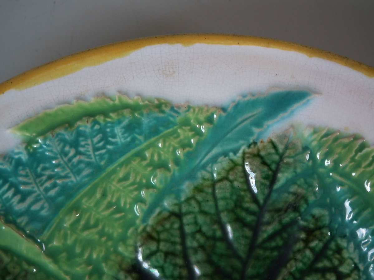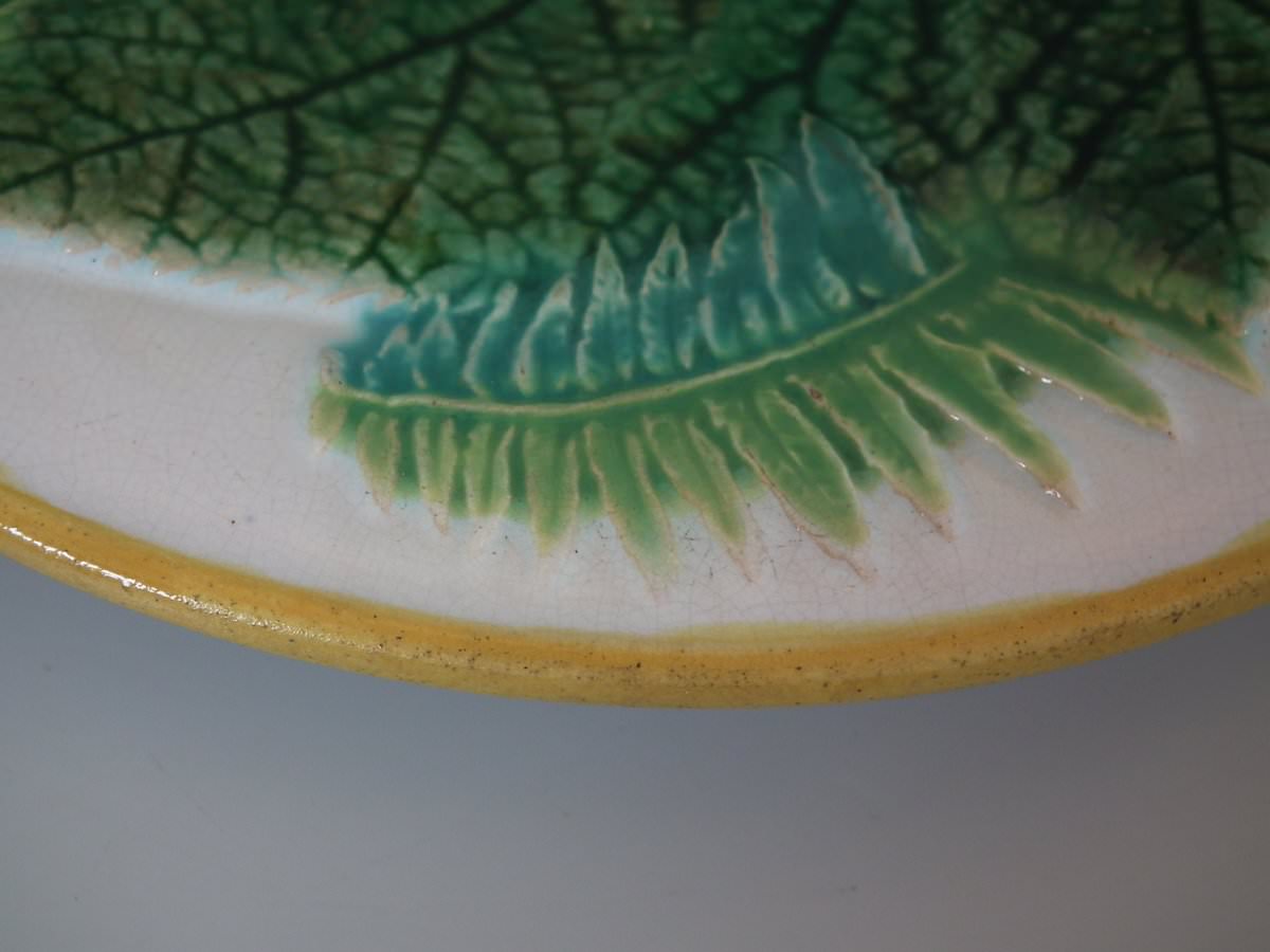 Victorian, circa 1870. 8.3ins high, 8.3ins wide, 1.2ins depth. George Jones Majolica plate which features a maple leaf and fern fronds. White ground version.