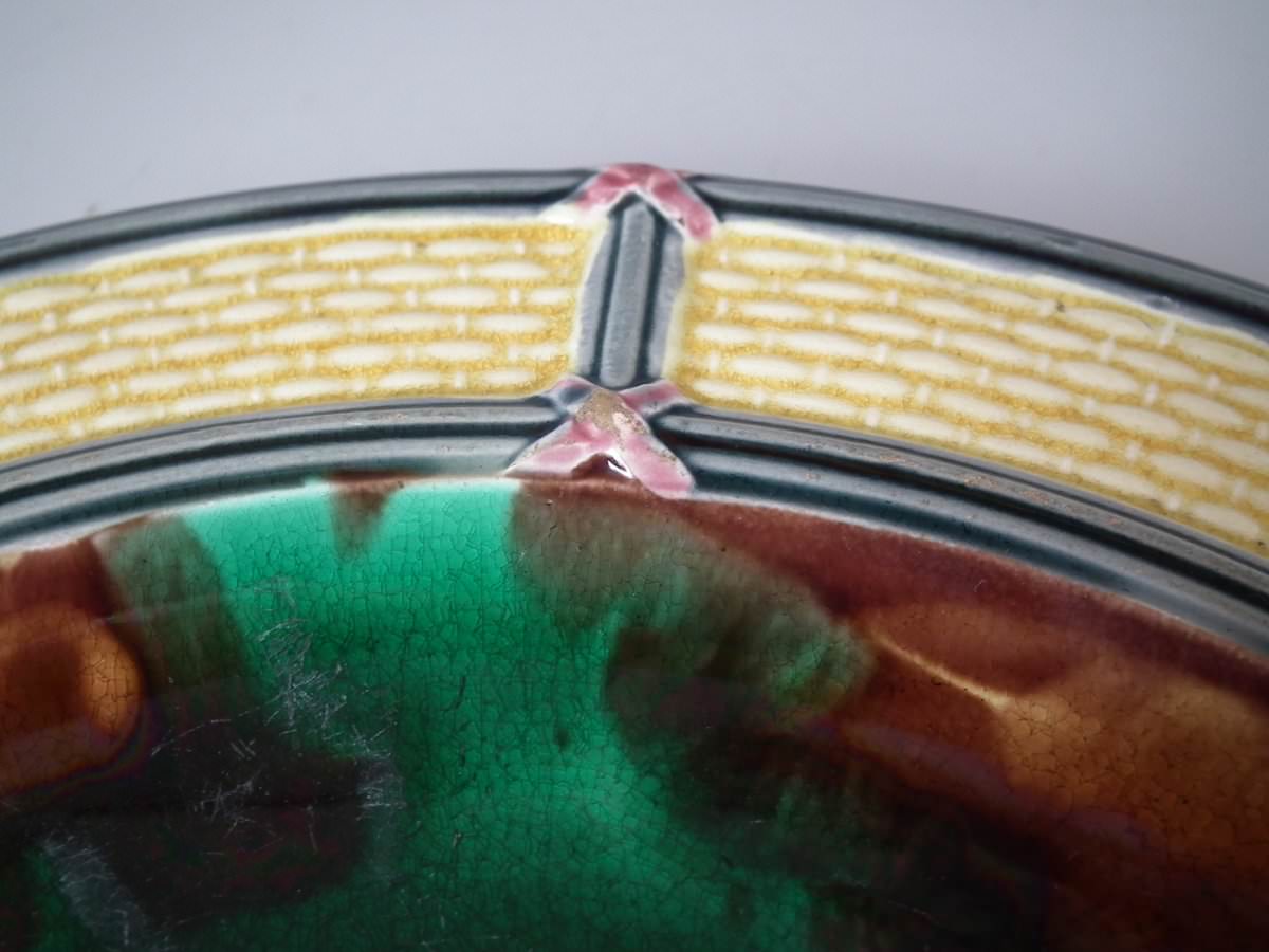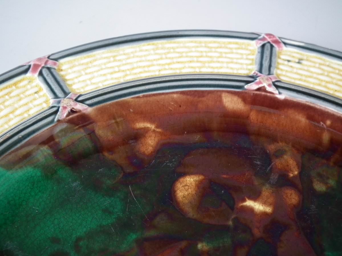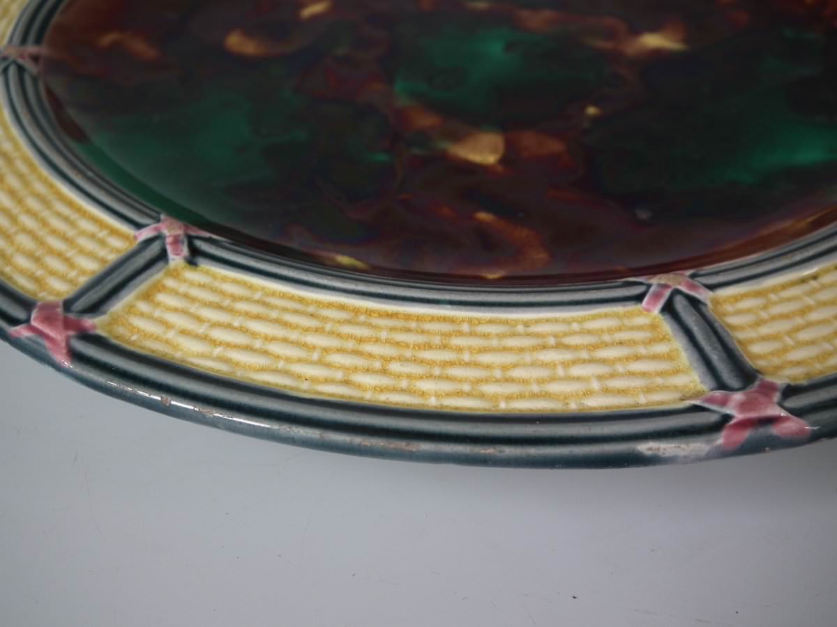 Victorian, circa 1874. 9.3ins high, 9.3ins wide, 0.8ins depth. Wedgwood Majolica plate which features mottled green and brown centre, surrounded by basketweave border.