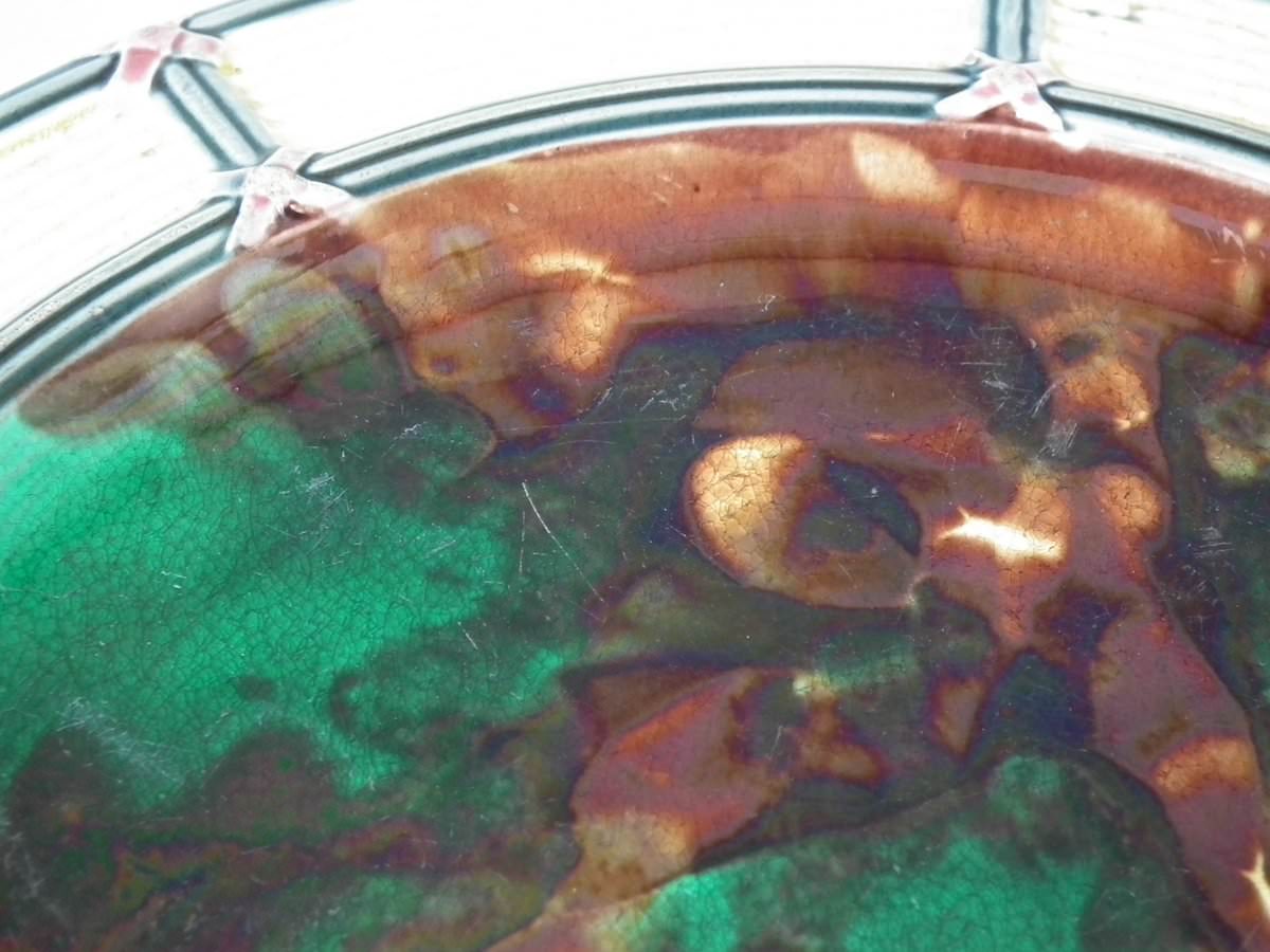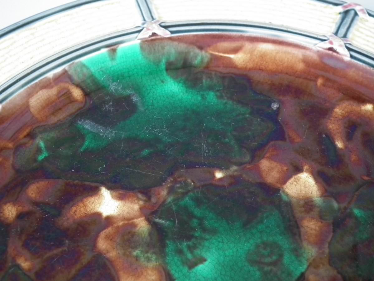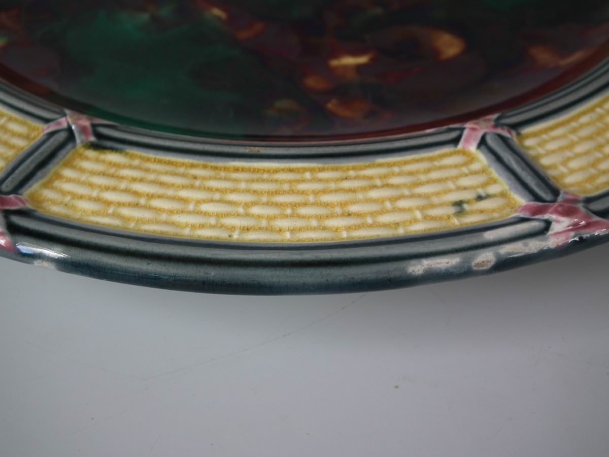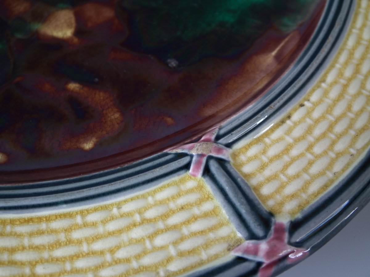 Victorian, circa 1874. 9.3ins high, 9.3ins wide, 0.8ins depth. Wedgwood Majolica plate which features mottled green and brown centre, surrounded by basketweave border.