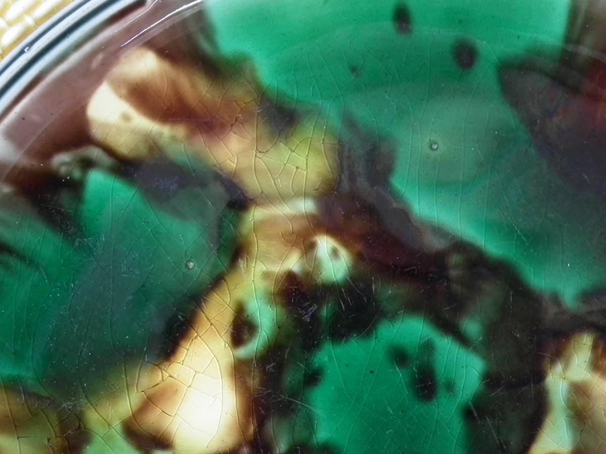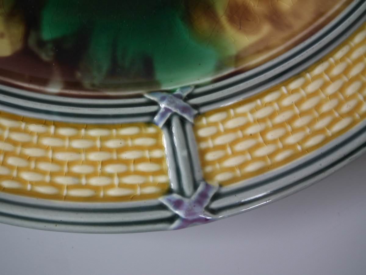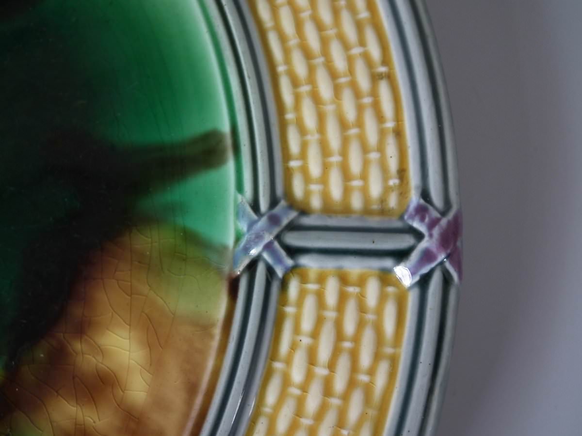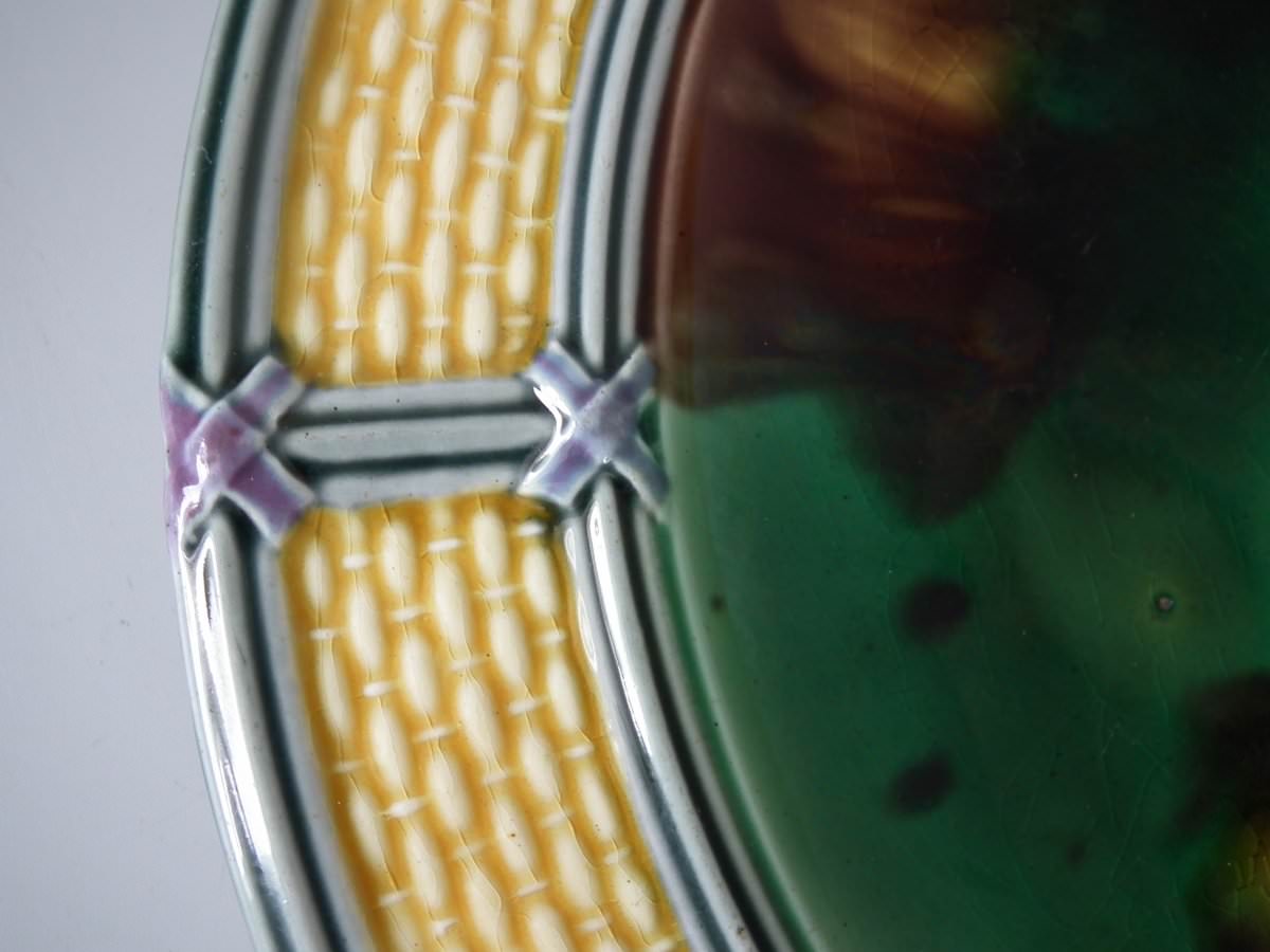 Victorian, circa 1872. 9.1ins high, 9.1ins wide, 0.8ins depth. Wedgwood Majolica plate which features mottled green and brown centre, surrounded by basket weave border.