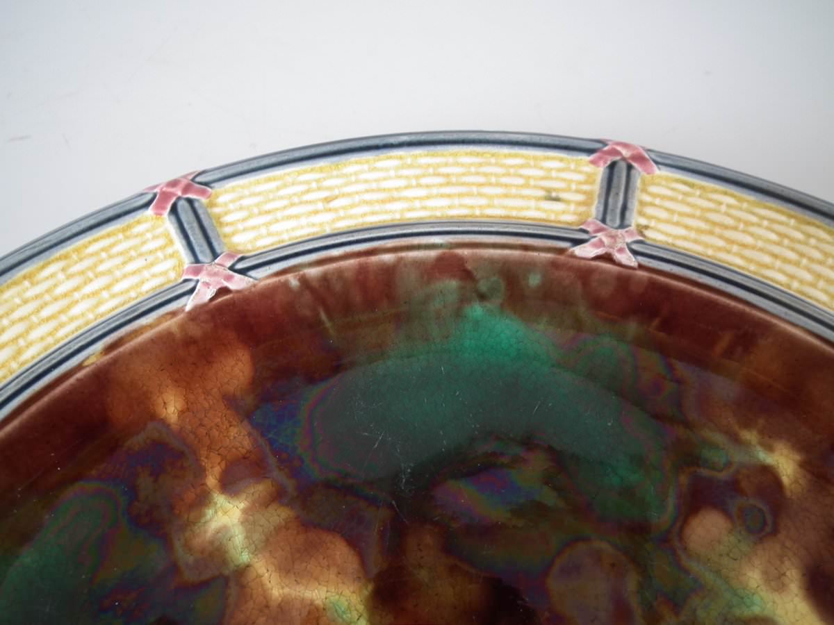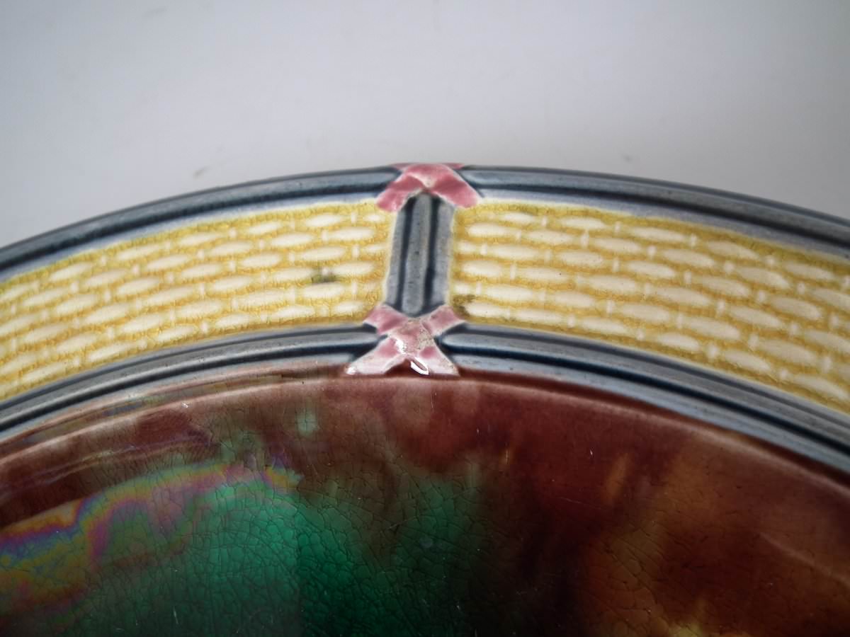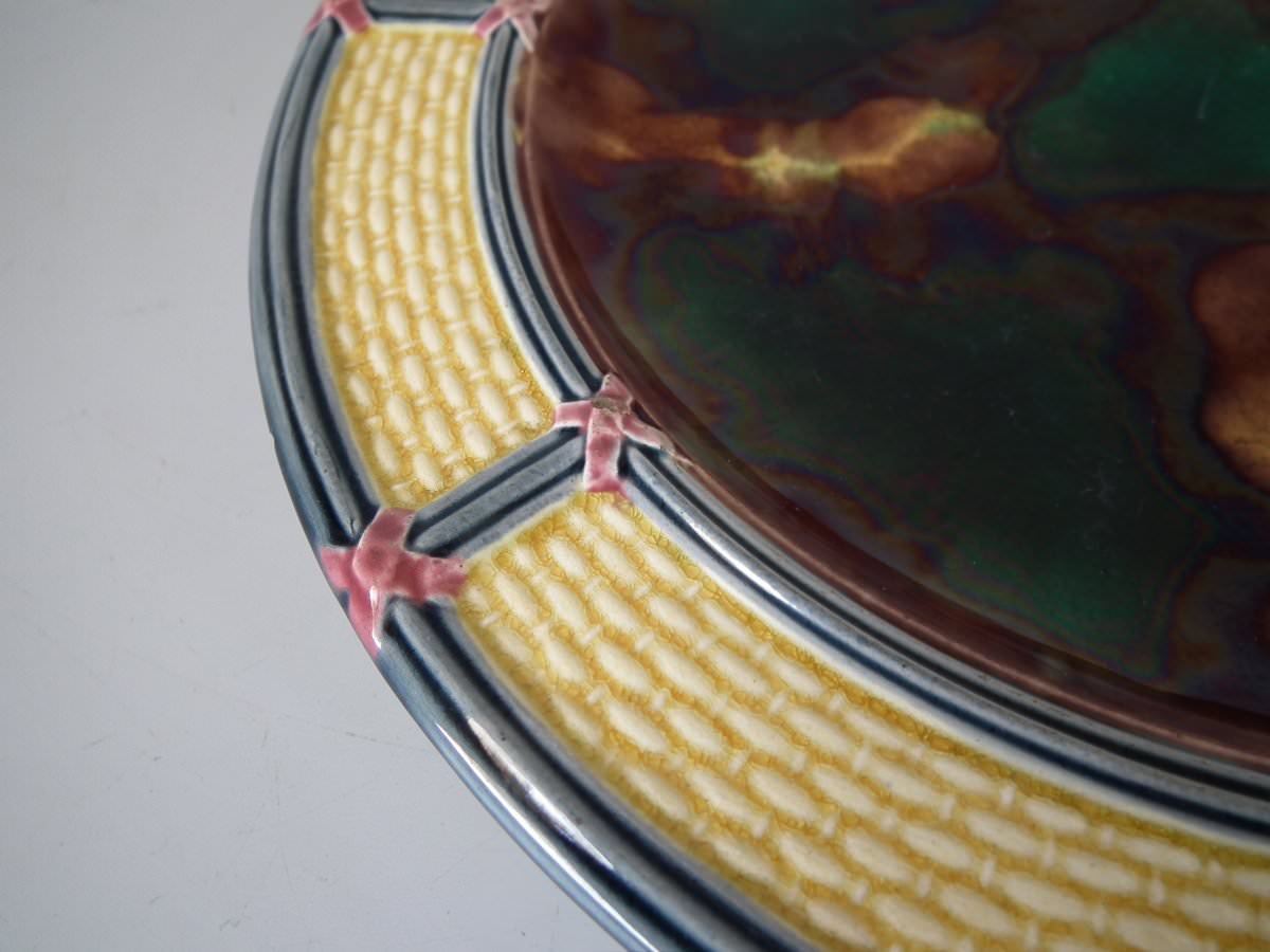 Victorian, circa 1874. 9.3ins high, 9.3ins wide, 0.8ins depth. Wedgwood Majolica plate which features mottled green and brown centre, surrounded by basket weave border.