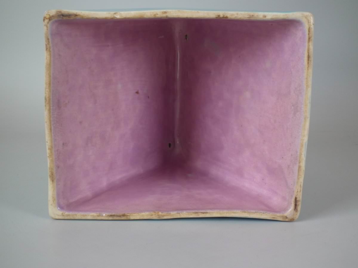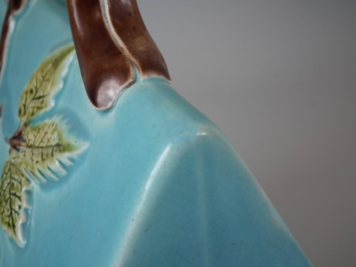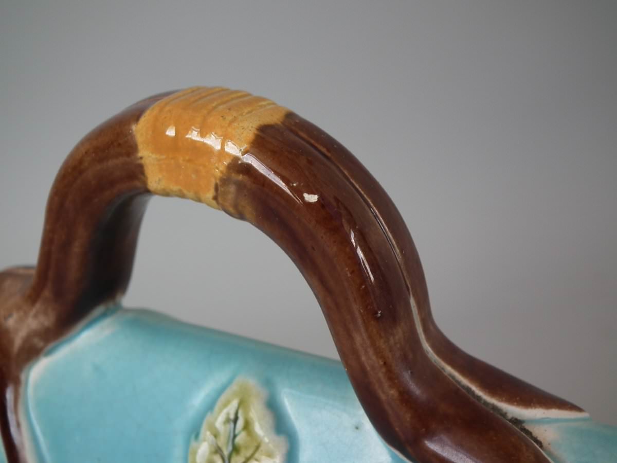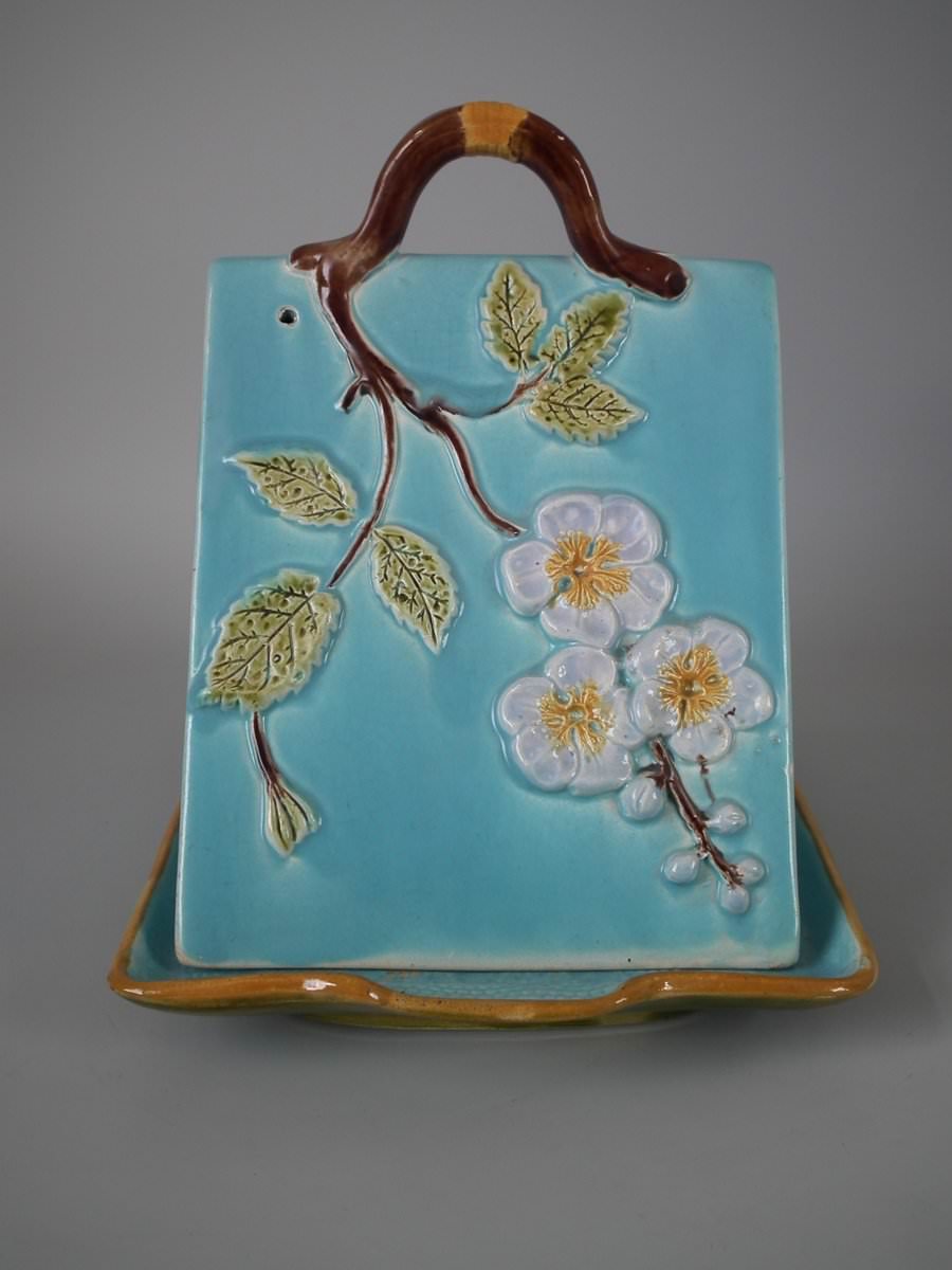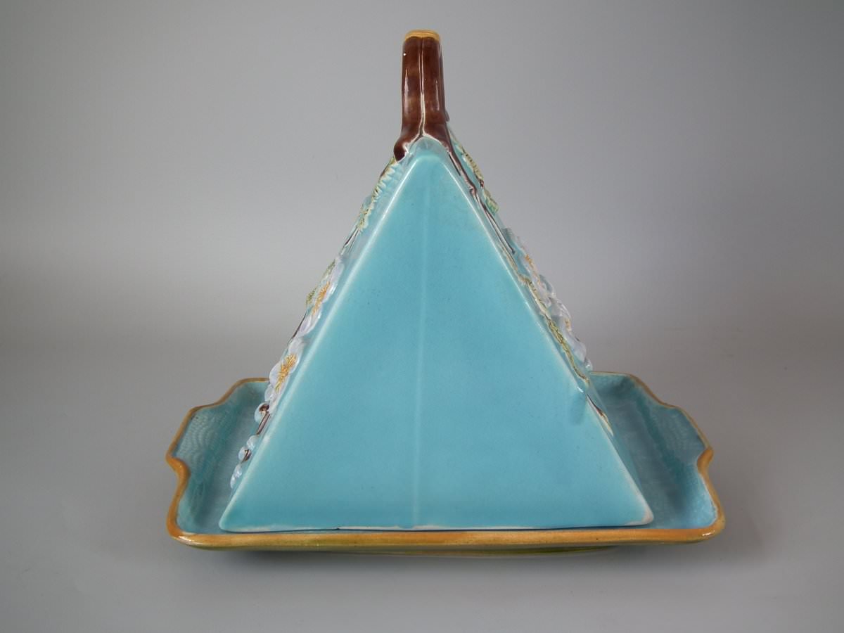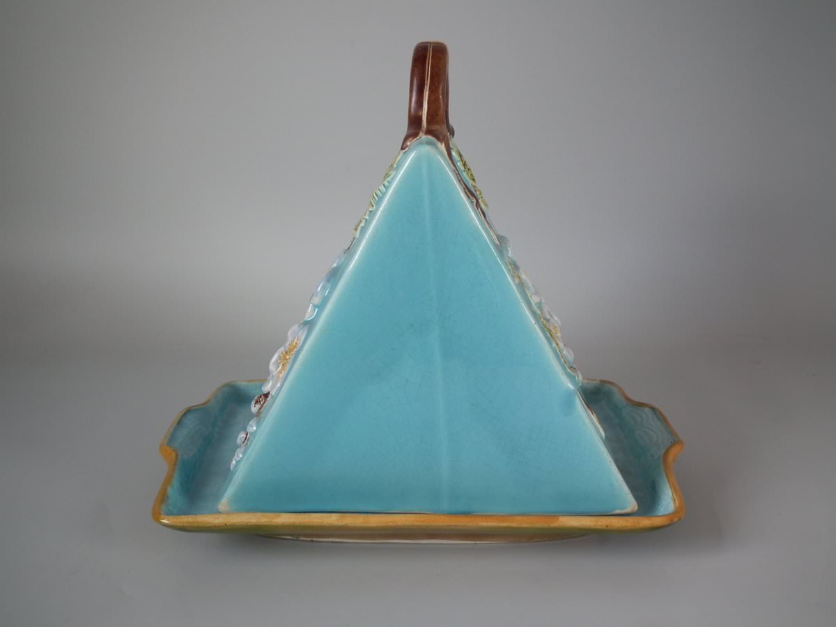 Victorian, circa 1870. 9.4ins high, 11ins wide, 7.9ins depth. Holdcroft Majolica cheese keep which features an unusual wedge-shaped form, a branch handle and blossom to the sides.