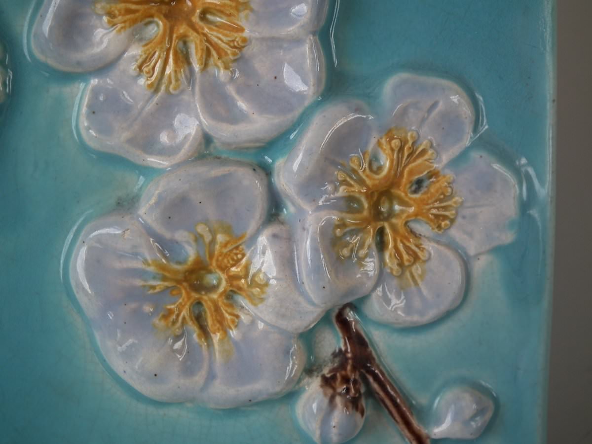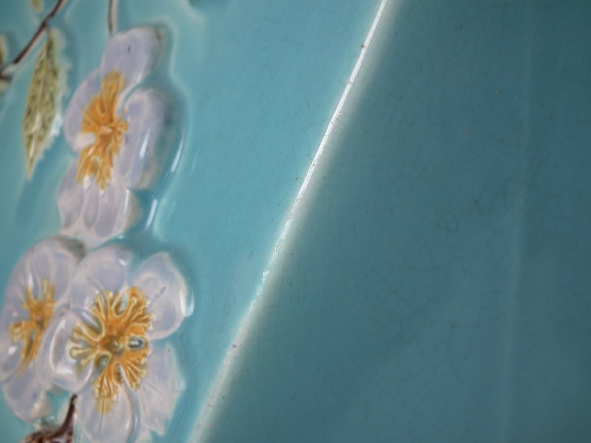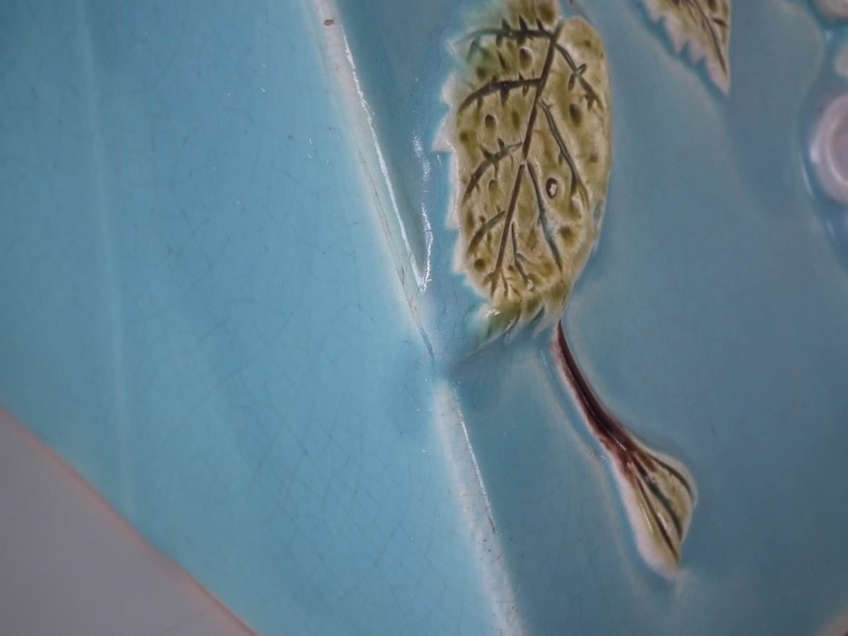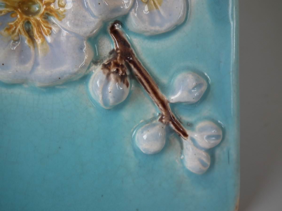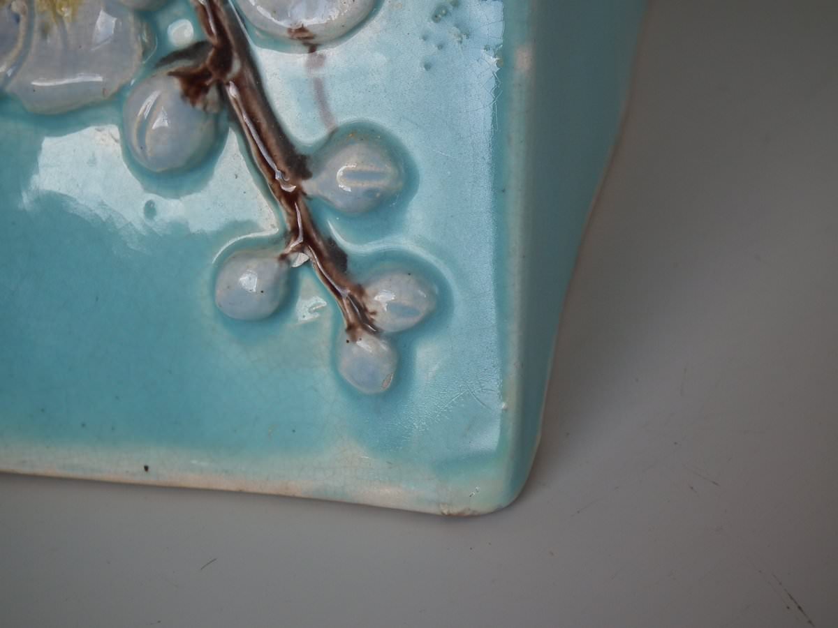 Victorian, circa 1870. 9.4ins high, 11ins wide, 7.9ins depth. Holdcroft Majolica cheese keep which features an unusual wedge-shaped form, a branch handle and blossom to the sides.