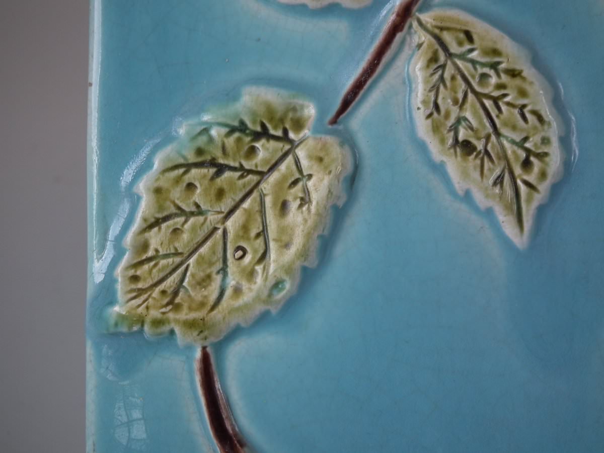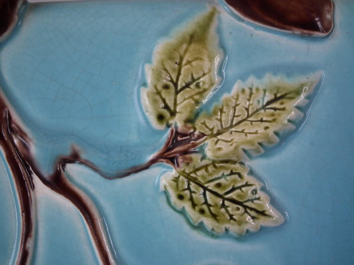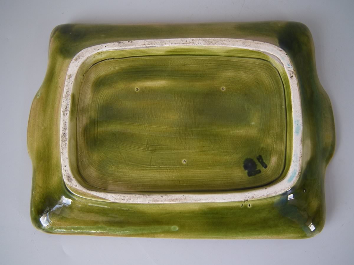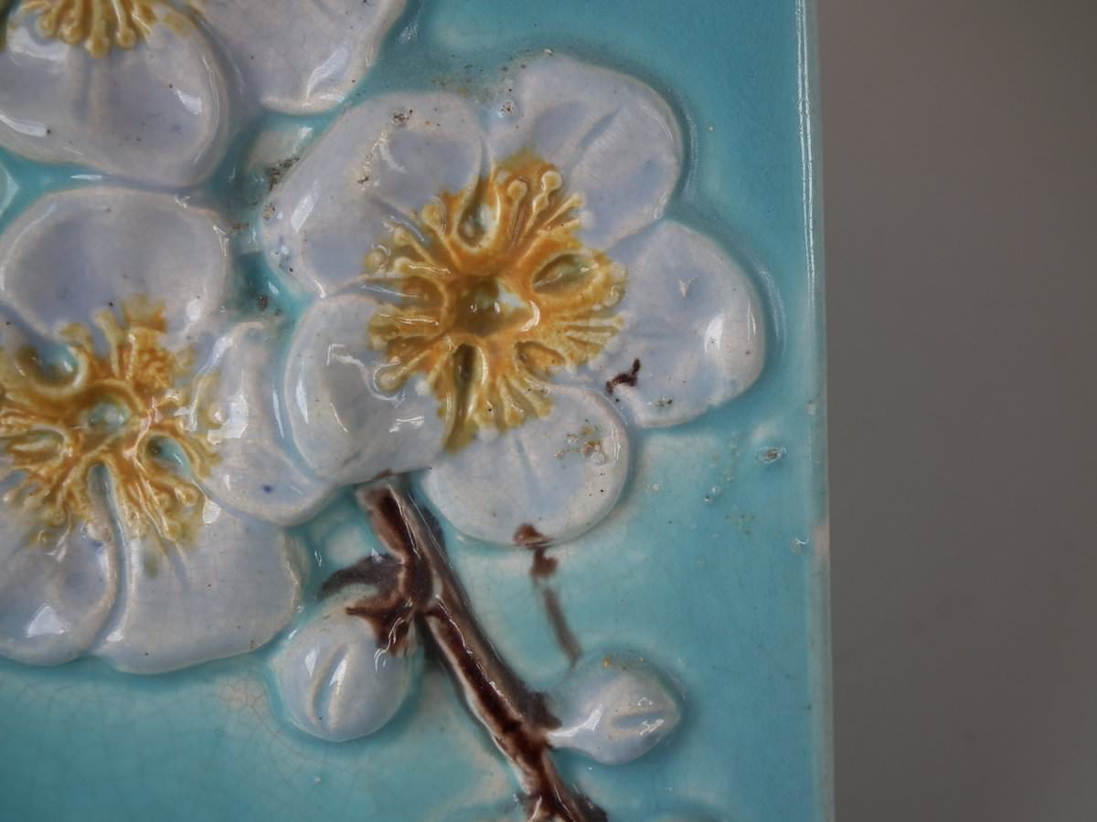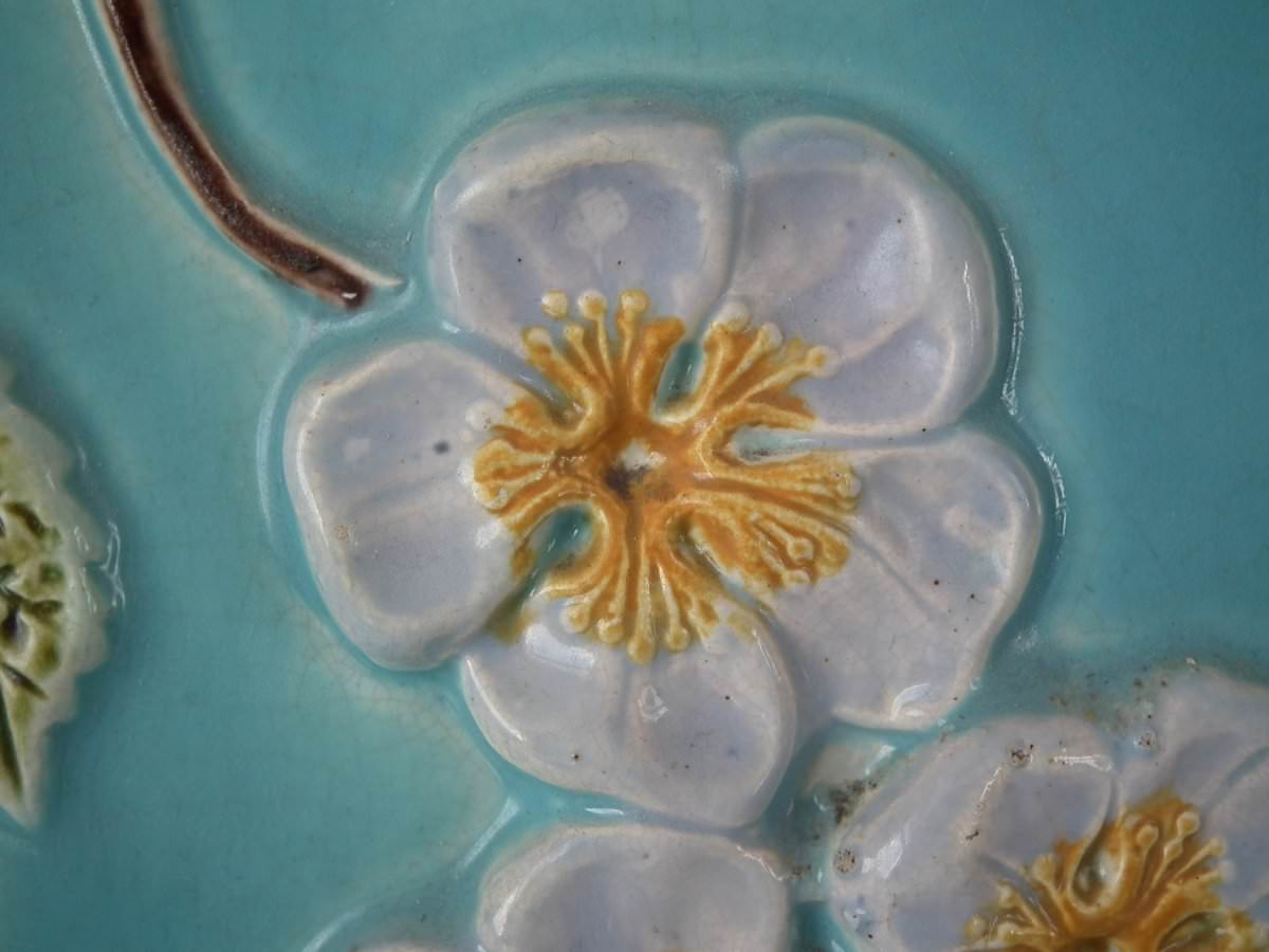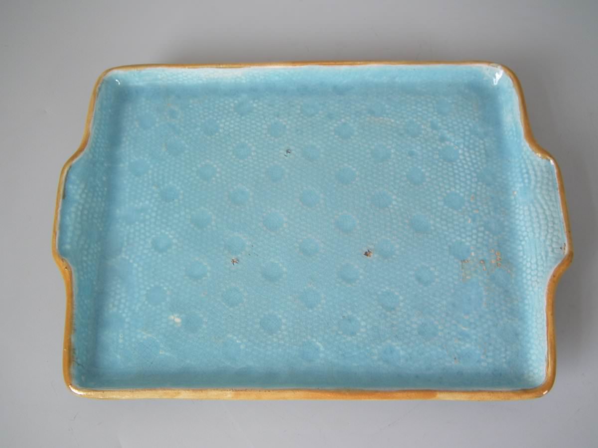 Victorian, circa 1870. 9.4ins high, 11ins wide, 7.9ins depth. Holdcroft Majolica cheese keep which features an unusual wedge-shaped form, a branch handle and blossom to the sides.