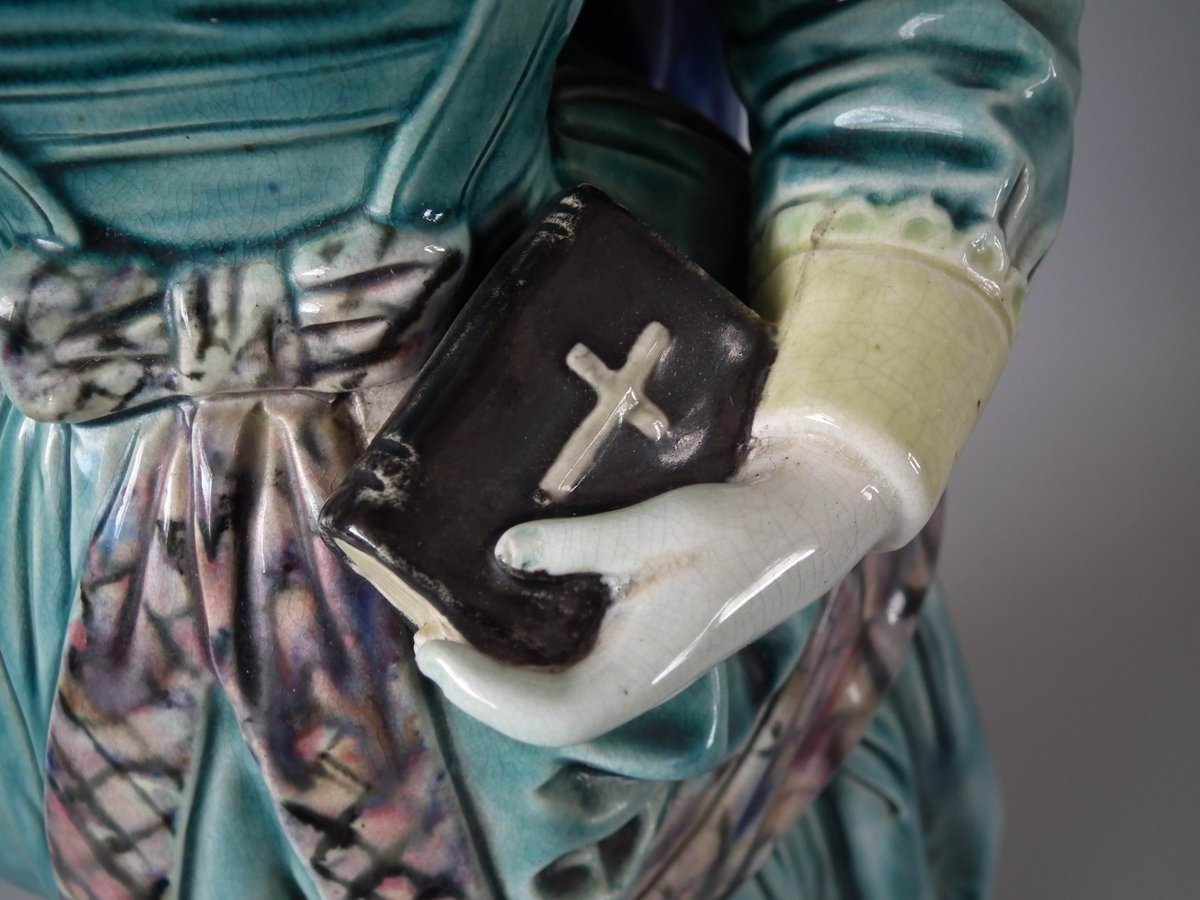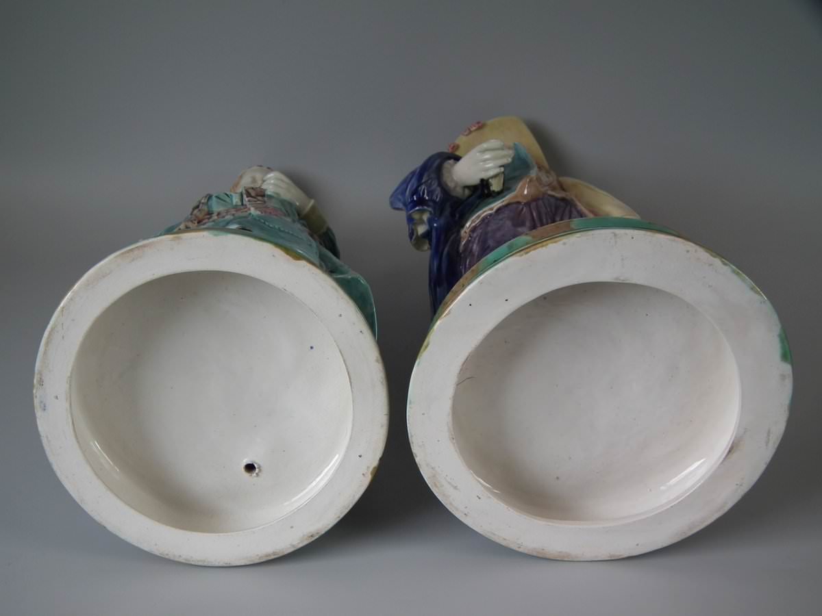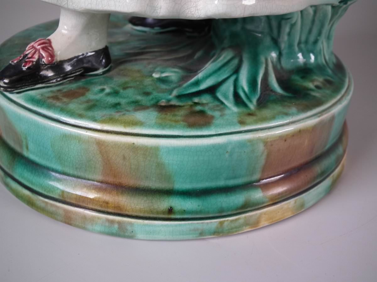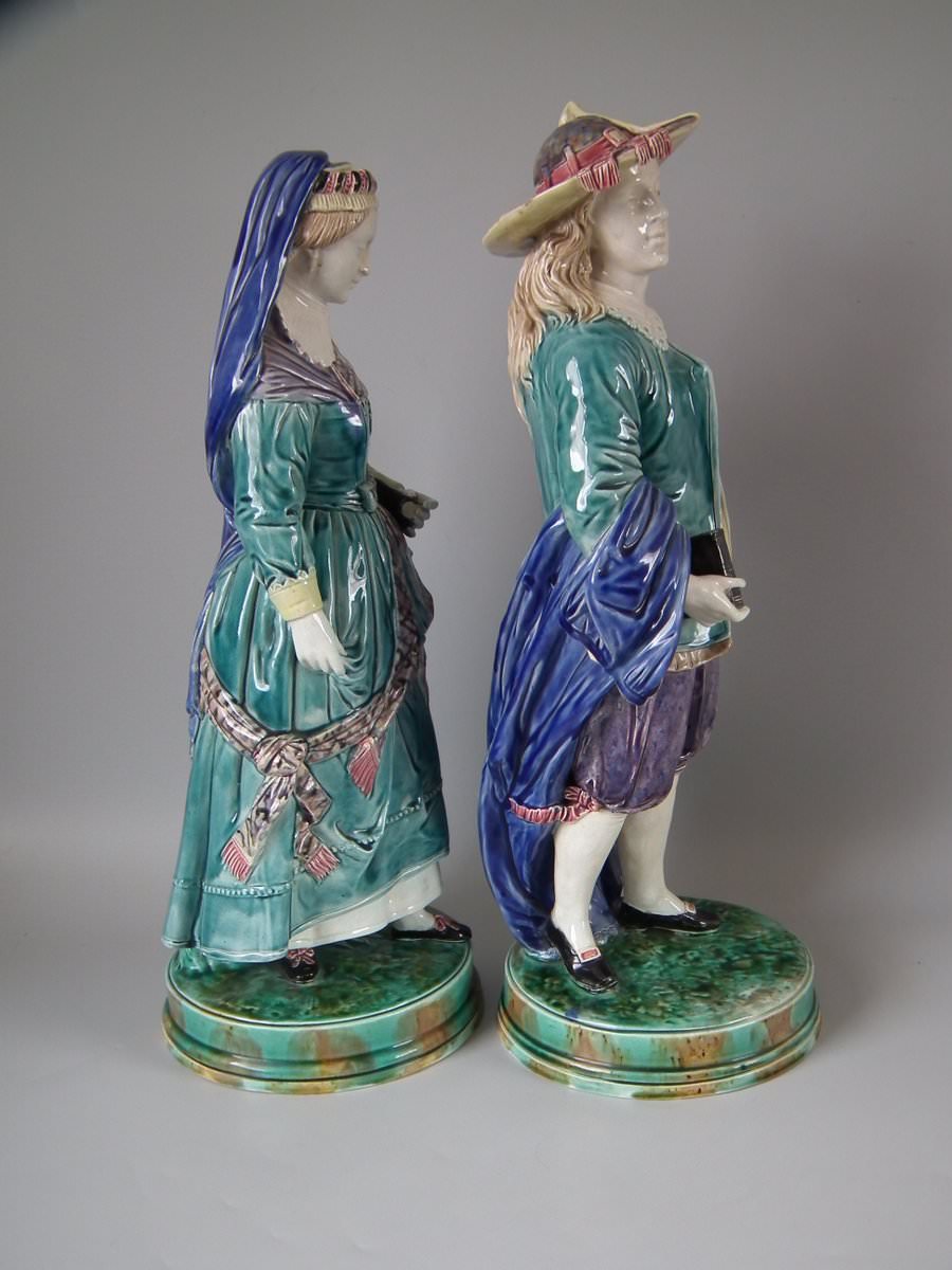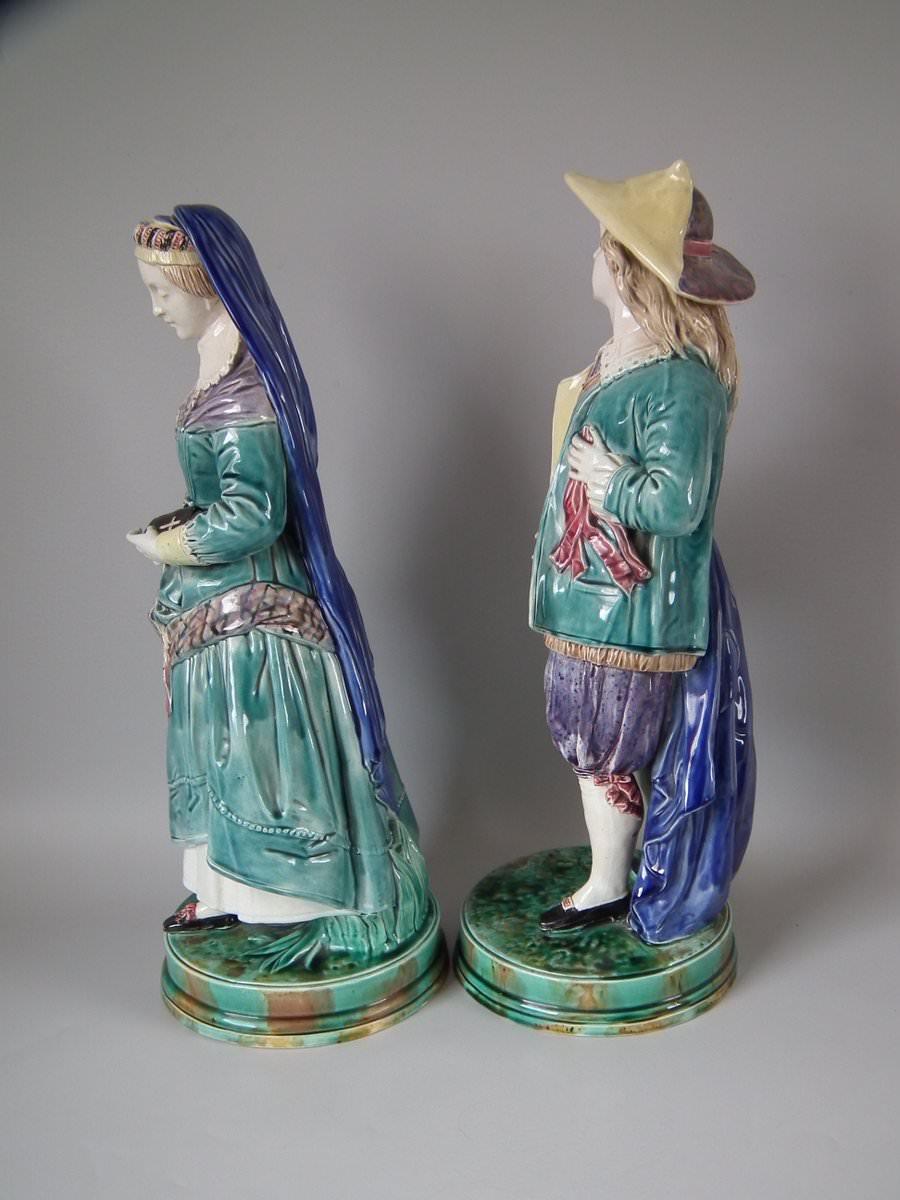Circa 1880. Tallest is 19.7ins high, 7.5ins wide, 7.9ins depth. Pair of Majolica figures which feature a lady and gentlemen, she carrying a bible.