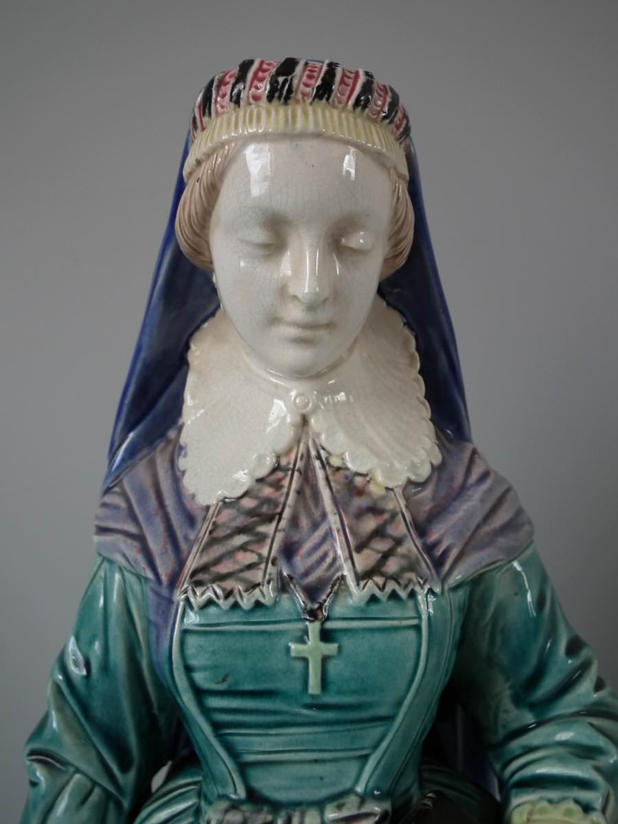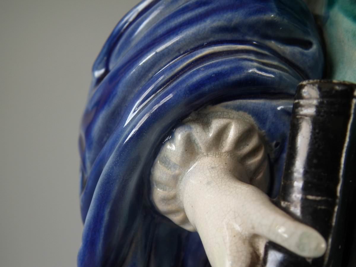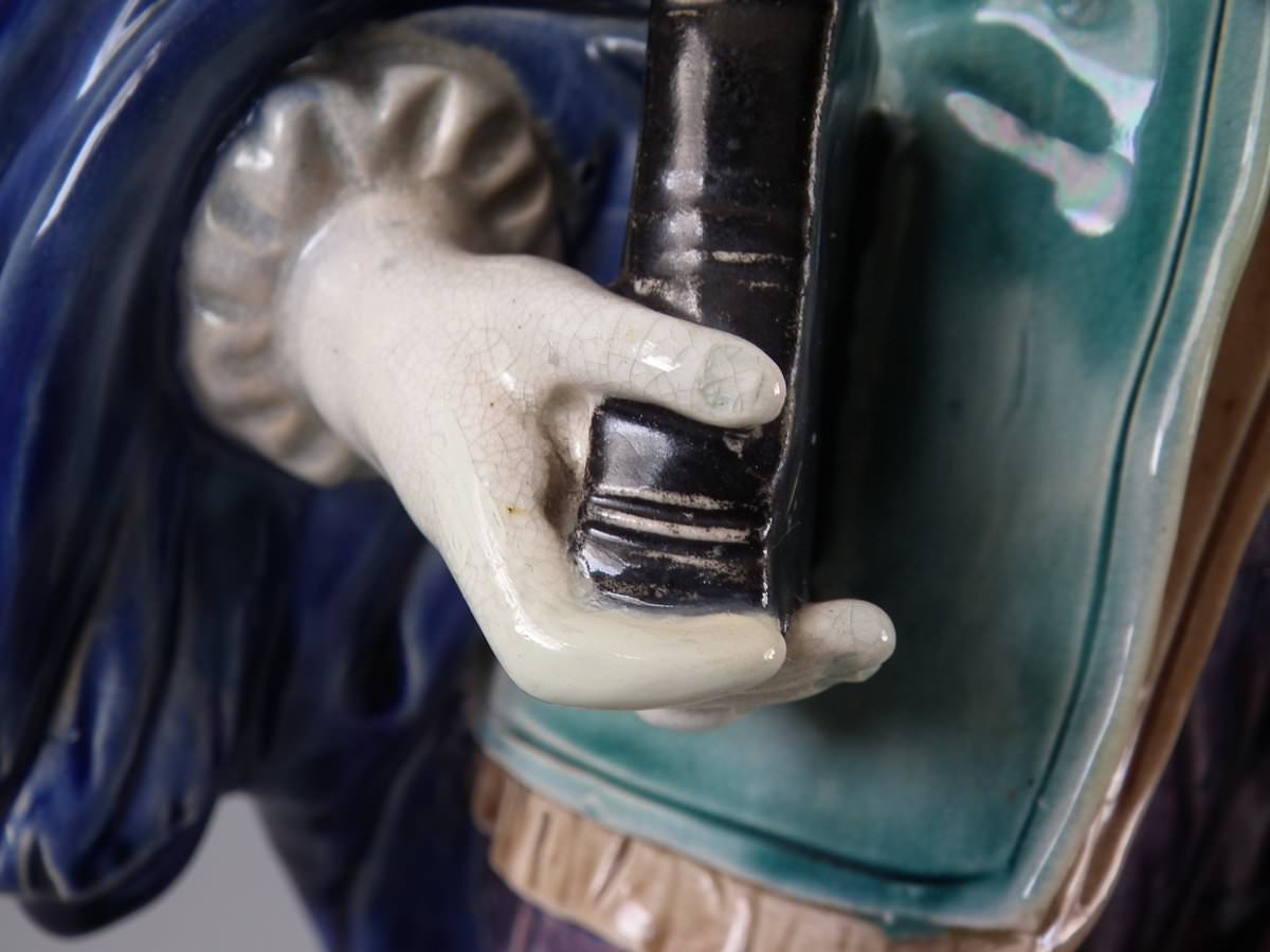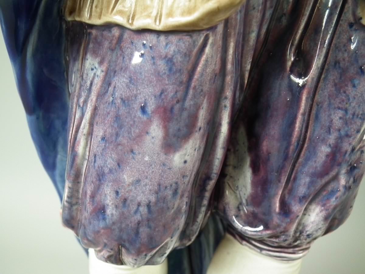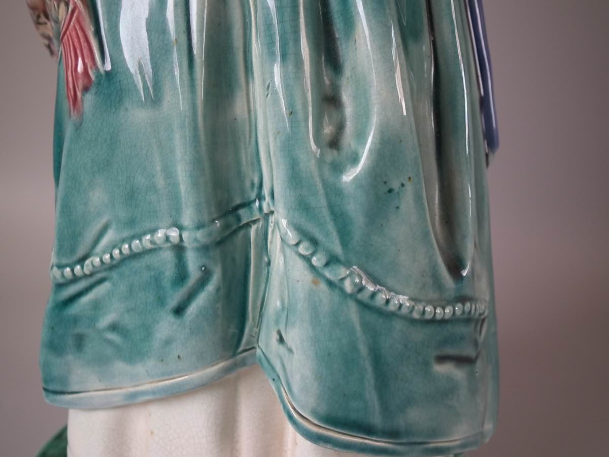 Circa 1880. Tallest is 19.7ins high, 7.5ins wide, 7.9ins depth. Pair of Majolica figures which feature a lady and gentlemen, she carrying a bible.