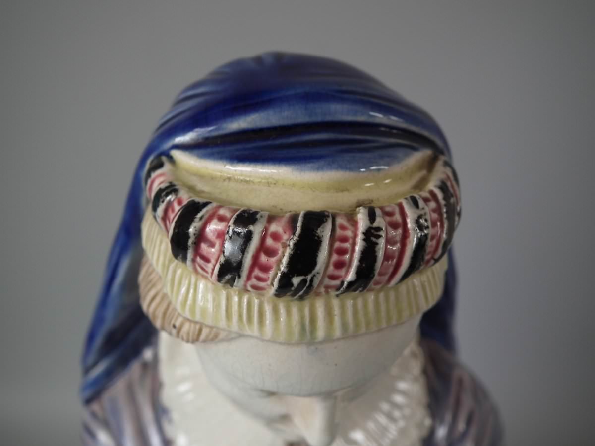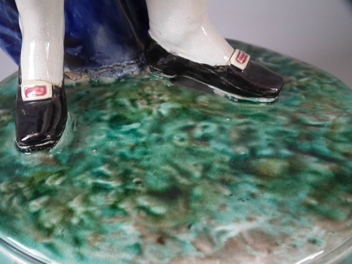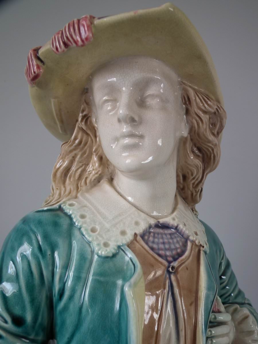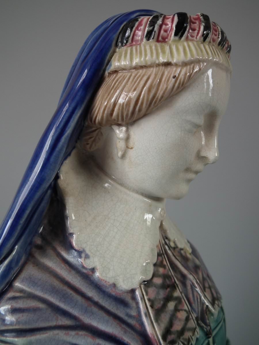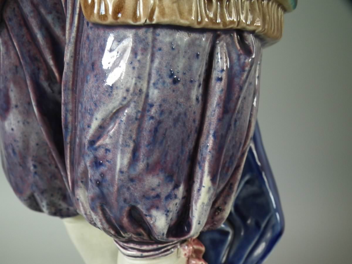 Circa 1880. Tallest is 19.7ins high, 7.5ins wide, 7.9ins depth. Pair of Majolica figures which feature a lady and gentlemen, she carrying a bible.