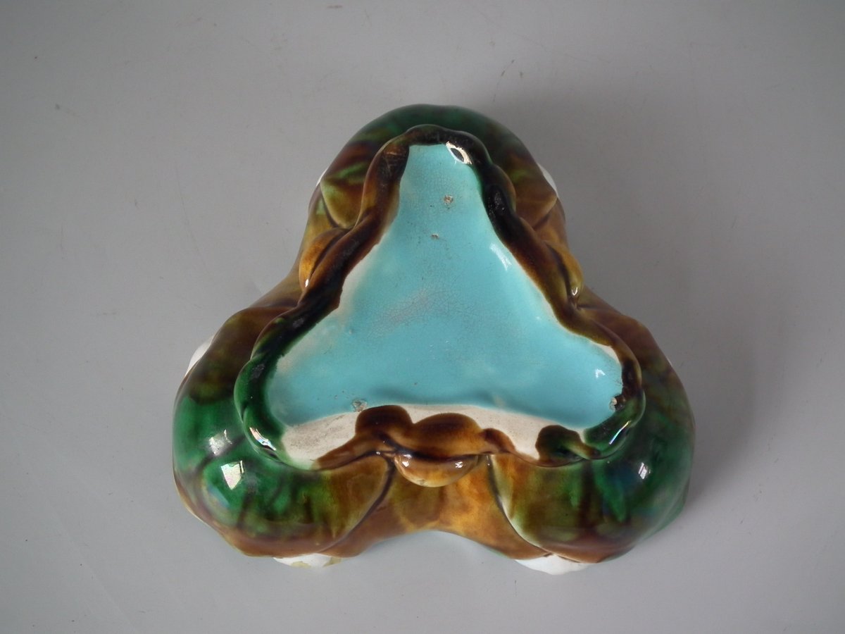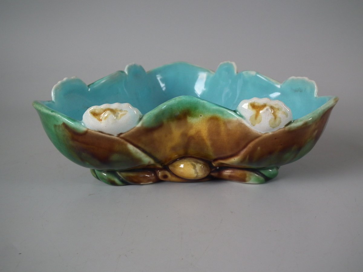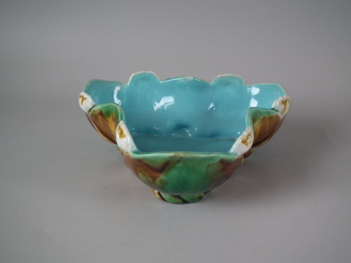 Victorian, circa 1880. 2.4ins high, 6.7ins wide, 6.7ins depth. English Majolica bowl which features lilies.