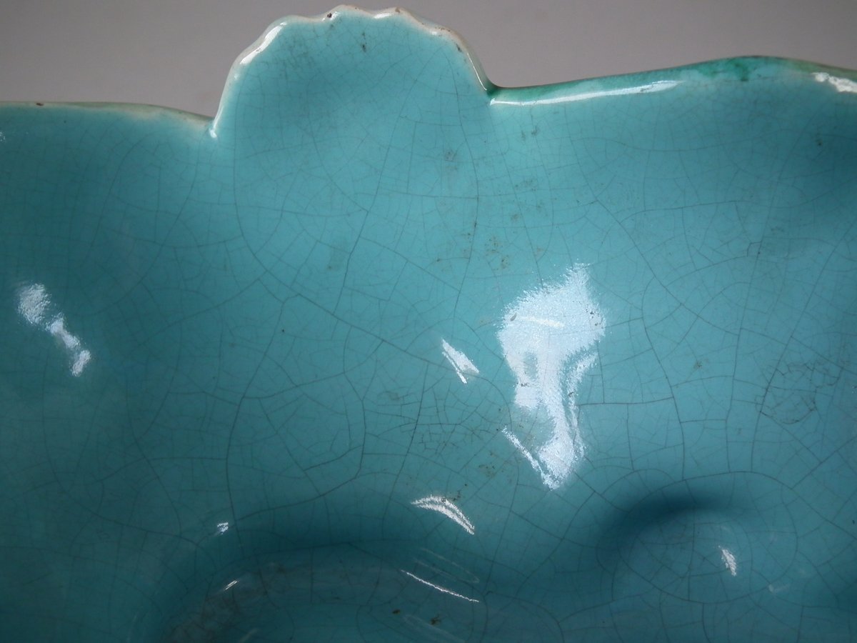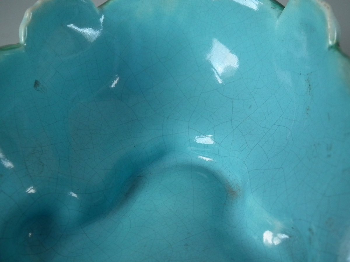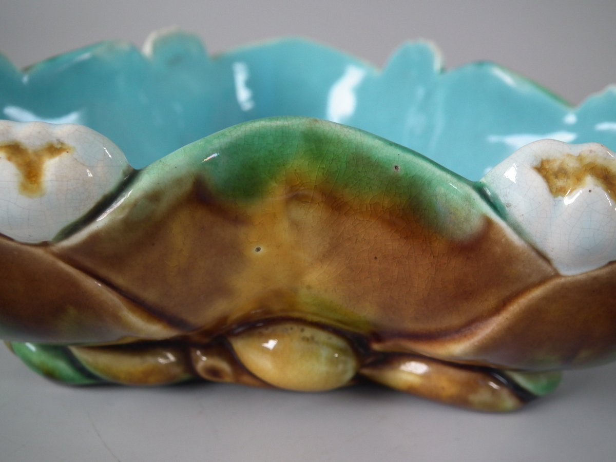Victorian, circa 1880. 2.4ins high, 6.7ins wide, 6.7ins depth. English Majolica bowl which features lilies.