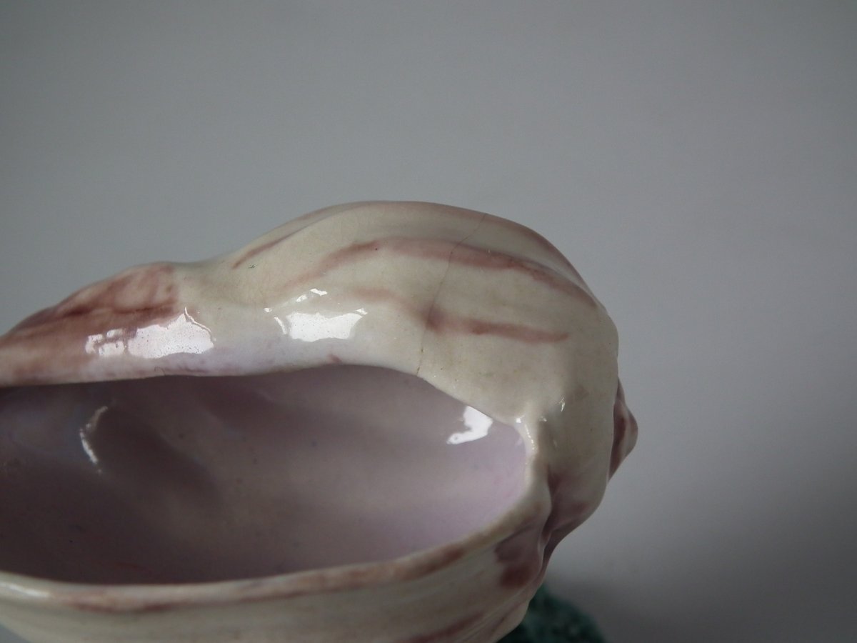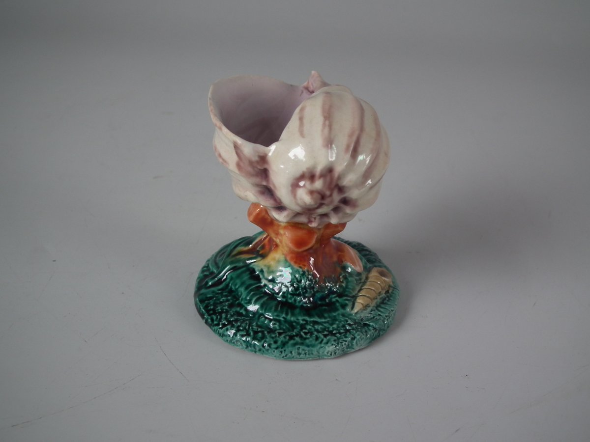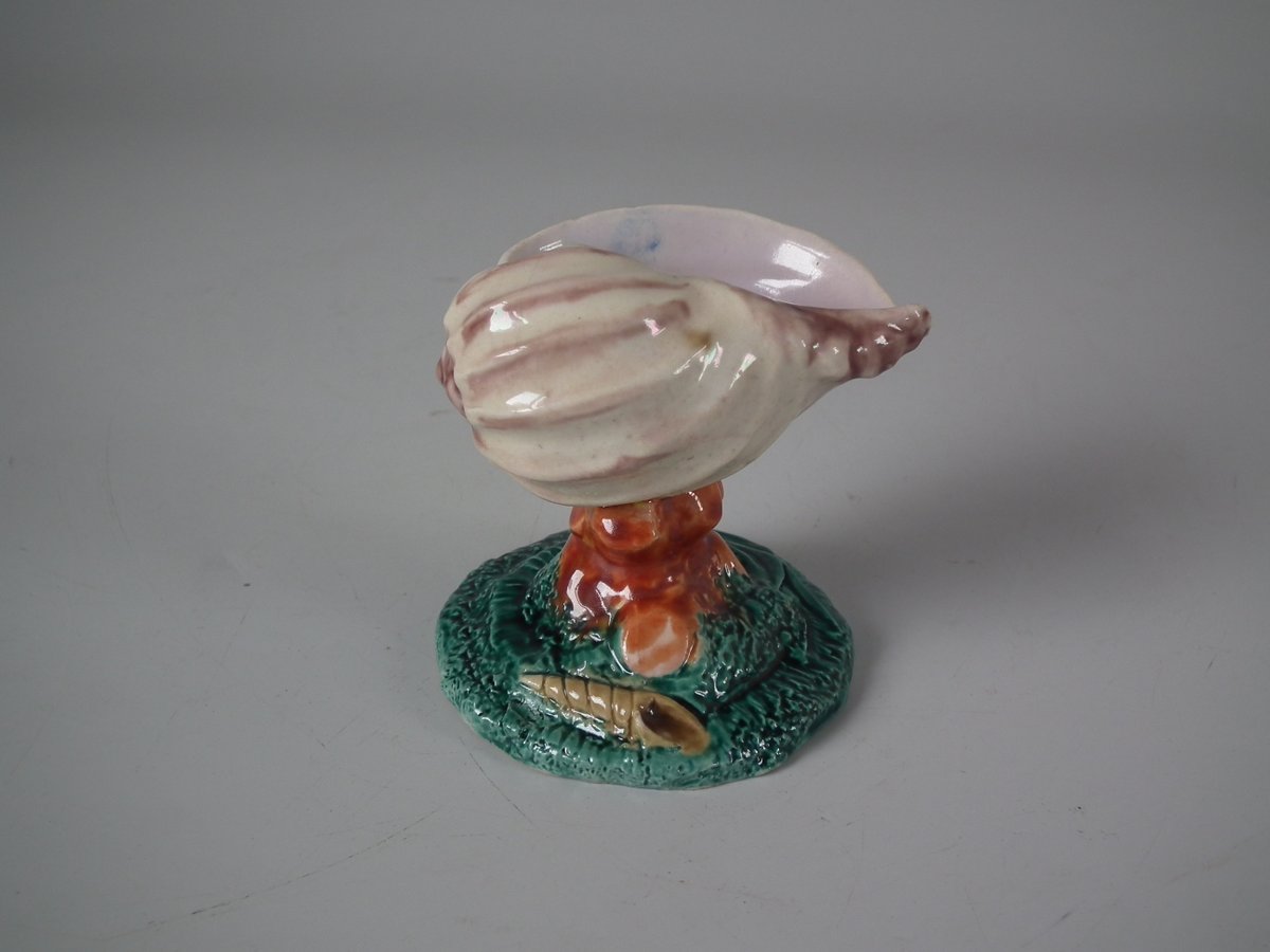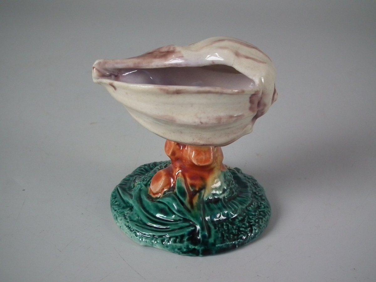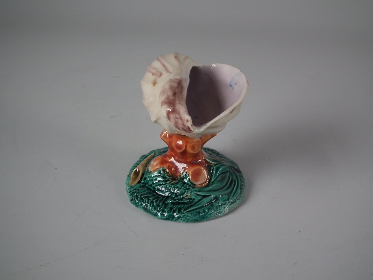 Victorian, circa 1880. 2.8ins high, 2.6ins wide, 2.4ins depth. Royal Worcester Majolica salt which features a shell, coral and seaweed. Colouration: cream, green, brown, are predominant.