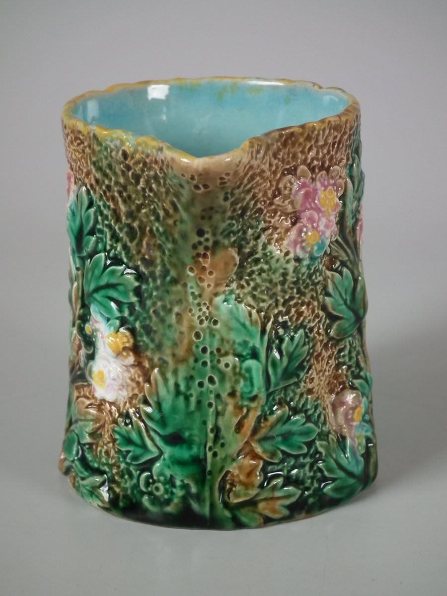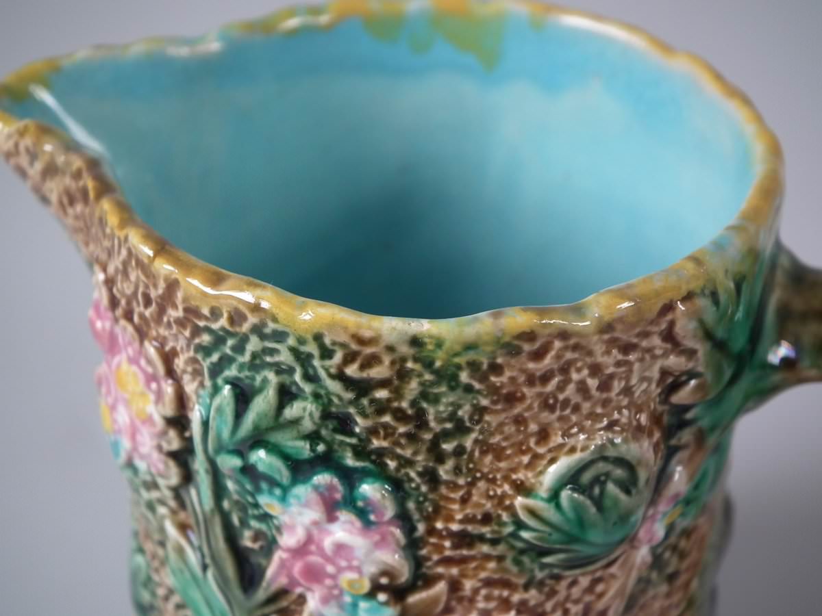 Victorian, circa 1870. 3.1ins high, 3.9ins wide, 2.4ins depth. George Jones Majolica jug/pitcher or creamer, which features pink and white blossom, and green leaves on brown, bark effect ground and a rustic branch molded handle.