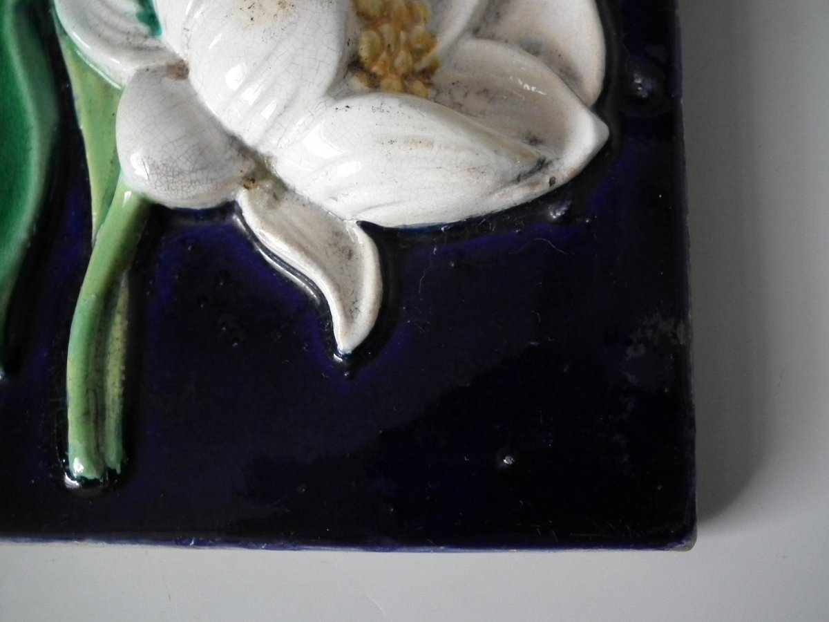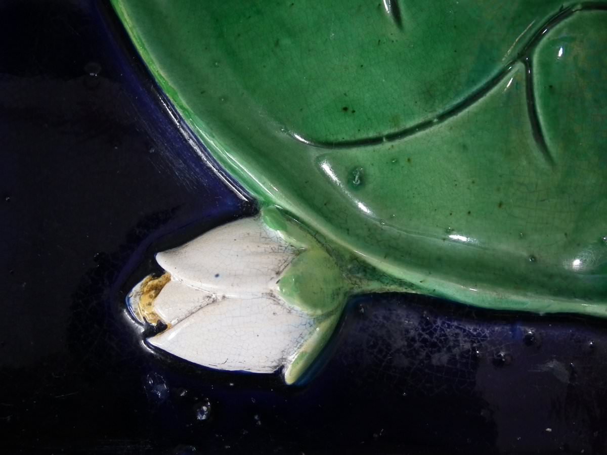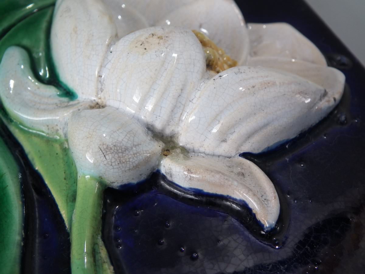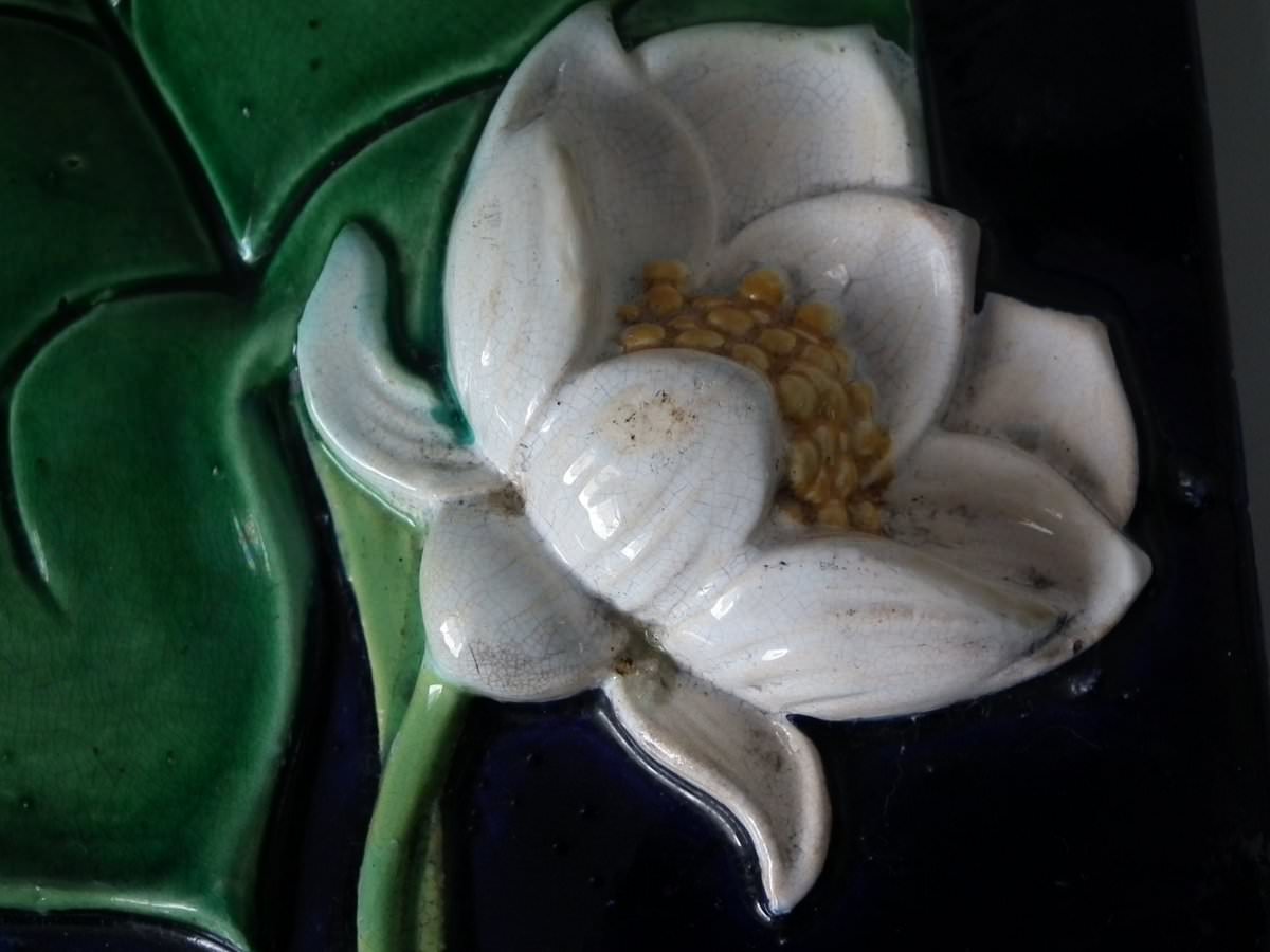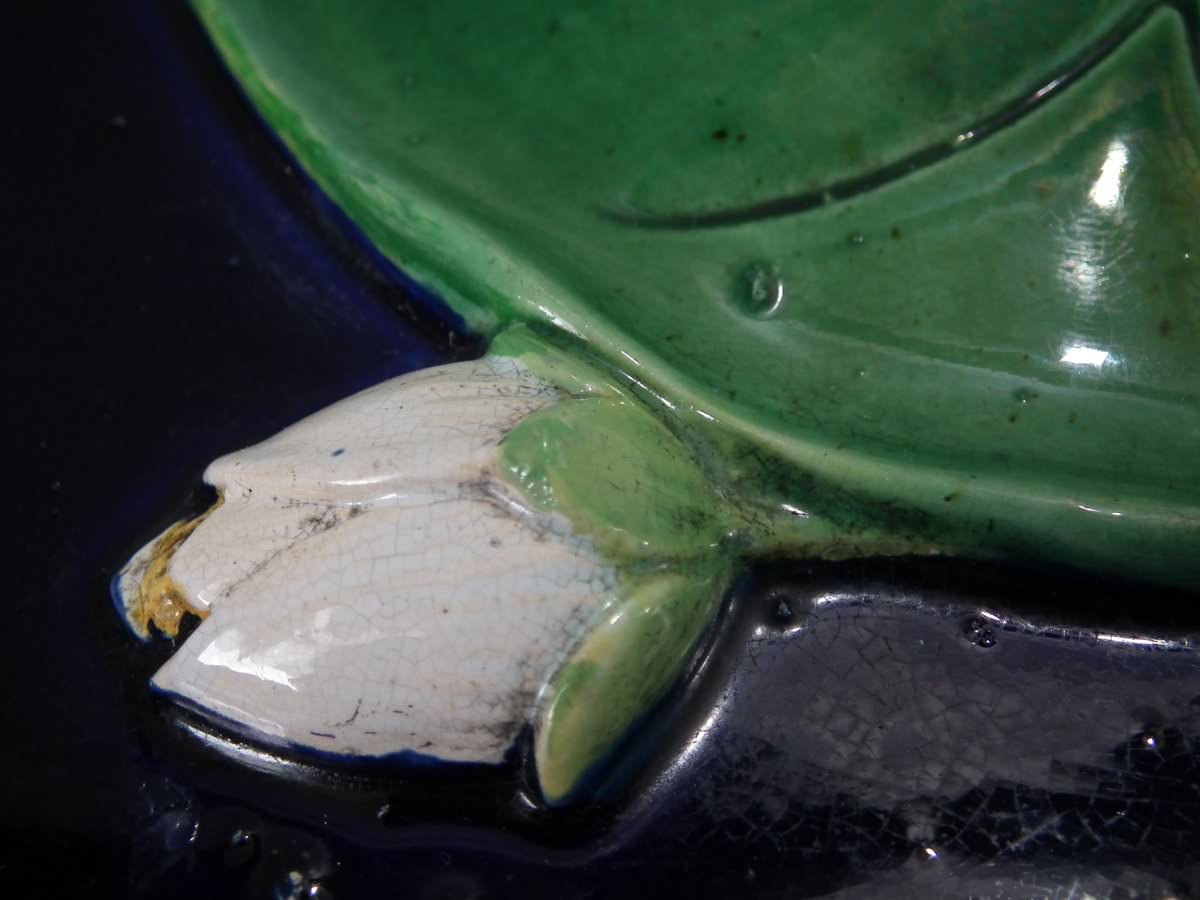 Victorian, circa 1875. 8.3ins high, 8.3ins wide, 0.8ins depth. George Jones Majolica tile which features a lily pad and flowers.