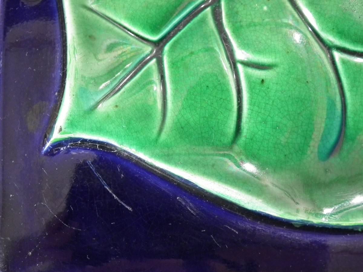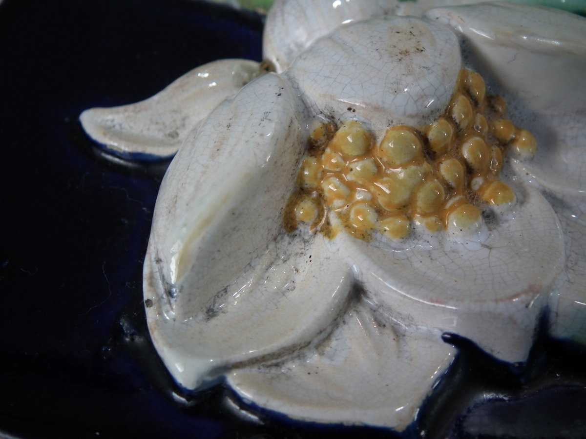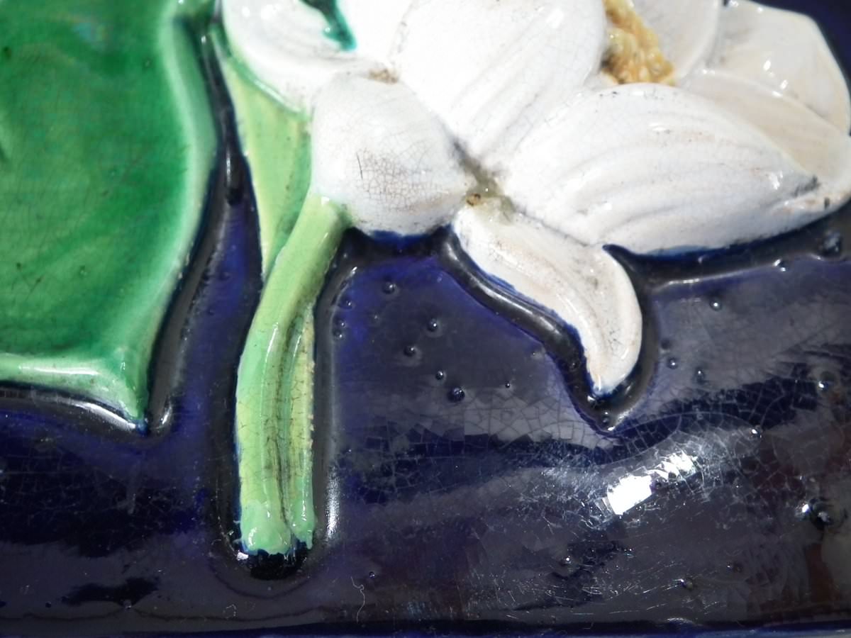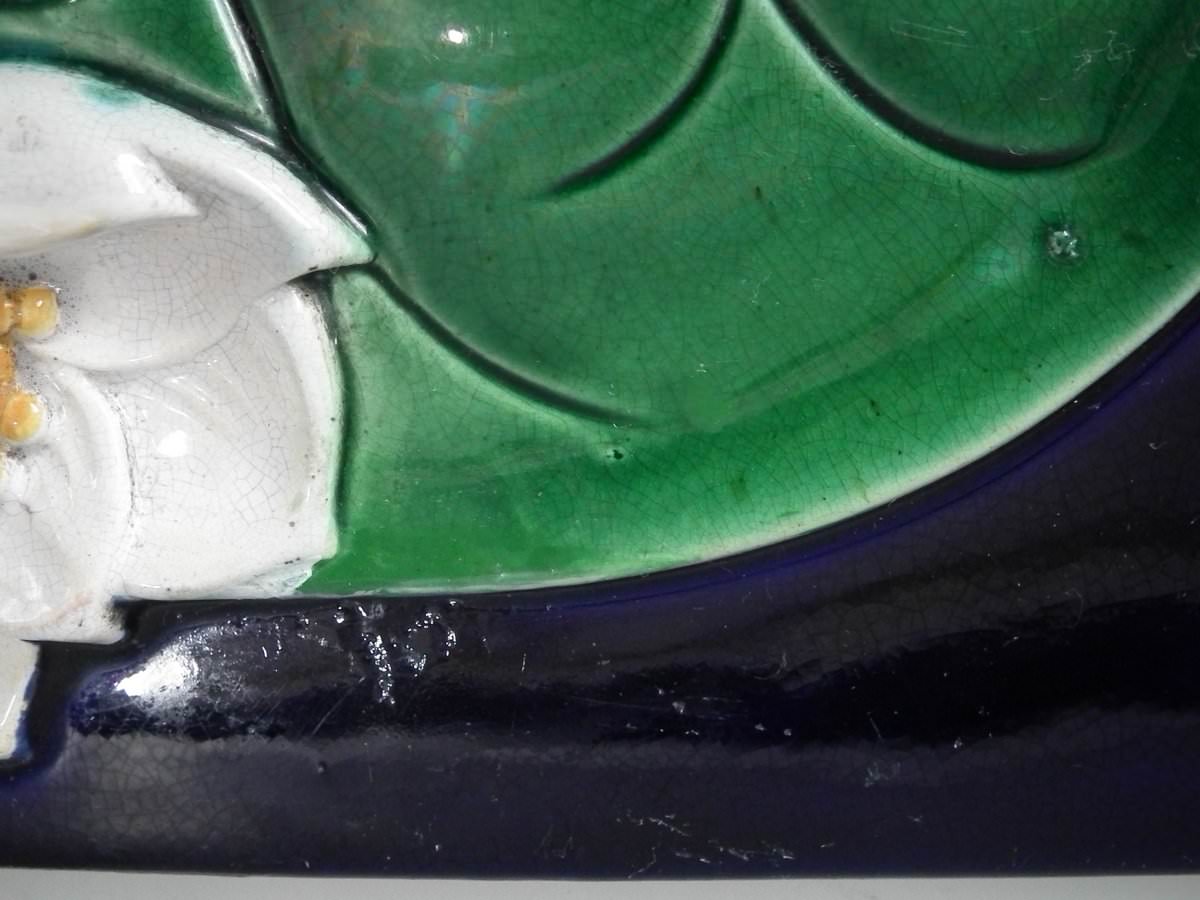 Victorian, circa 1875. 8.3ins high, 8.3ins wide, 0.8ins depth. George Jones Majolica tile which features a lily pad and flowers.