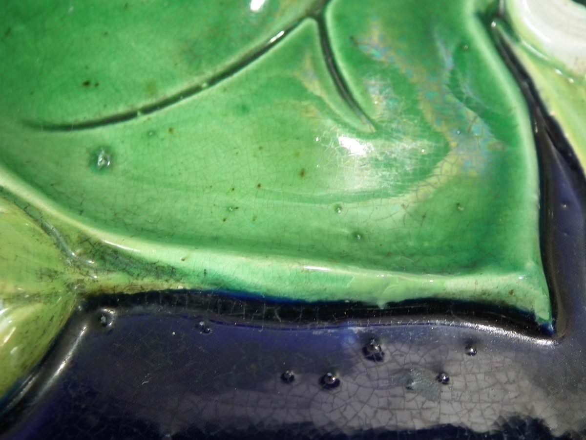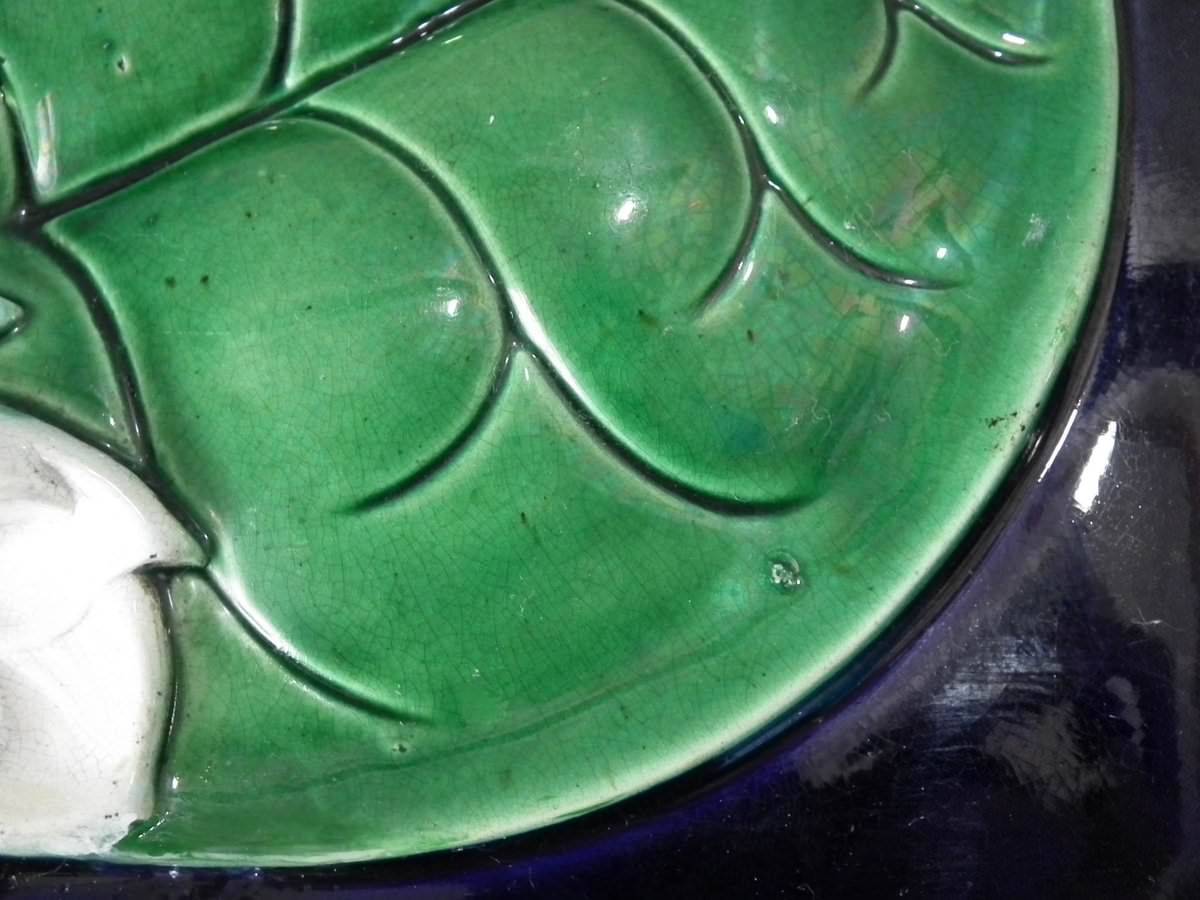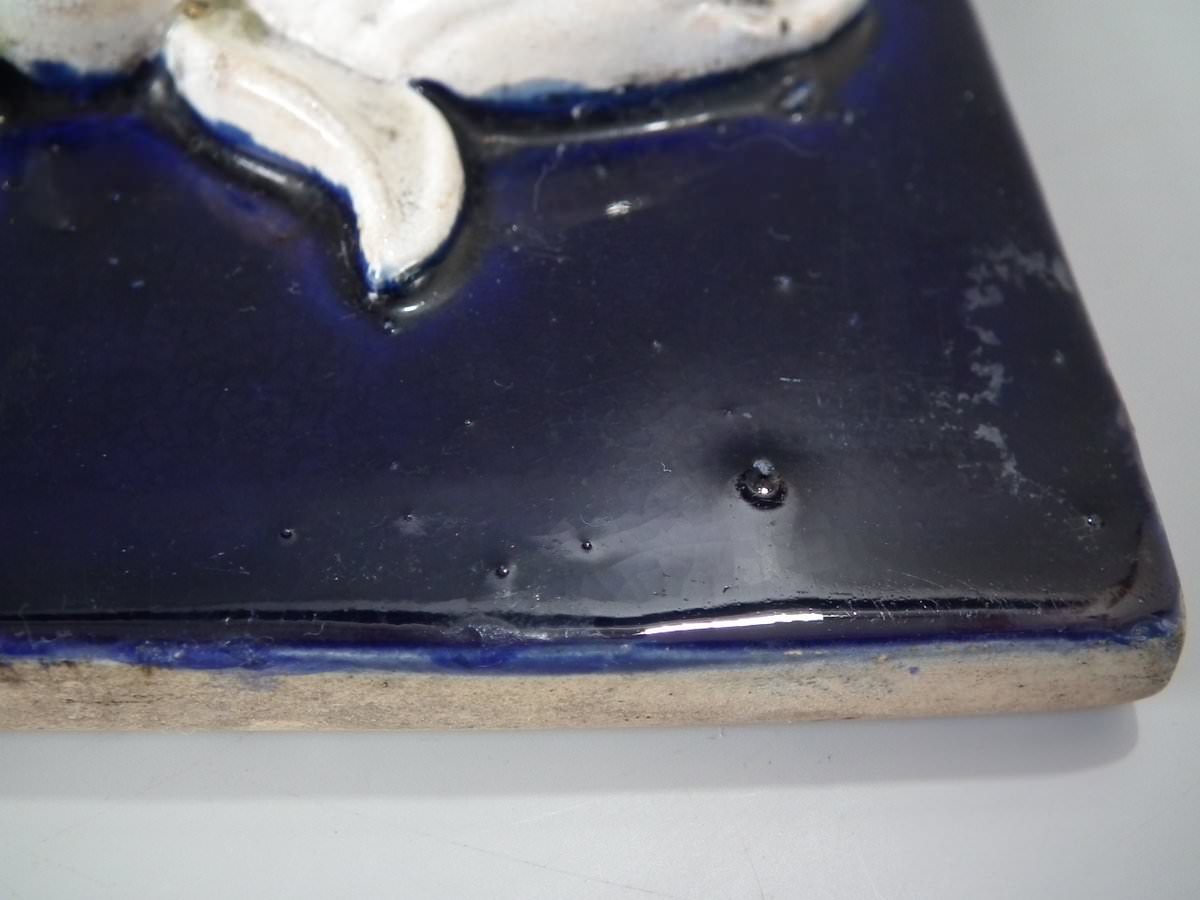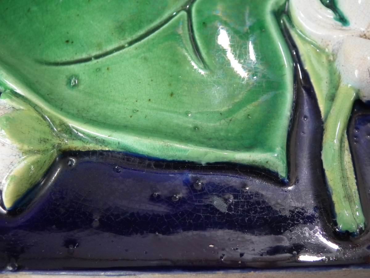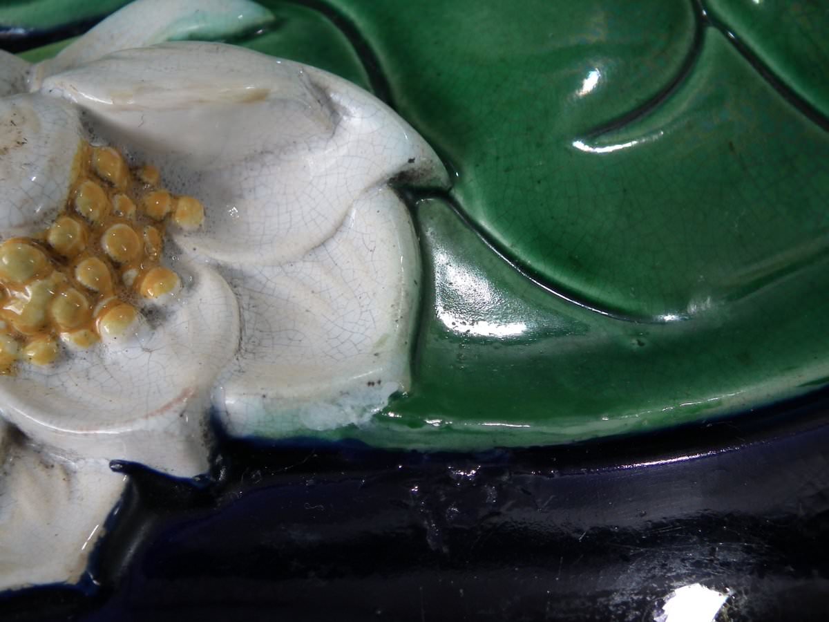 Victorian, circa 1875. 8.3ins high, 8.3ins wide, 0.8ins depth. George Jones Majolica tile which features a lily pad and flowers.