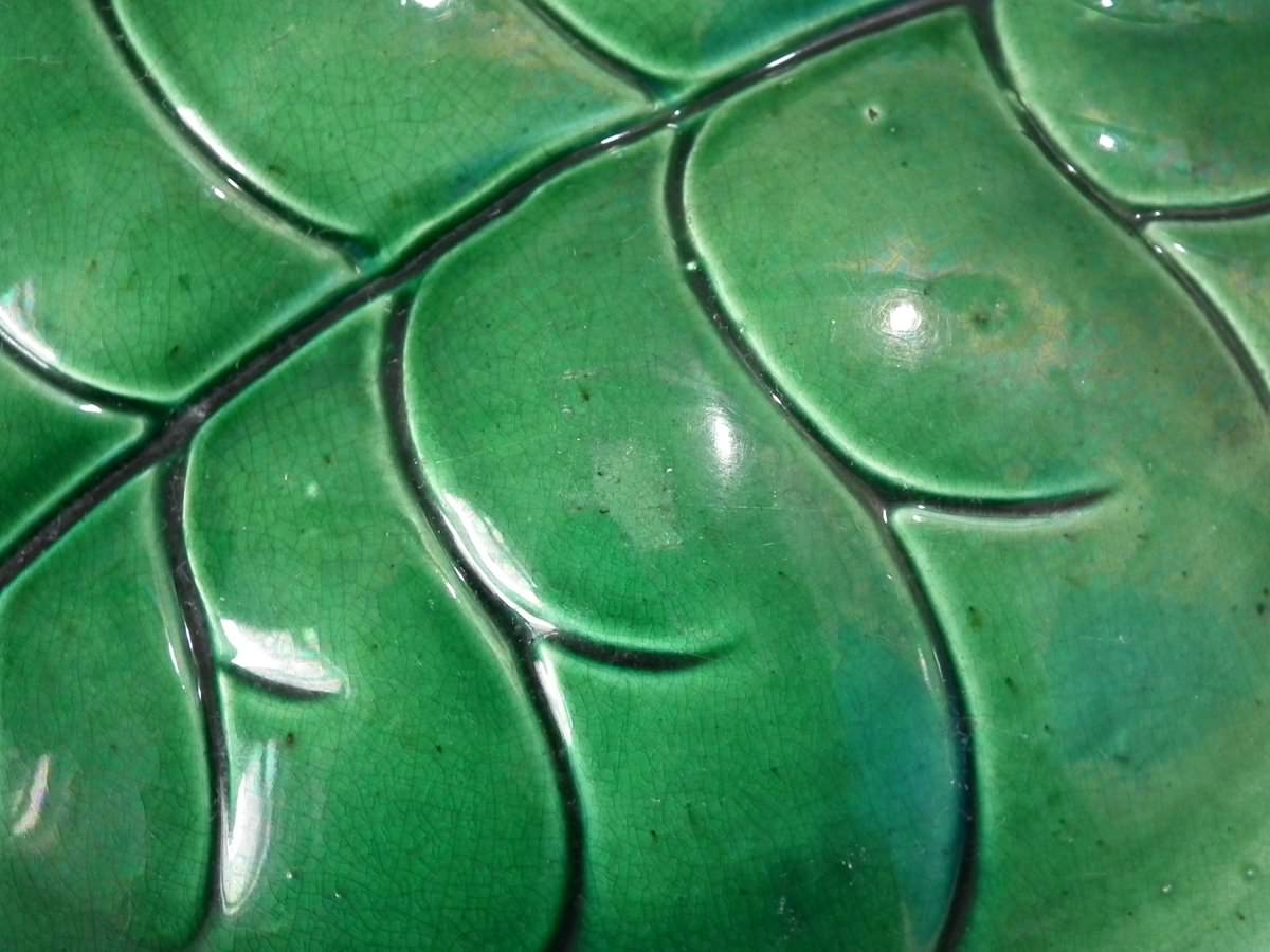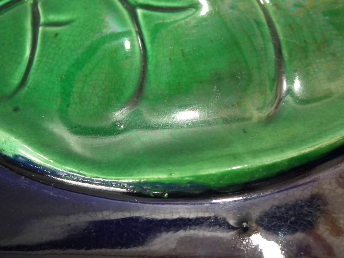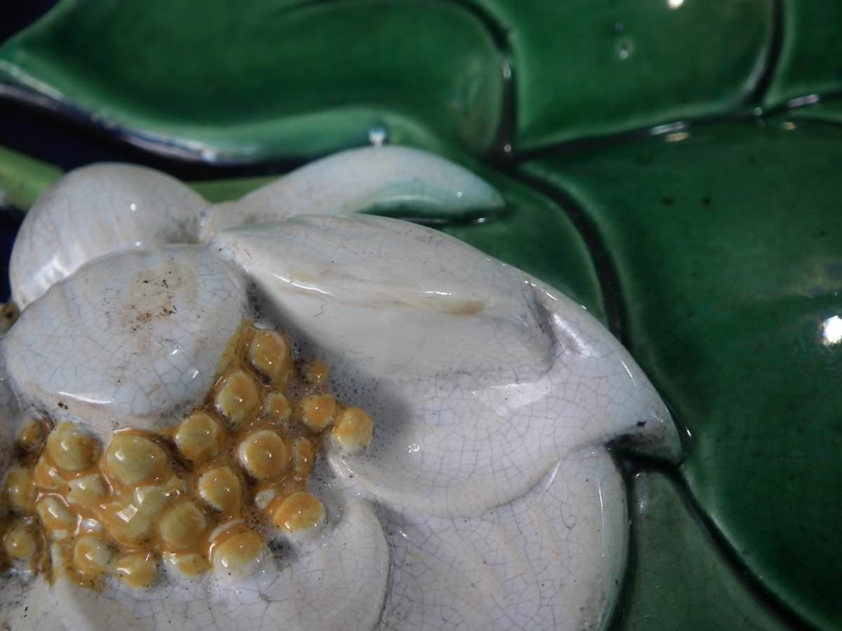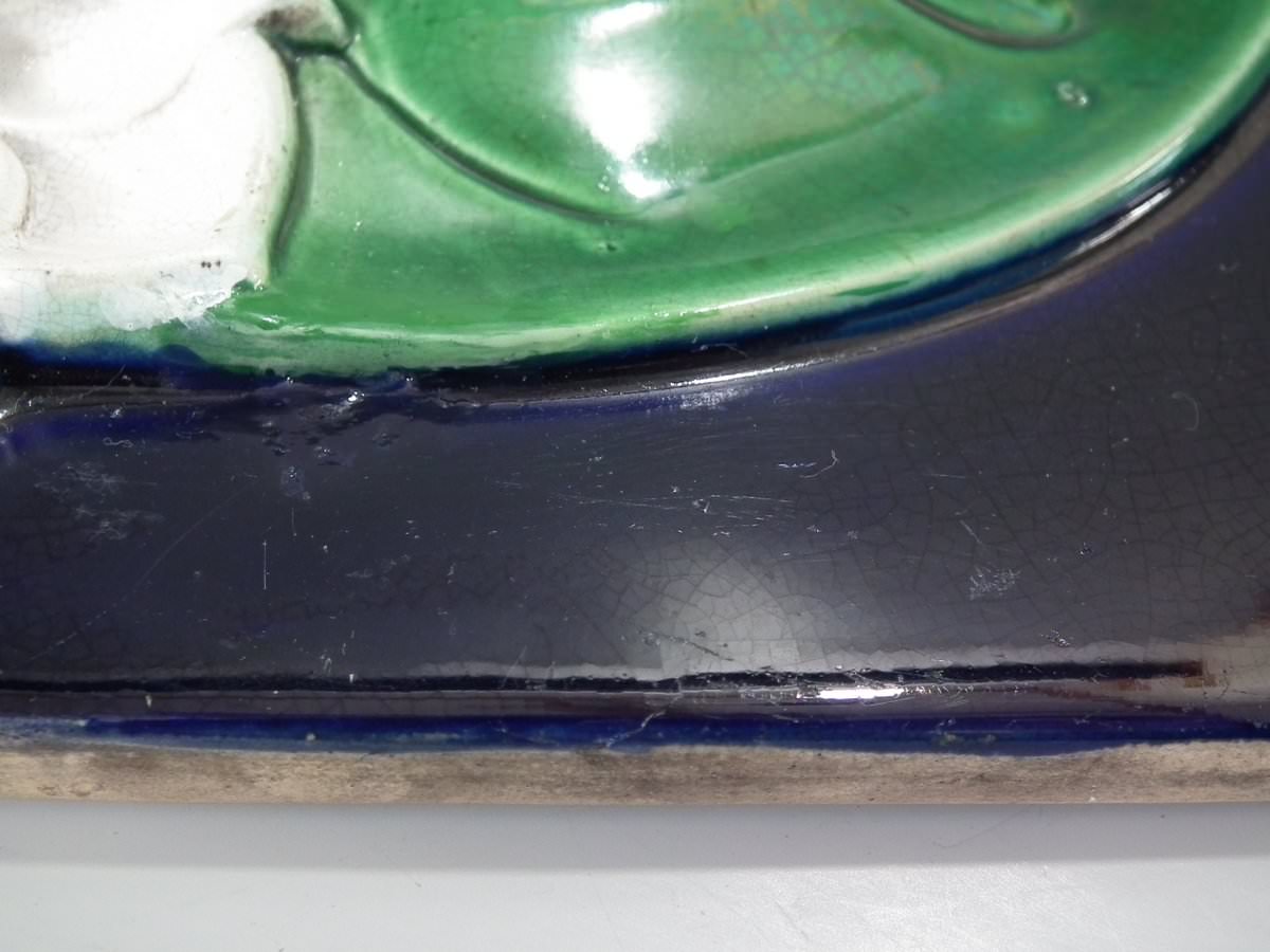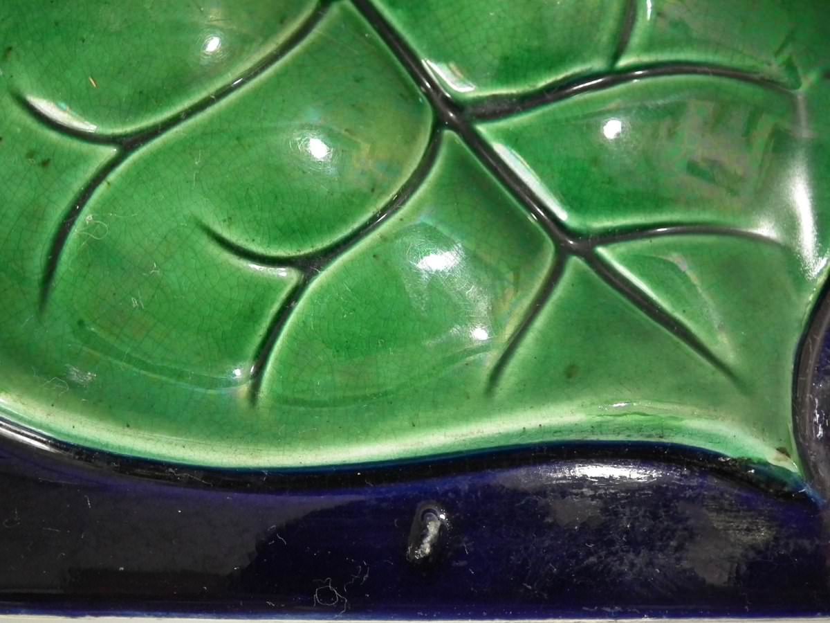 Victorian, circa 1875. 8.3ins high, 8.3ins wide, 0.8ins depth. George Jones Majolica tile which features a lily pad and flowers.