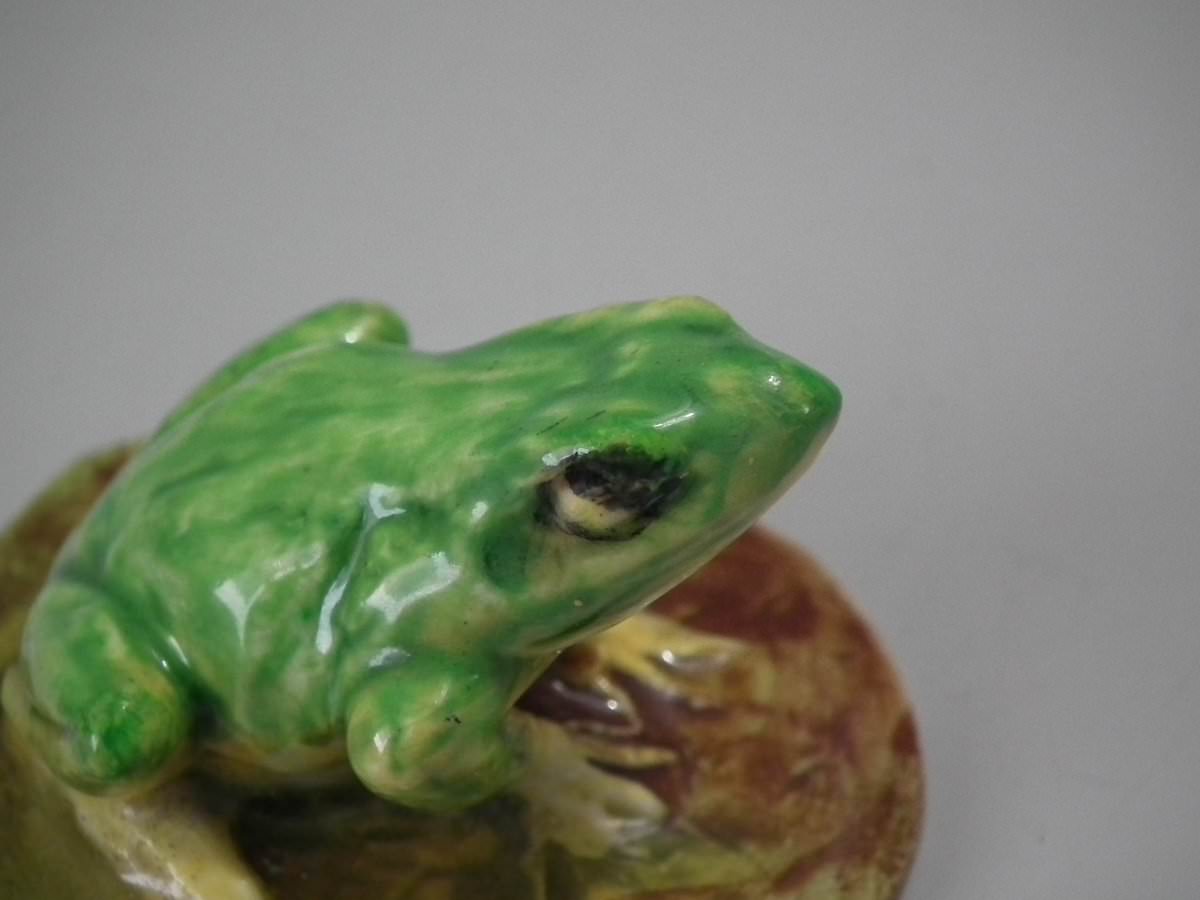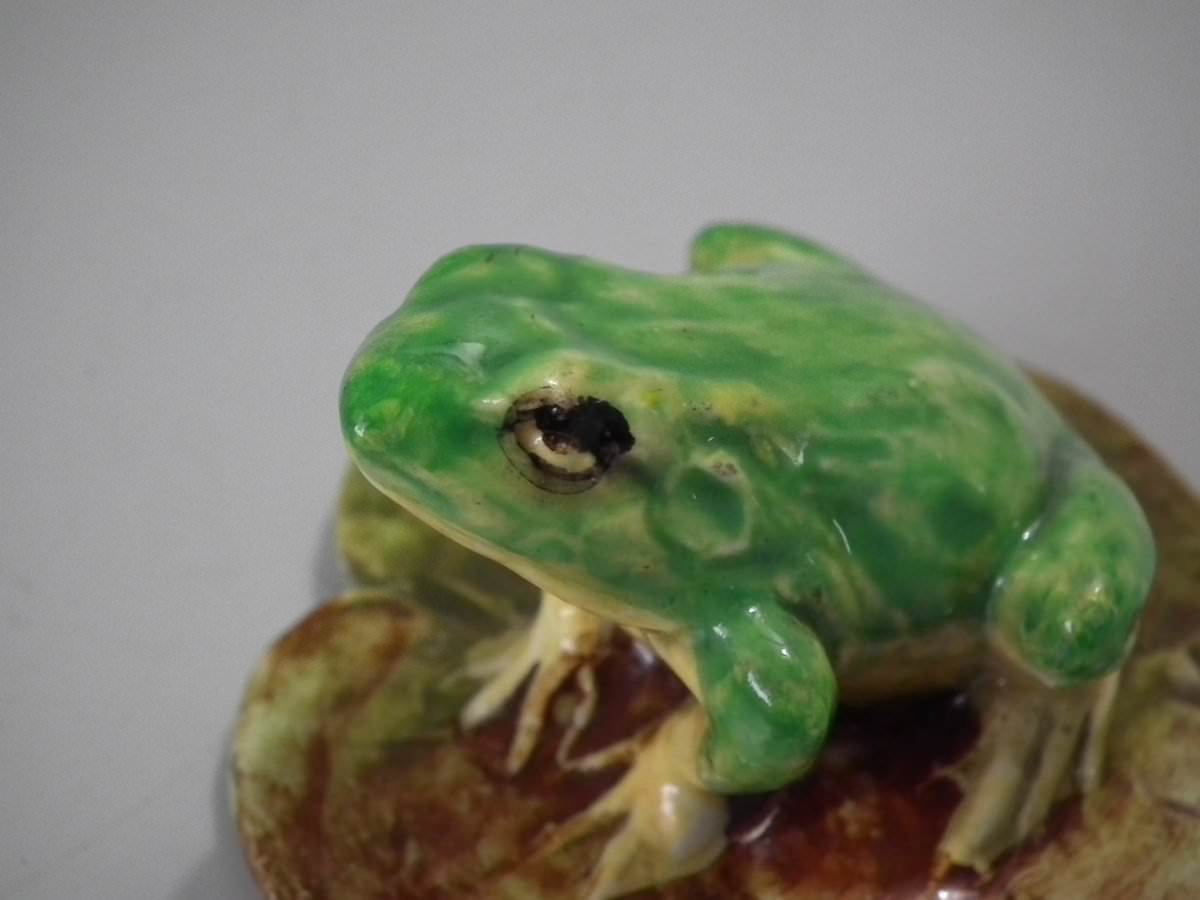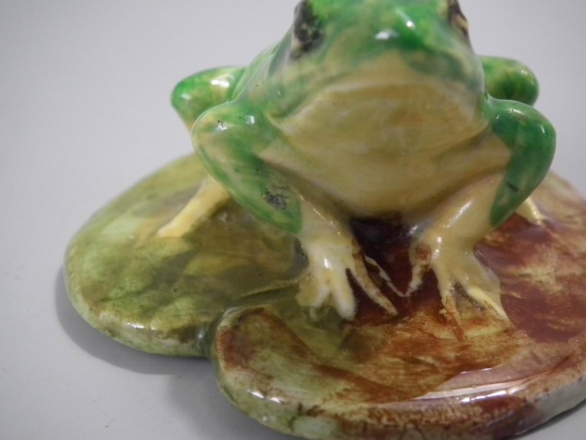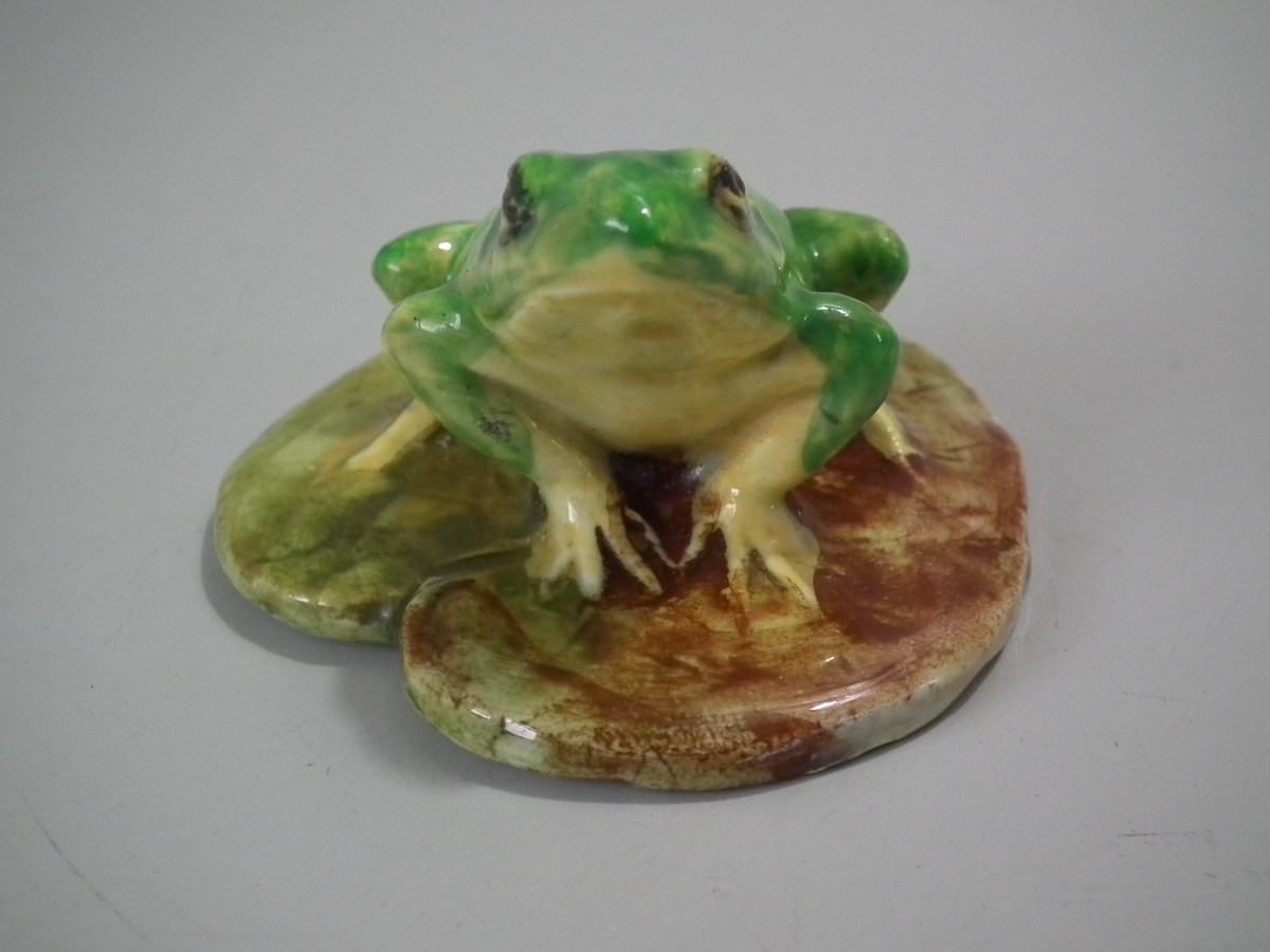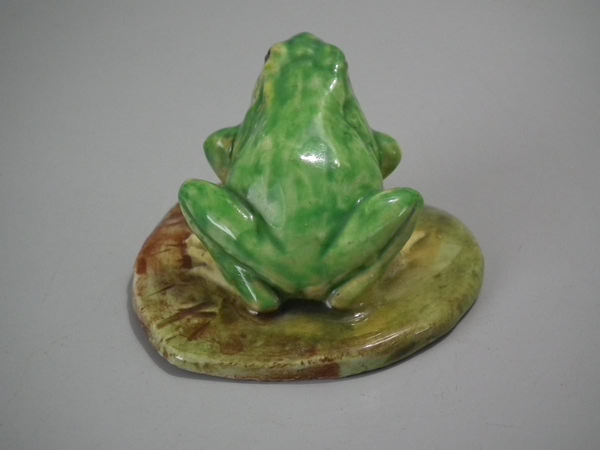 Early 20thC, circa 1908. 1.8ins high, 2.8ins wide, 2.7ins depth. Jerome Massier French Majolica figure which features a frog on a lily pad.