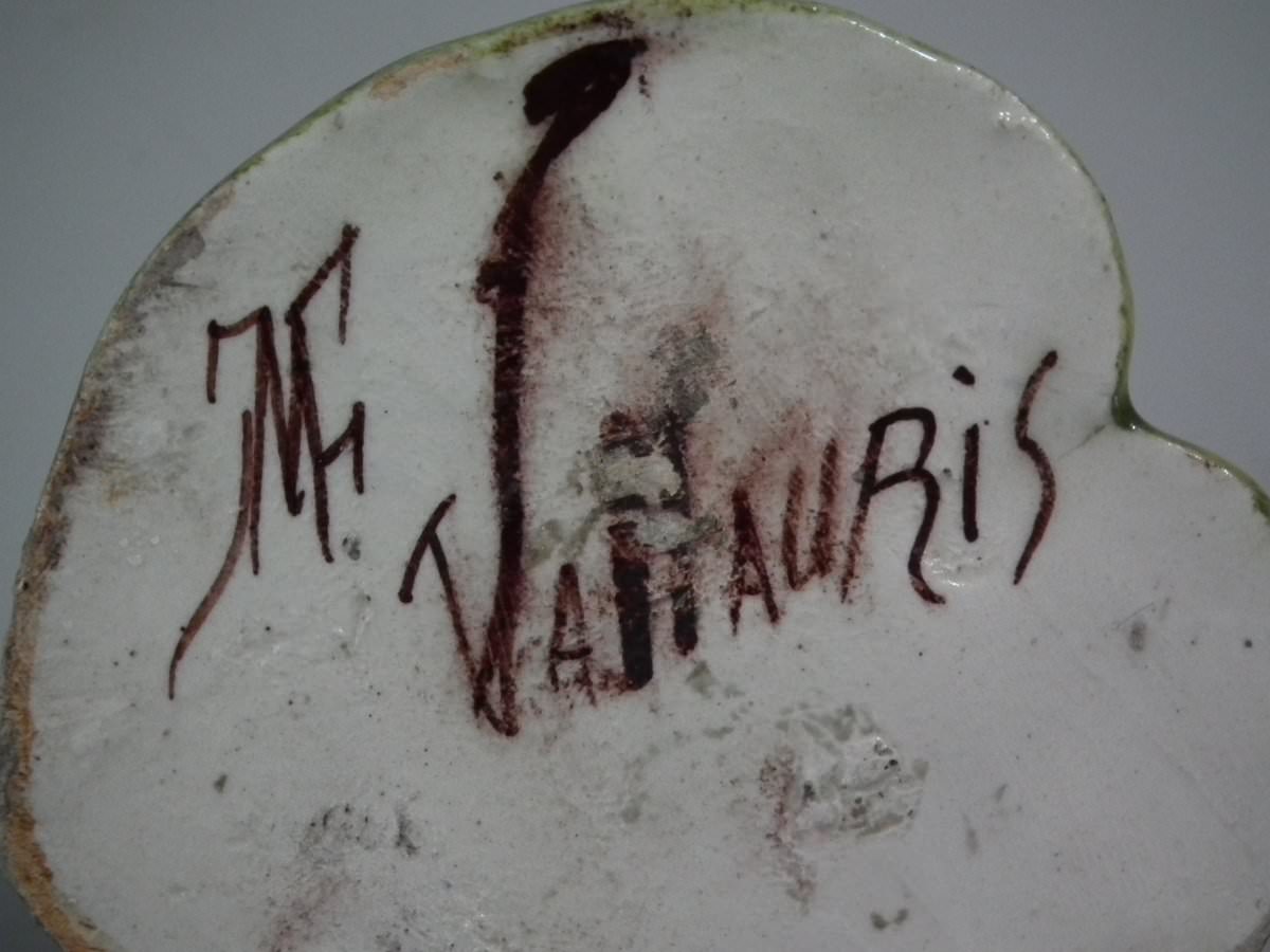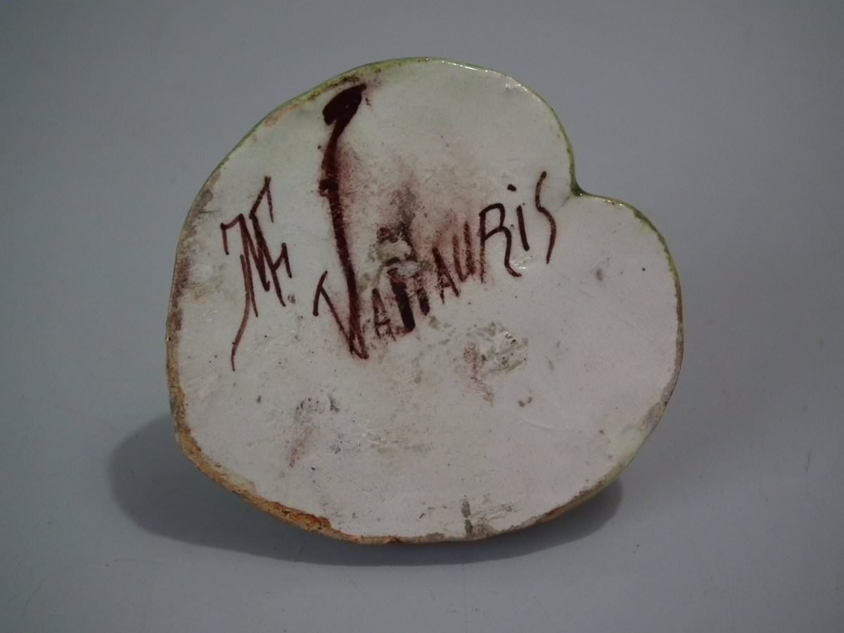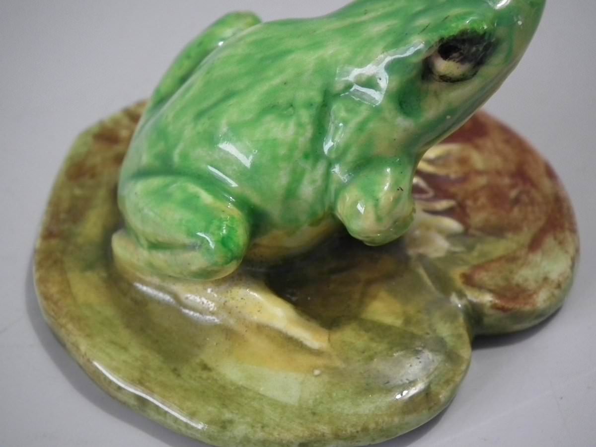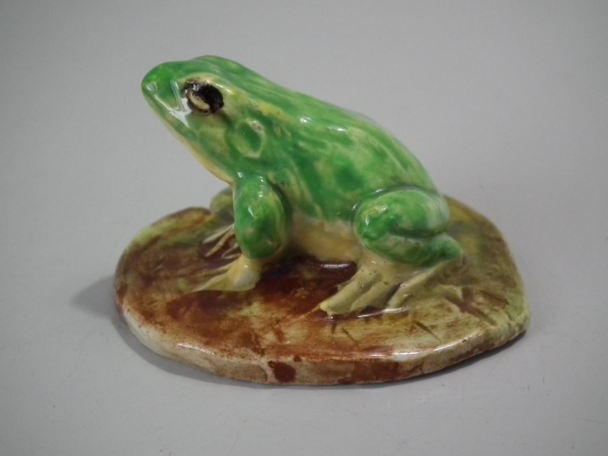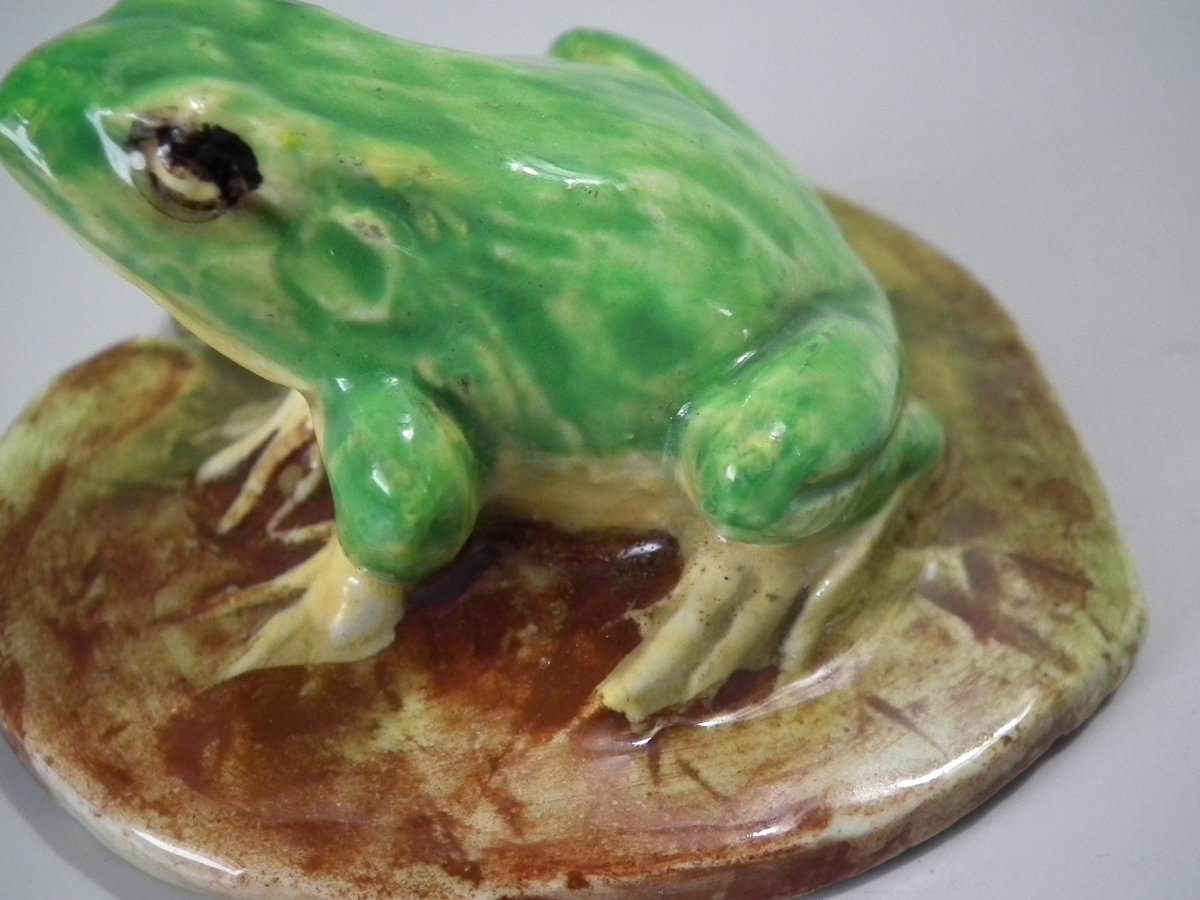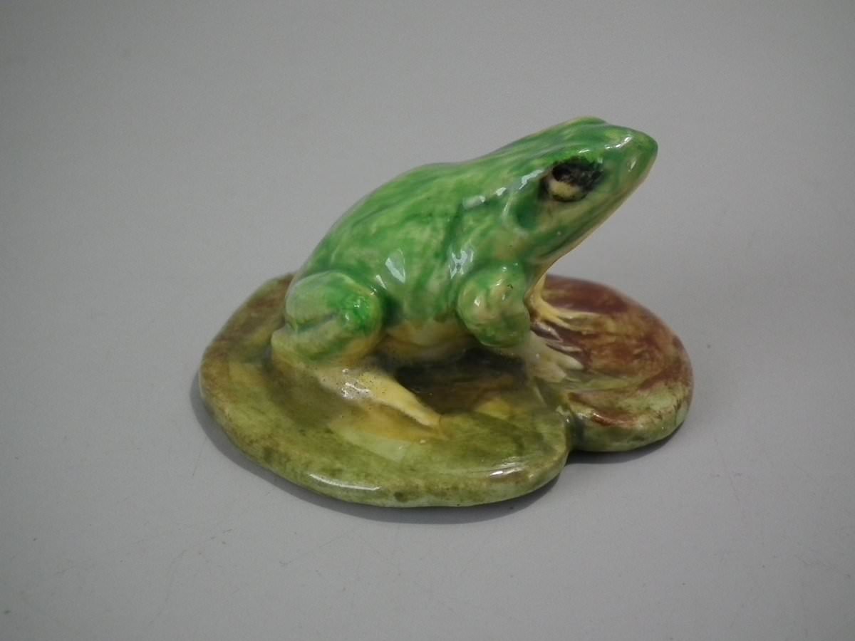 Early 20thC, circa 1908. 1.8ins high, 2.8ins wide, 2.7ins depth. Jerome Massier French Majolica figure which features a frog on a lily pad.