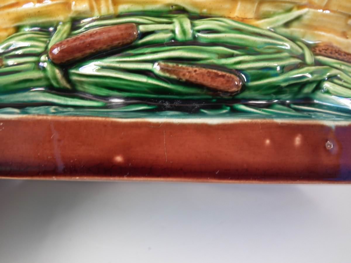Victorian, circa 1859. 2ins high, 5.5ins wide, 2.8ins depth. Minton Majolica pin tray which features wicker basket resting on a bed of cattails/bullrushes.