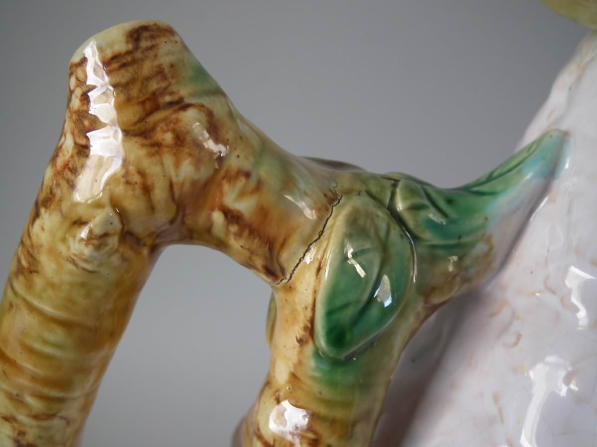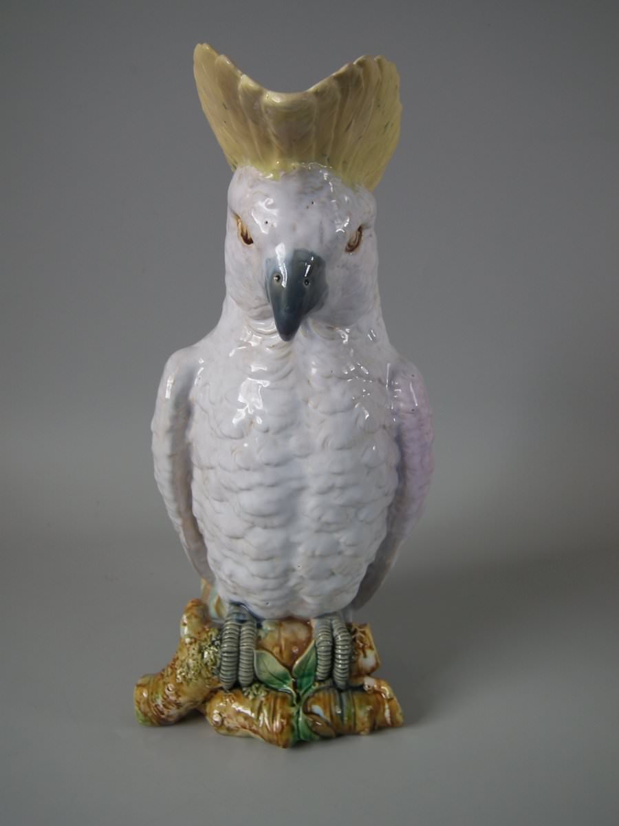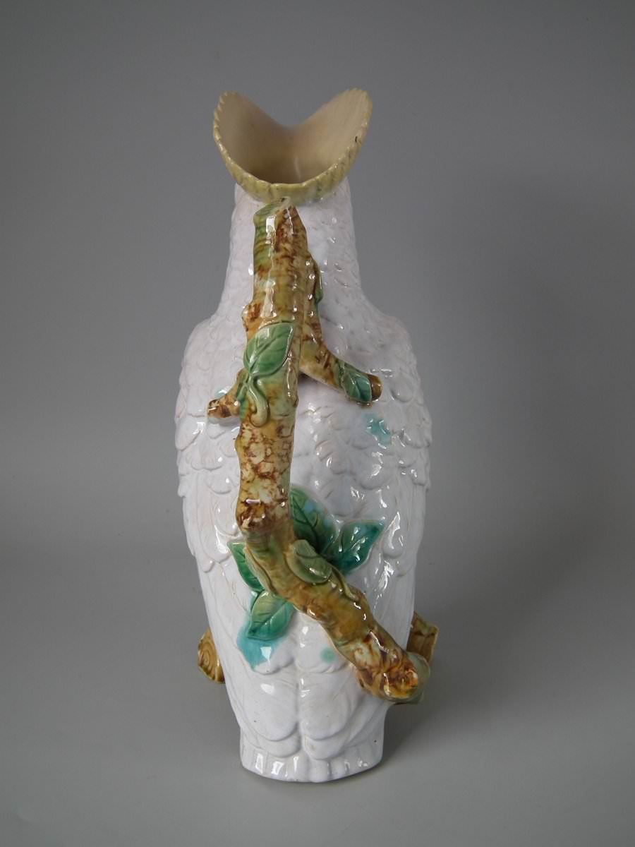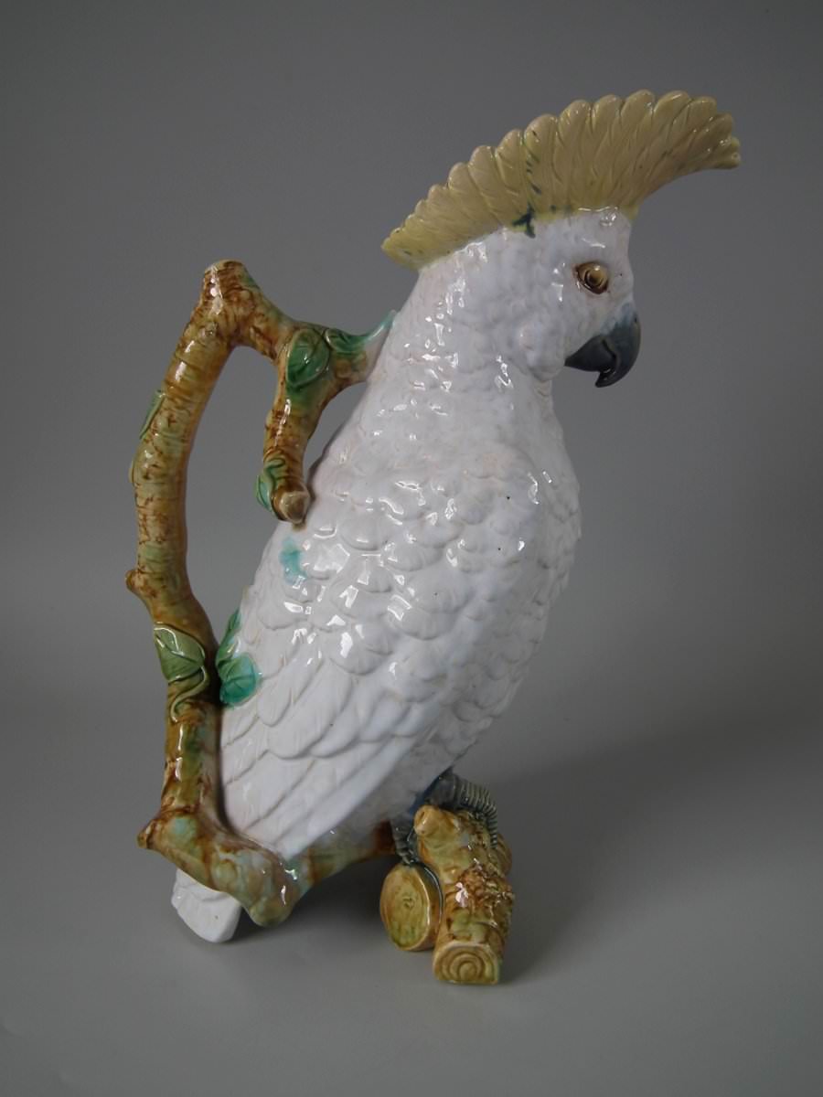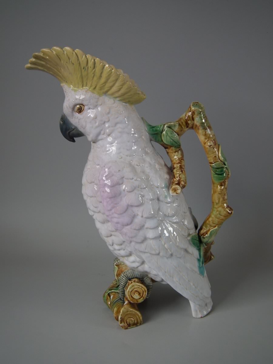 Victorian, circa 1870. 12.6ins high, 5.1ins wide, 9.4ins depth. Brownfield Majolica jug/pitcher which features a cockatoo, with branch handle.