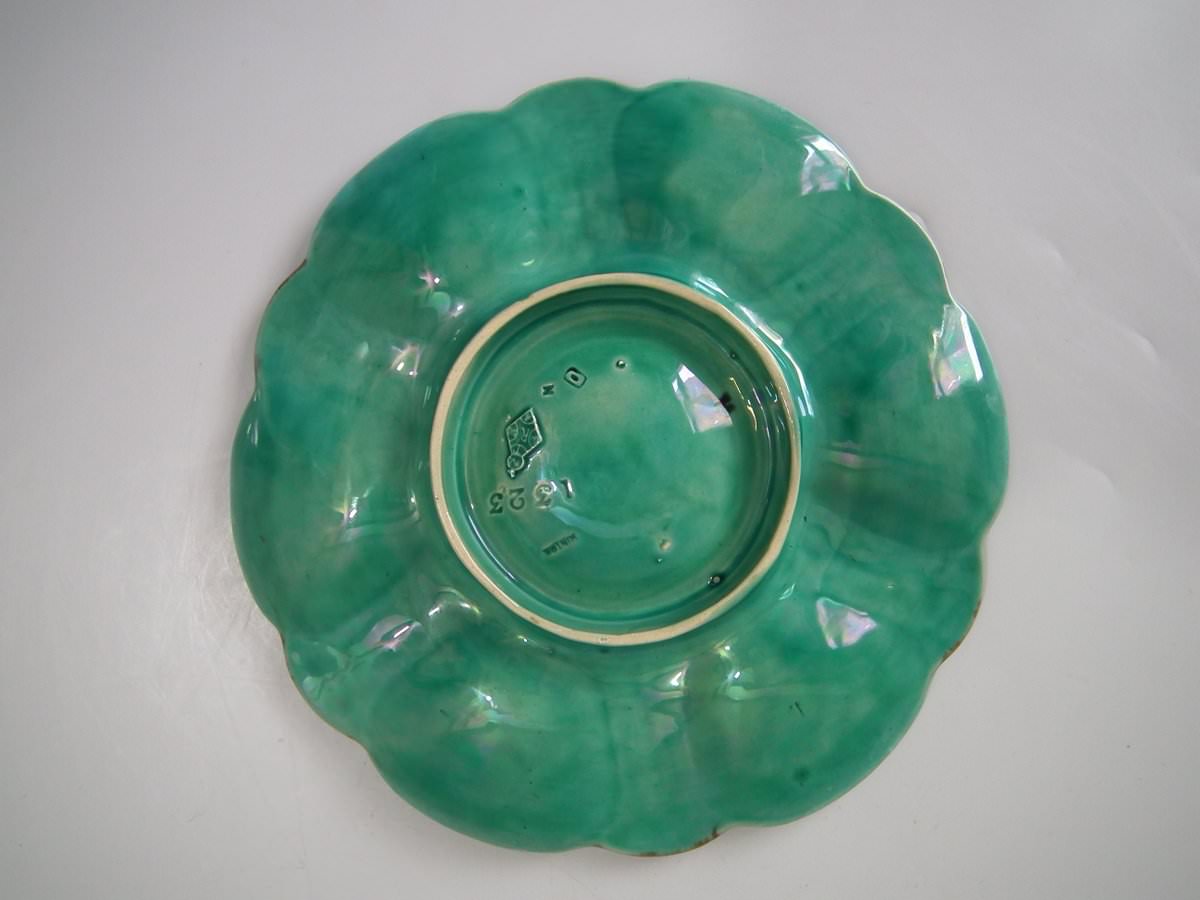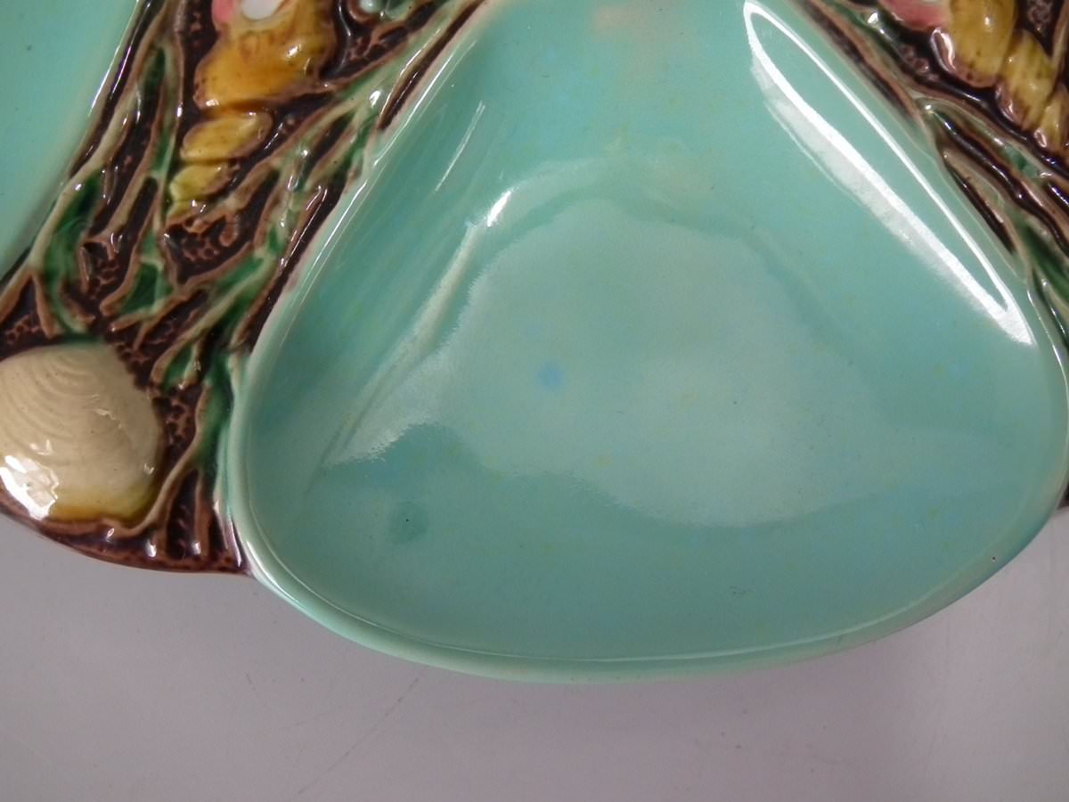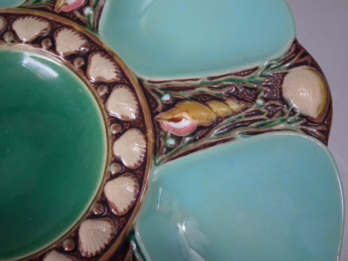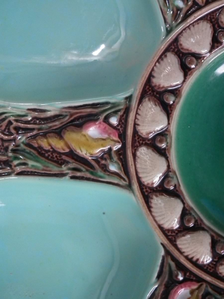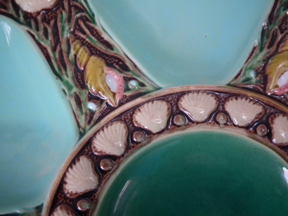 Victorian, circa 1869. 1ins high, 9.1ins wide, 9.1ins depth. Minton Majolica oyster plate which features six shell shaped wells with seashell surrounds. Turquoise ground version. Colouration: turquoise, green, cream, are predominant.