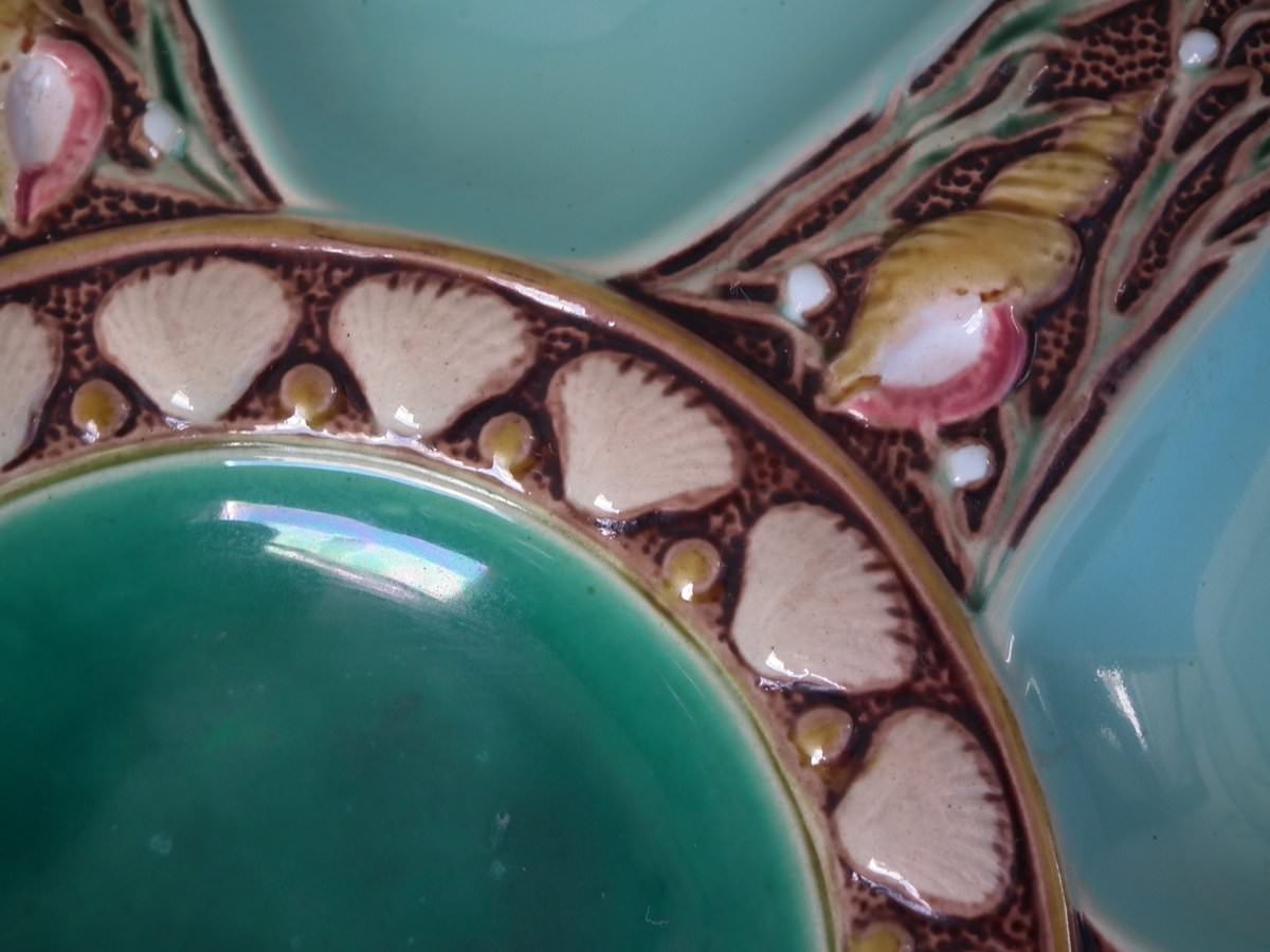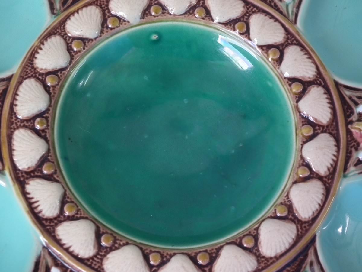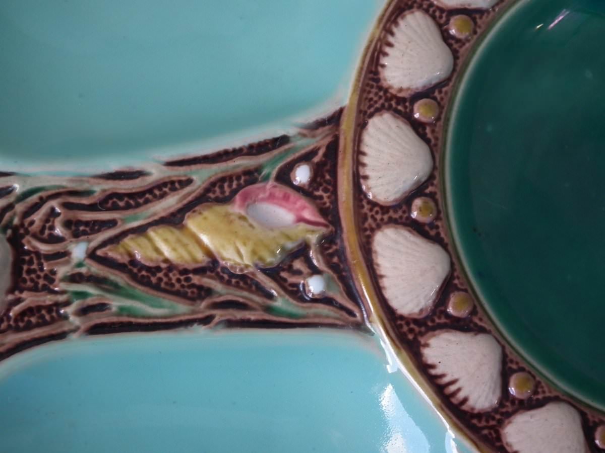 Victorian, circa 1869. 1ins high, 9.1ins wide, 9.1ins depth. Minton Majolica oyster plate which features six shell shaped wells with seashell surrounds. Turquoise ground version.
