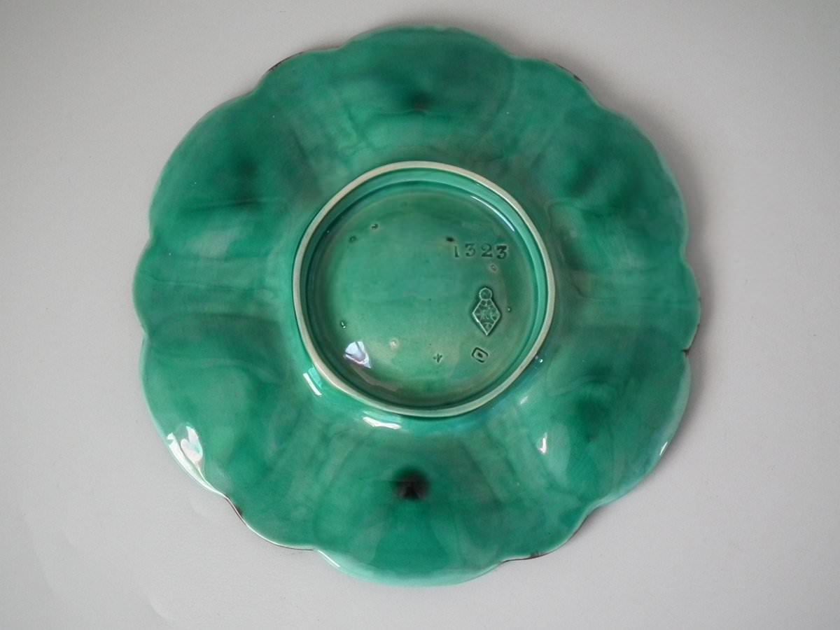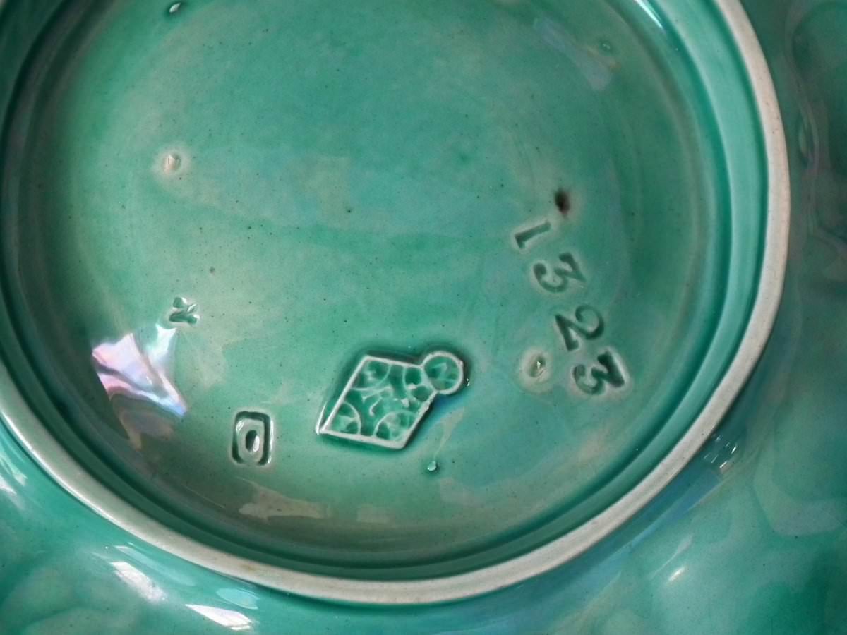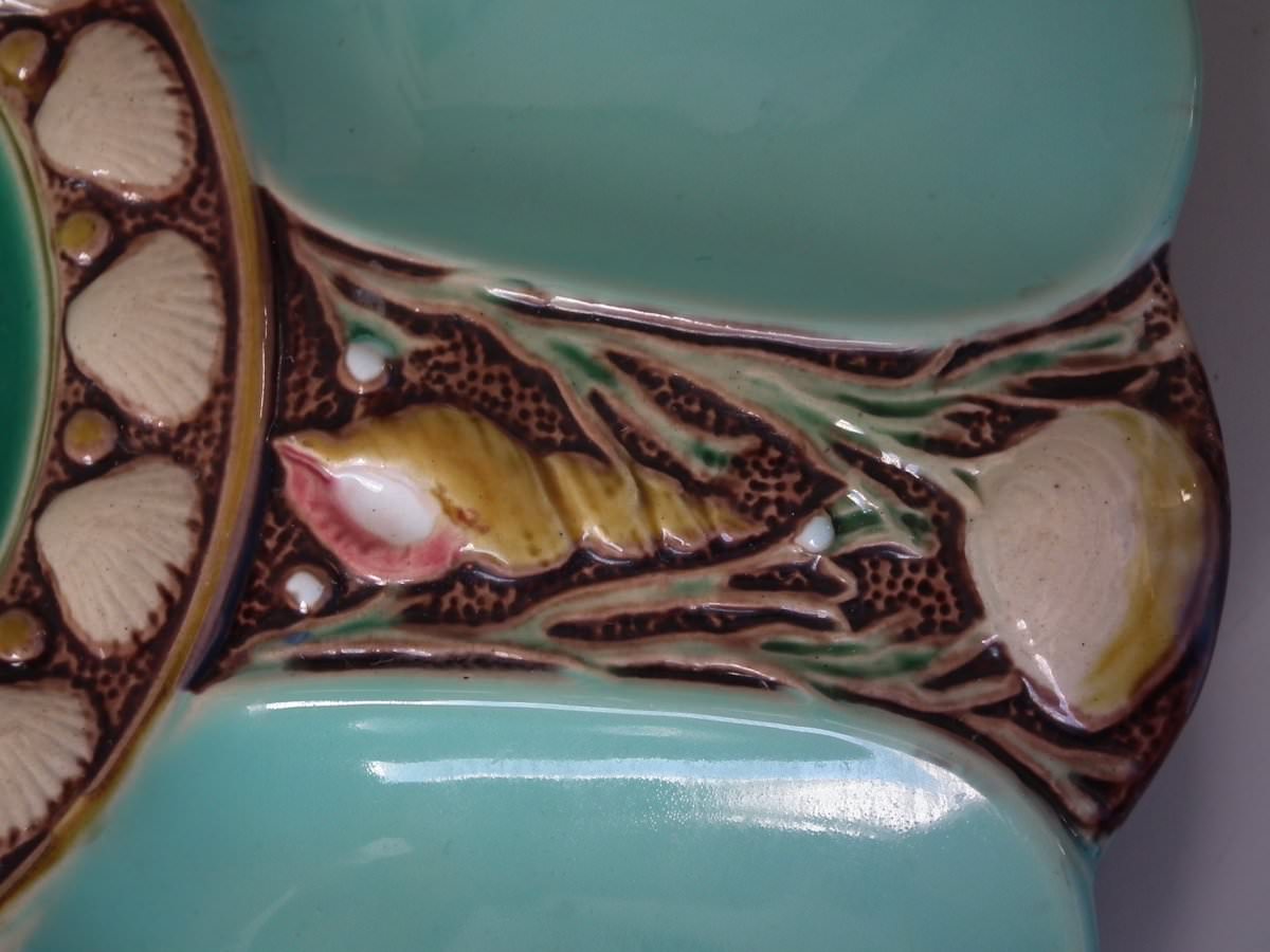 Victorian, circa 1869. 1ins high, 9.1ins wide, 9.1ins depth. Minton Majolica oyster plate which features six shell shaped wells with seashell surrounds. Turquoise ground version.