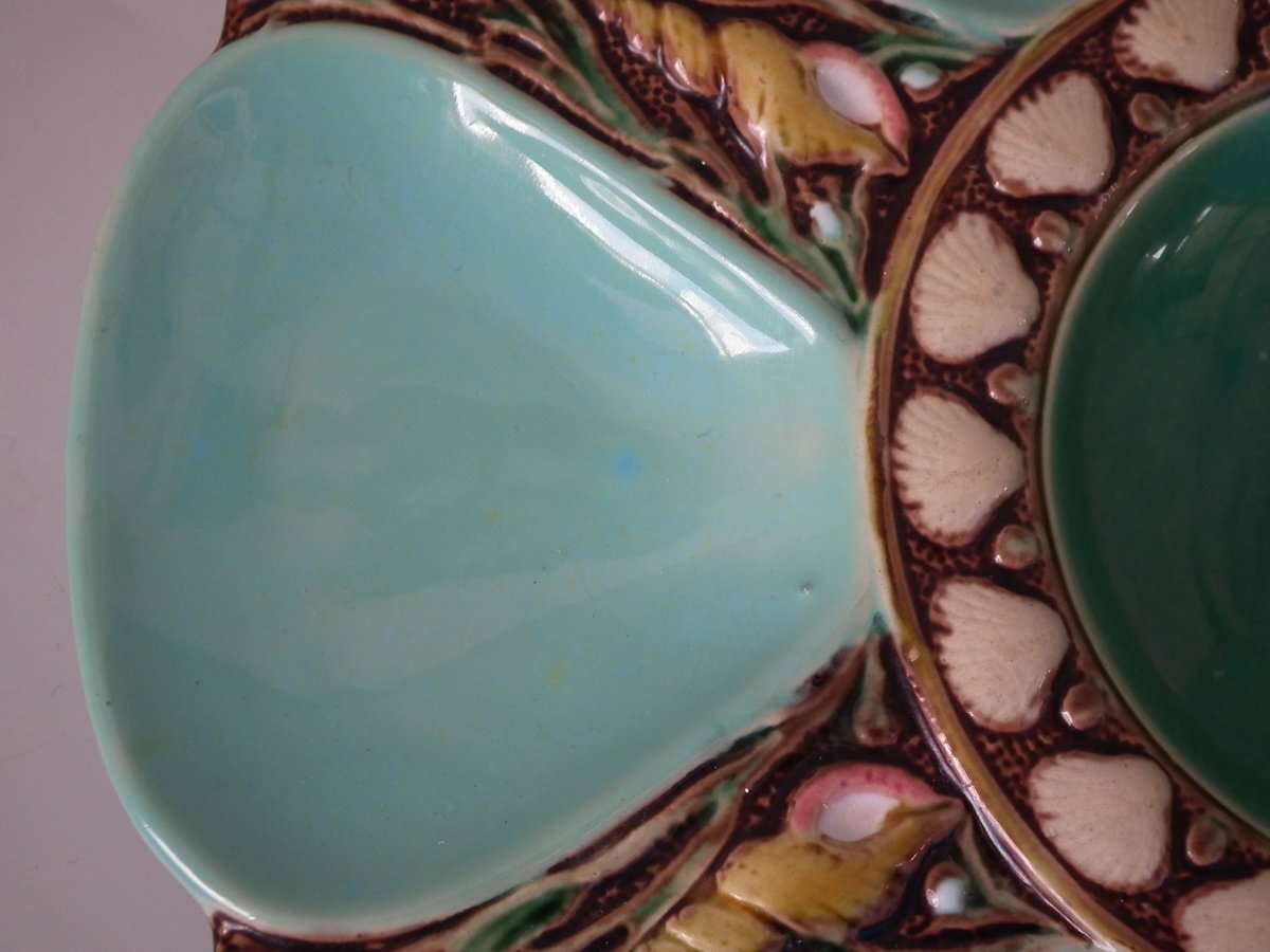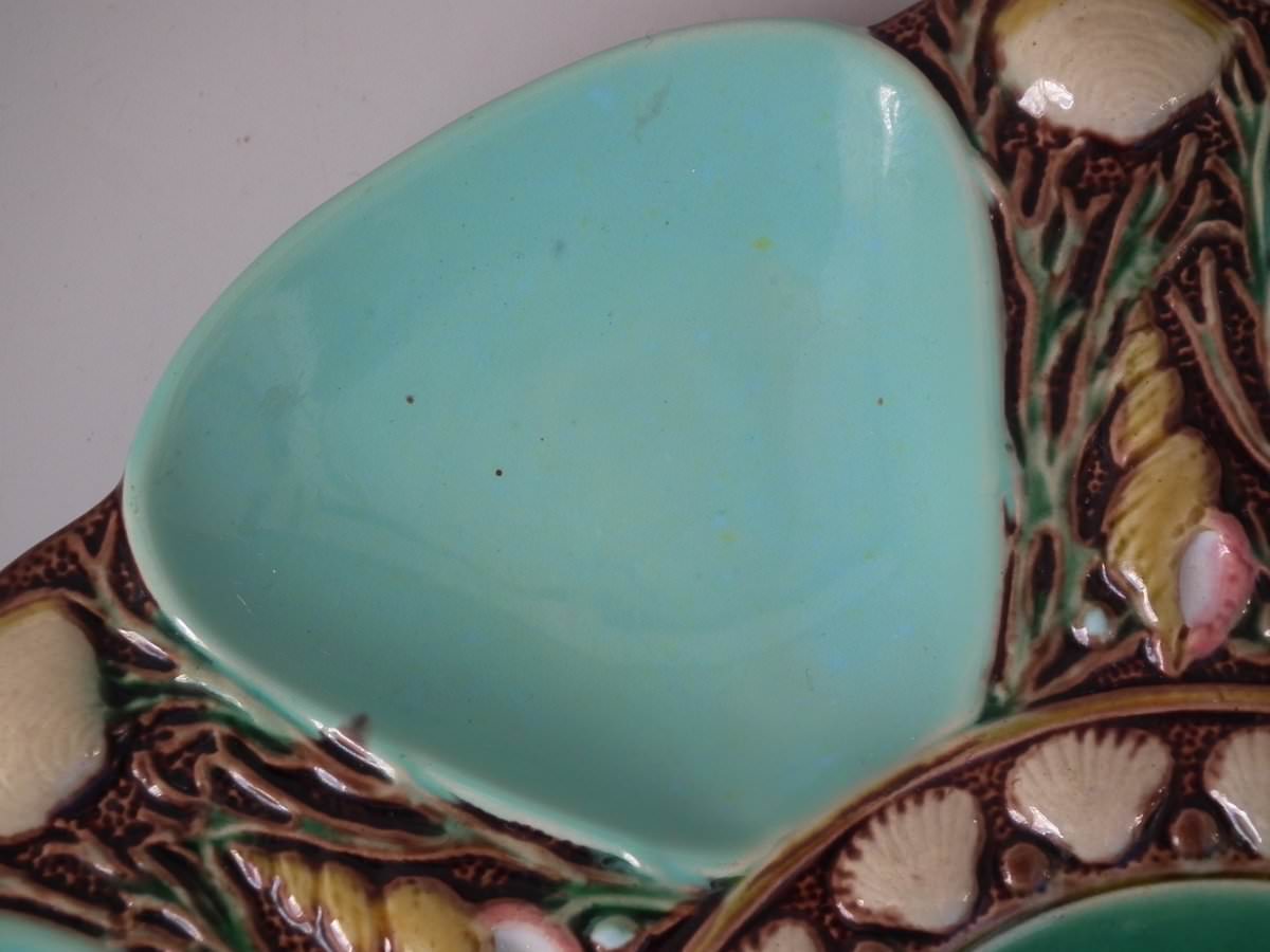Victorian, circa 1869. 1ins high, 9.1ins wide, 9.1ins depth. Minton Majolica oyster plate which features six shell shaped wells with seashell surrounds. Turquoise ground version.