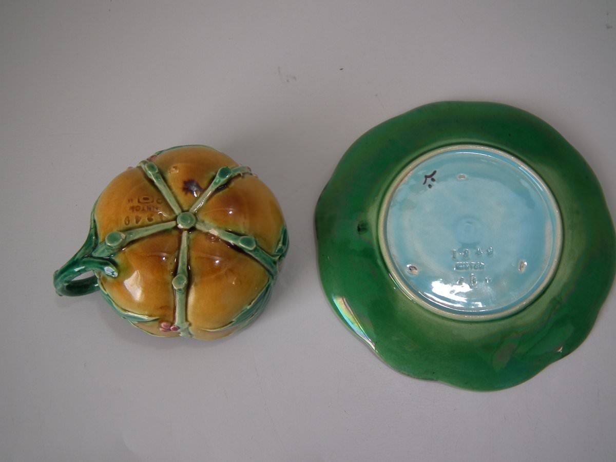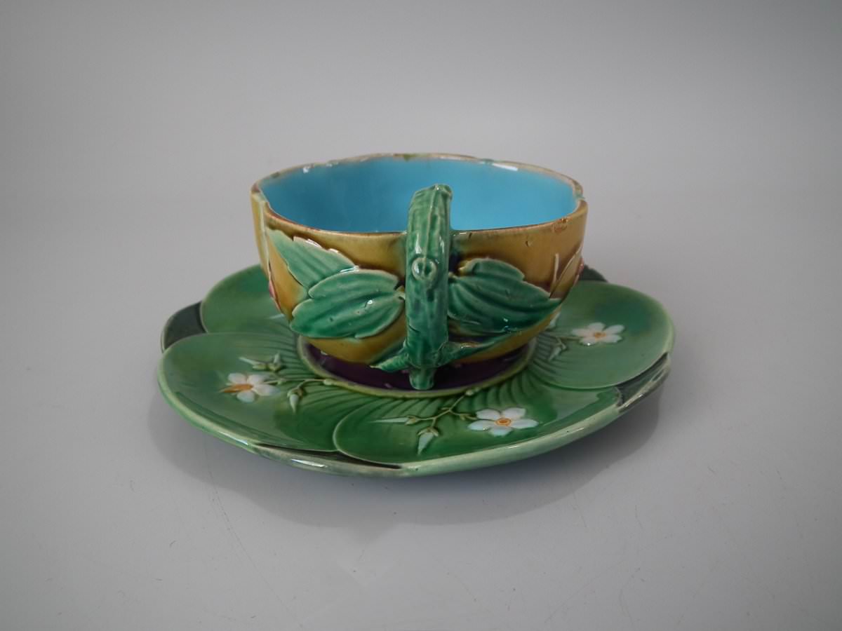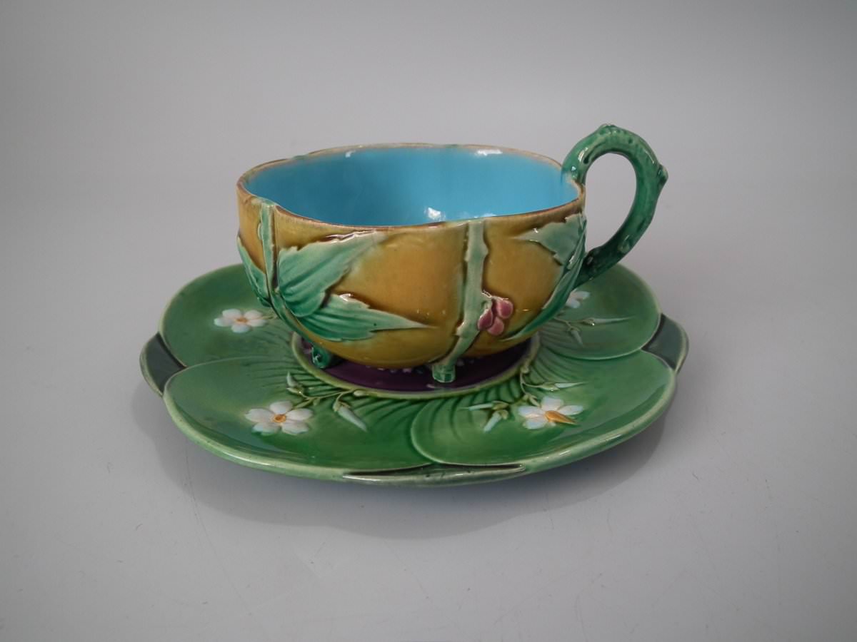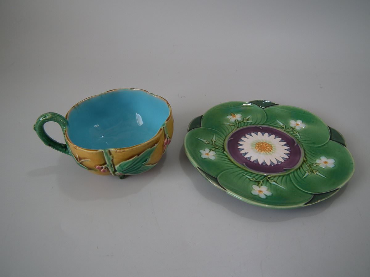 Victorian, circa 1869. 2.8ins high, 5.7ins wide, 5.7ins depth. Minton Majolica cup & saucer which features lily pads, leaves and blossom.