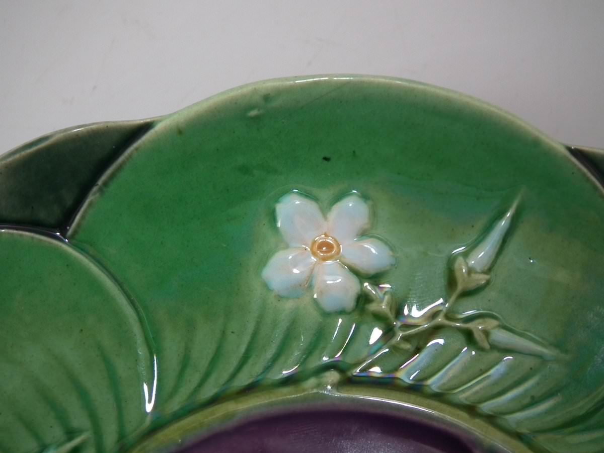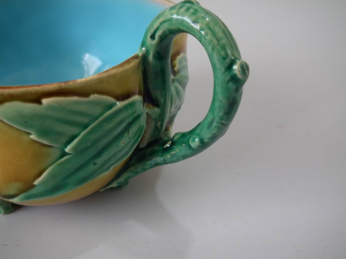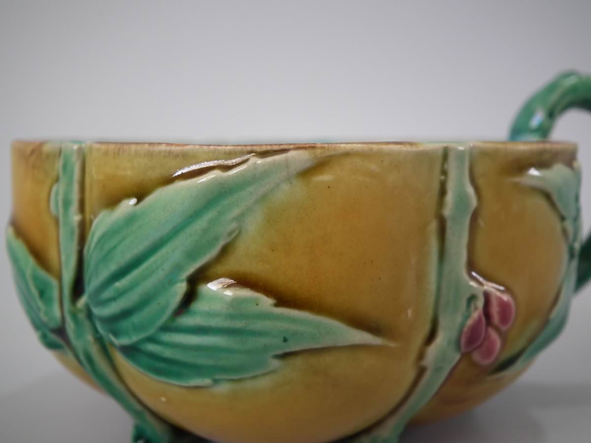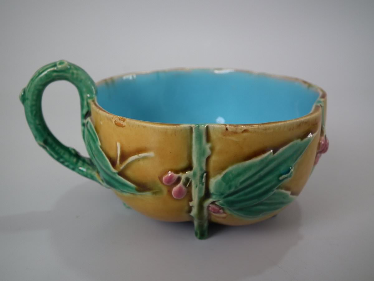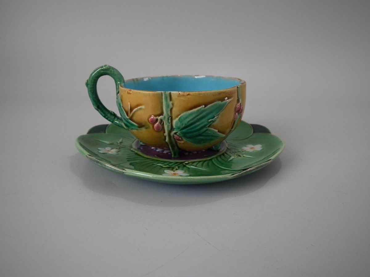 Victorian, circa 1869. 2.8ins high, 5.7ins wide, 5.7ins depth. Minton Majolica cup & saucer which features lily pads, leaves and blossom.