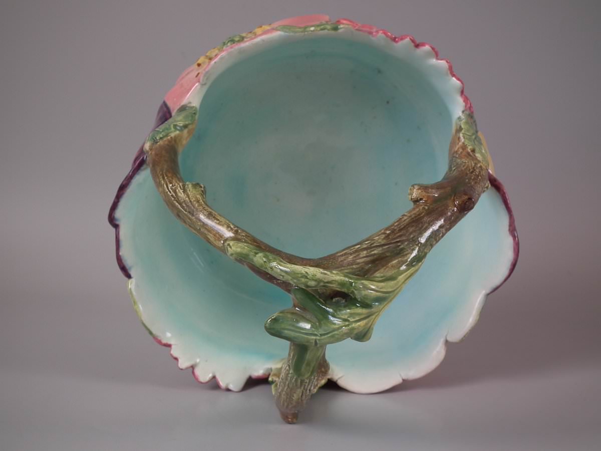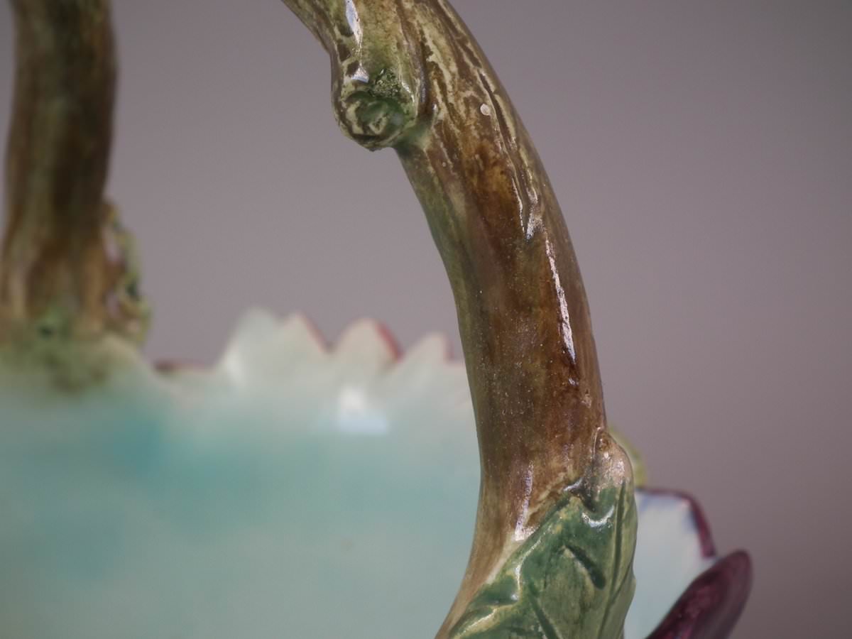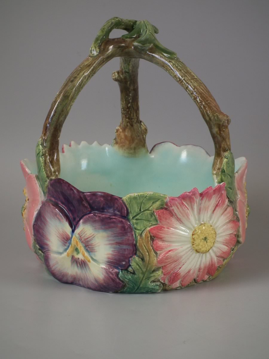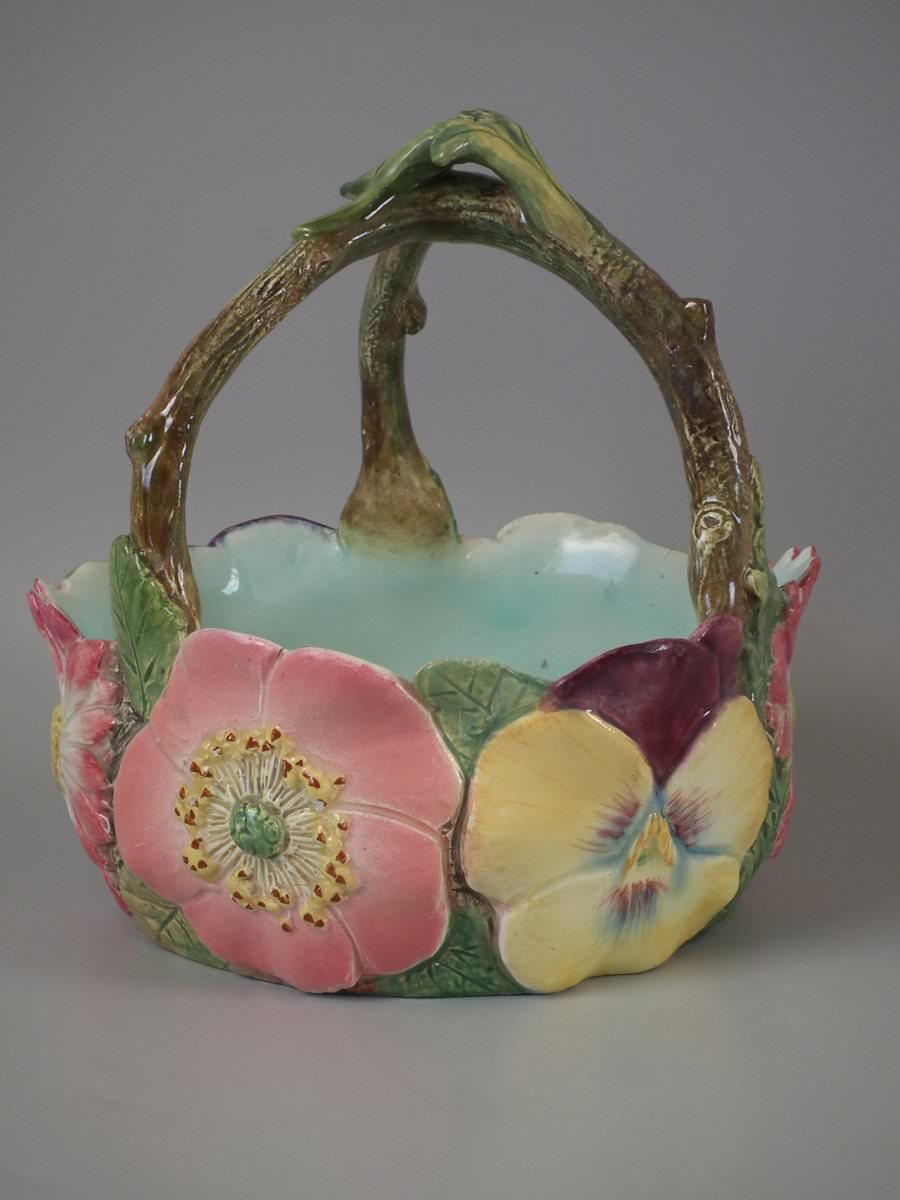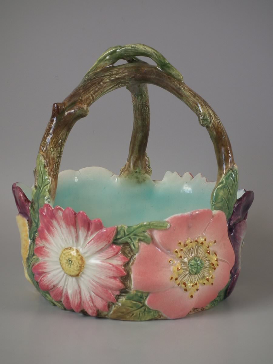 Circa 1900. 8.7ins high, 8.3ins wide, 8.3ins depth. Delphin Massier Majolica flower basket which features a variety of flowers around the sides and a branch handle.