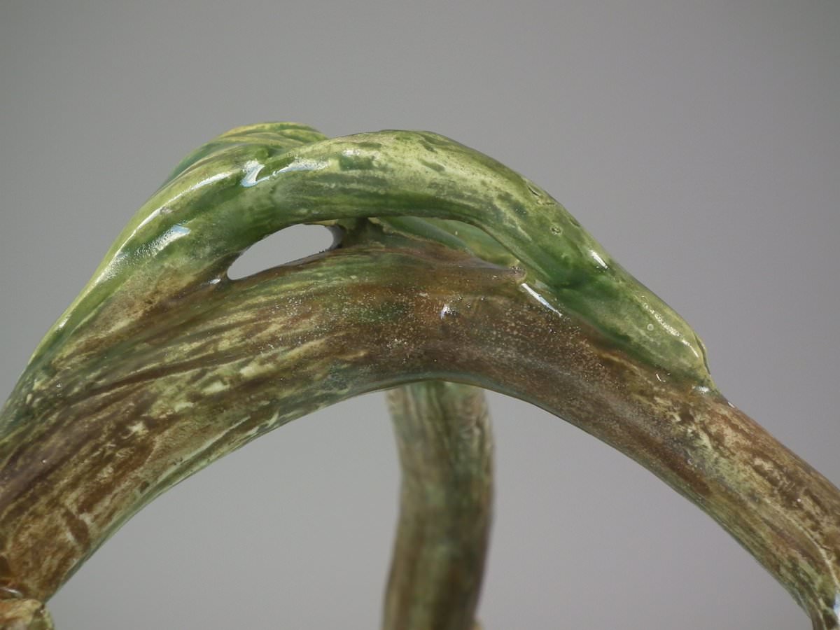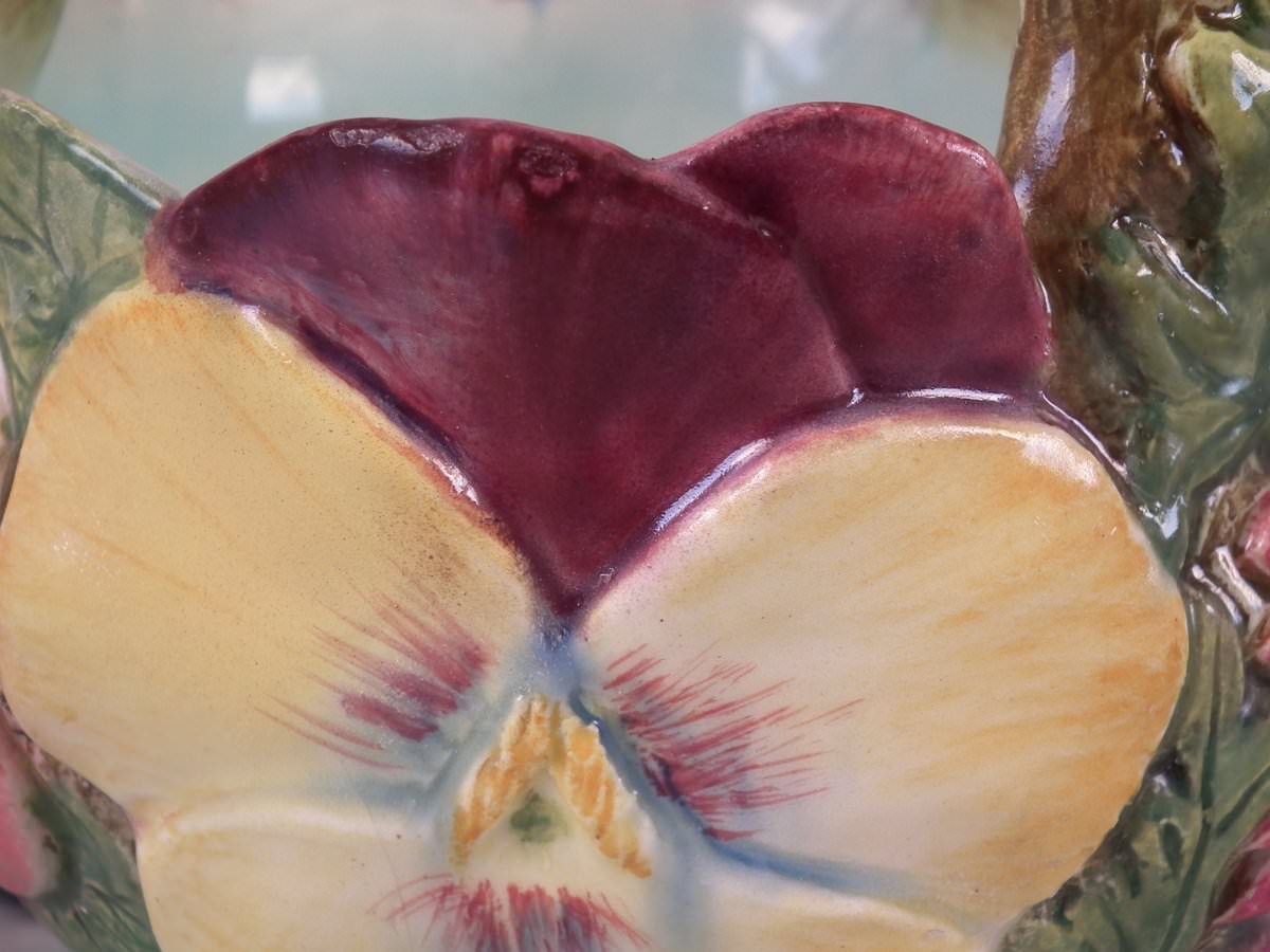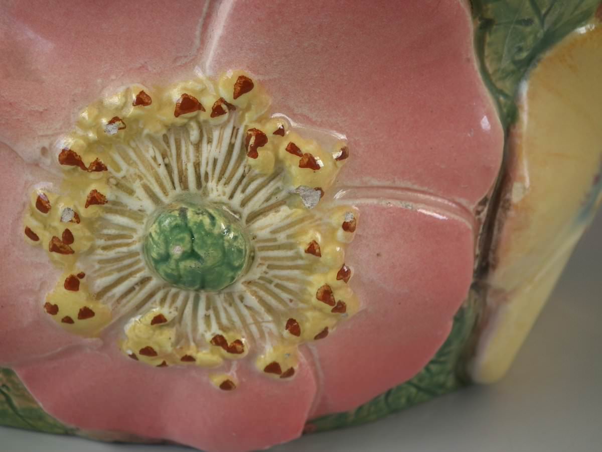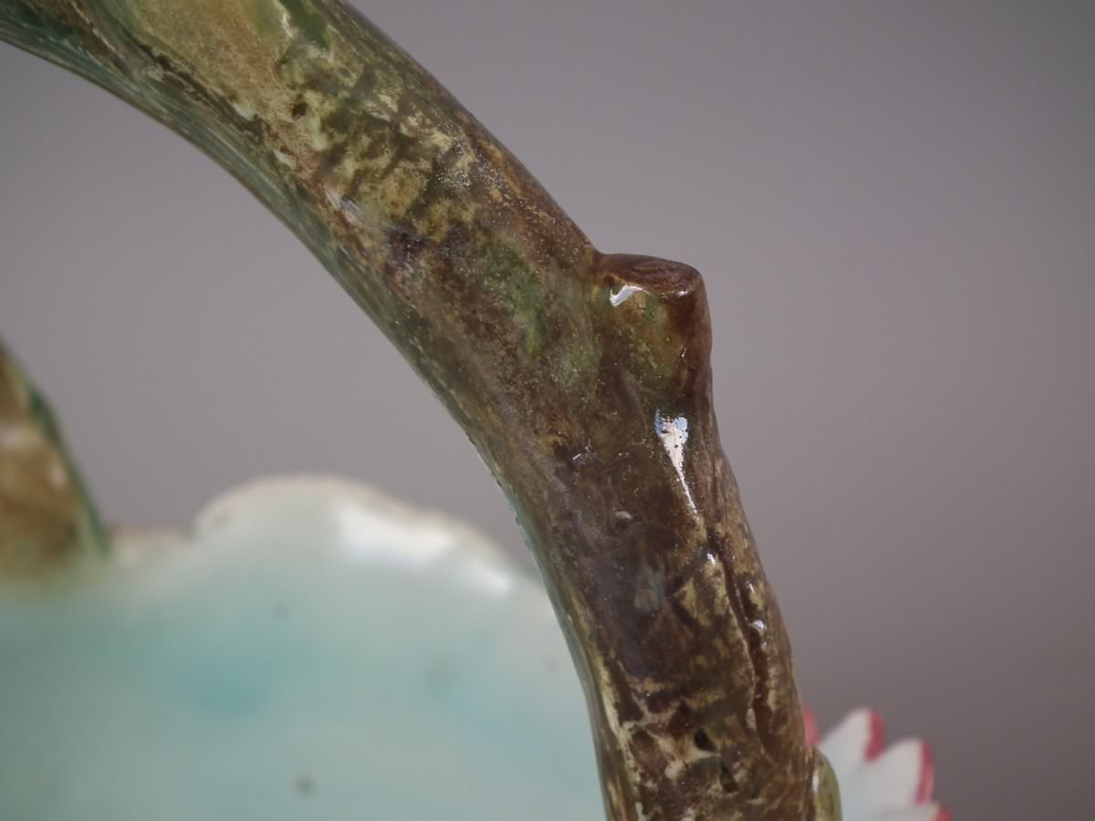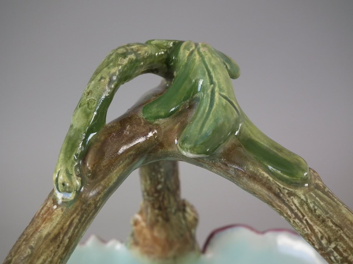 Circa 1900. 8.7ins high, 8.3ins wide, 8.3ins depth. Delphin Massier Majolica flower basket which features a variety of flowers around the sides and a branch handle.