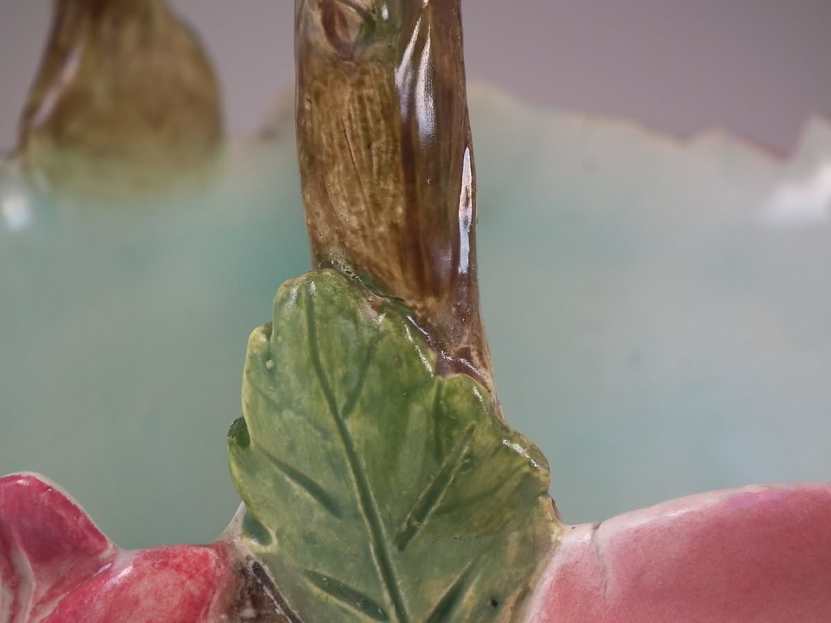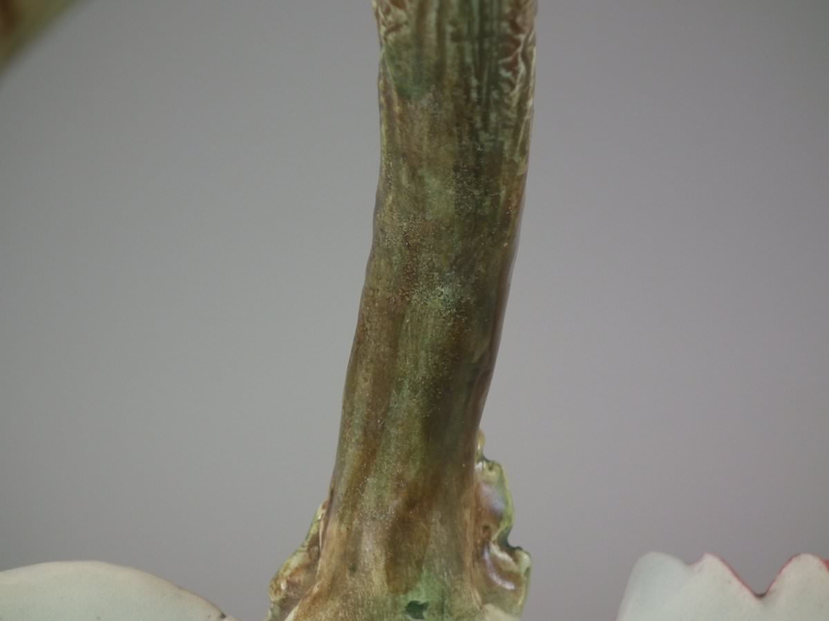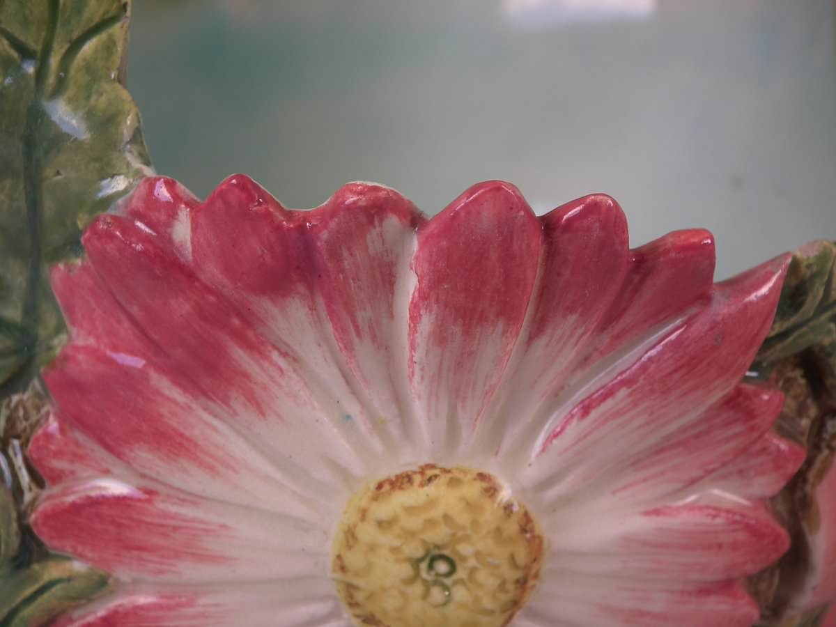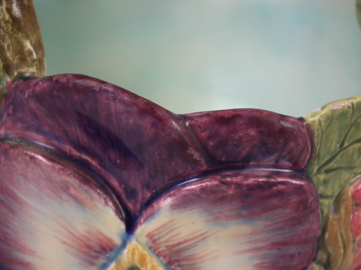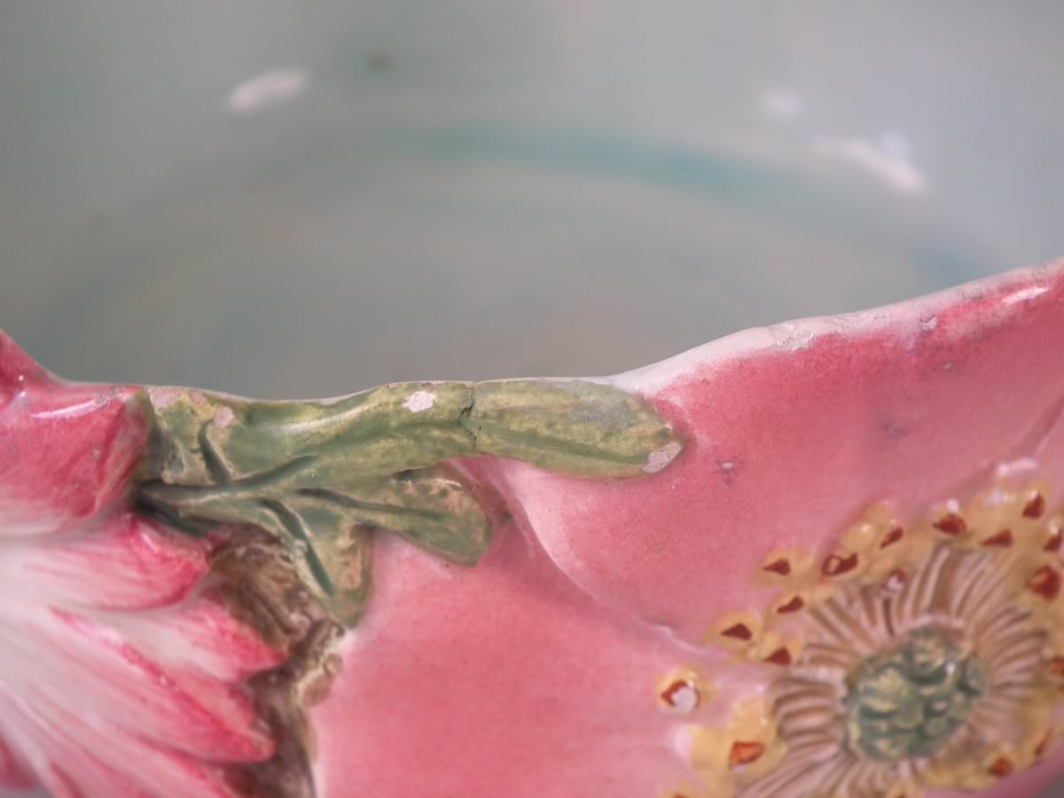Circa 1900. 8.7ins high, 8.3ins wide, 8.3ins depth. Delphin Massier Majolica flower basket which features a variety of flowers around the sides and a branch handle.