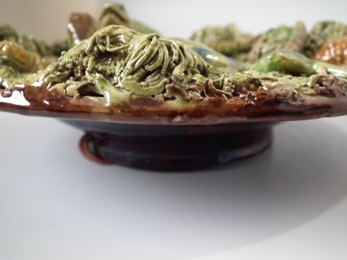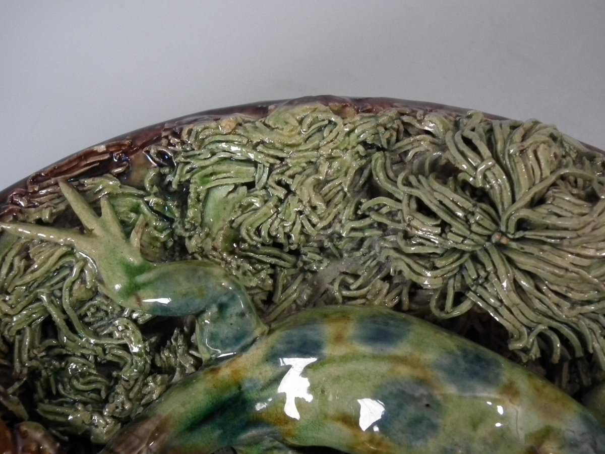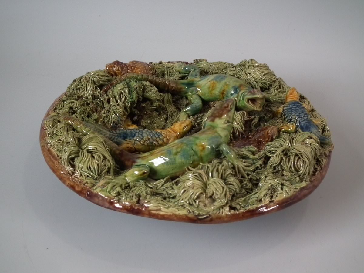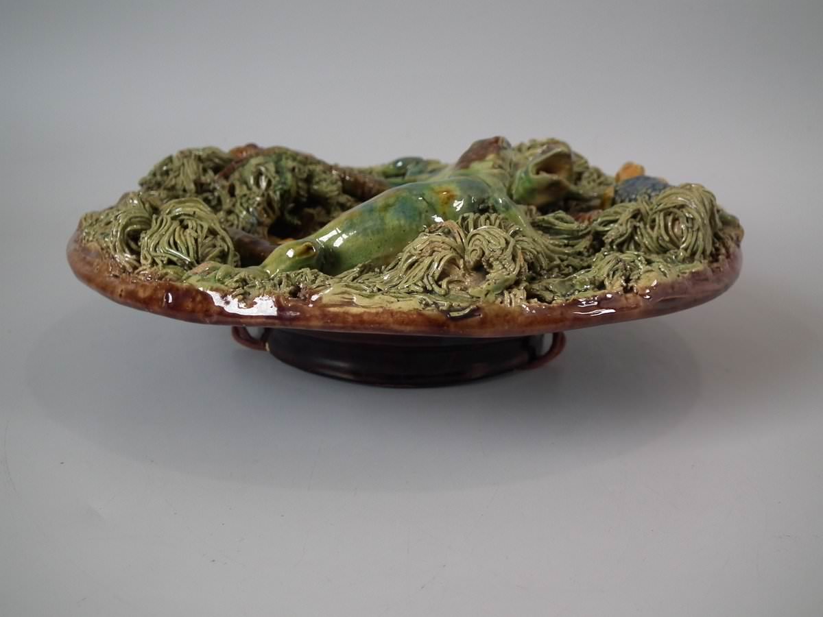 Victorian, circa 1890. 2.8ins high, 8.3ins wide, 8.3ins depth. Mafra Portuguese Palissy Majolica plate which features toads, lizards and salamanders. Colouration: green, brown, blue, are predominant.