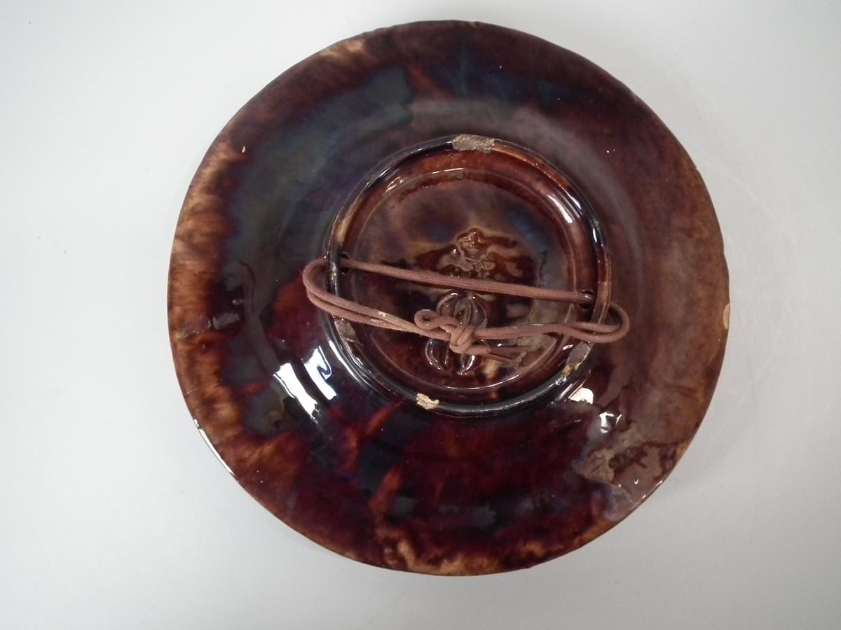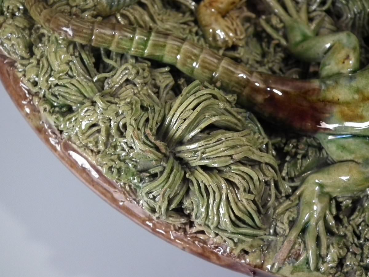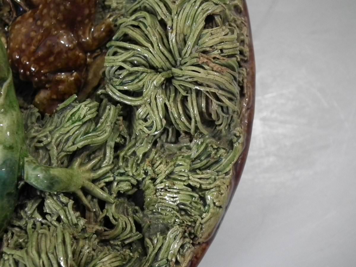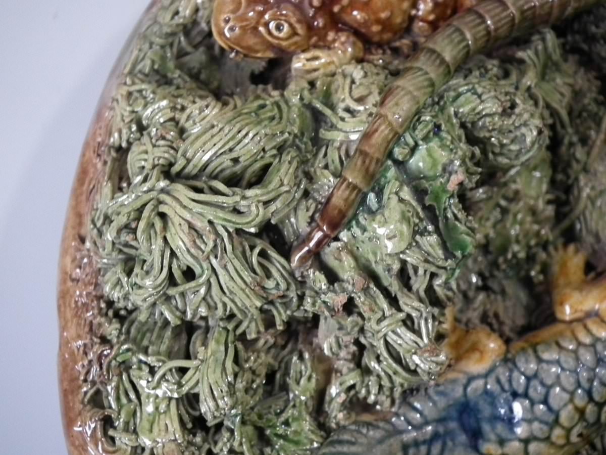 Victorian, circa 1890. 2.8ins high, 8.3ins wide, 8.3ins depth. Mafra Portuguese Palissy Majolica plate which features toads, lizards and salamanders. Colouration: green, brown, blue, are predominant.