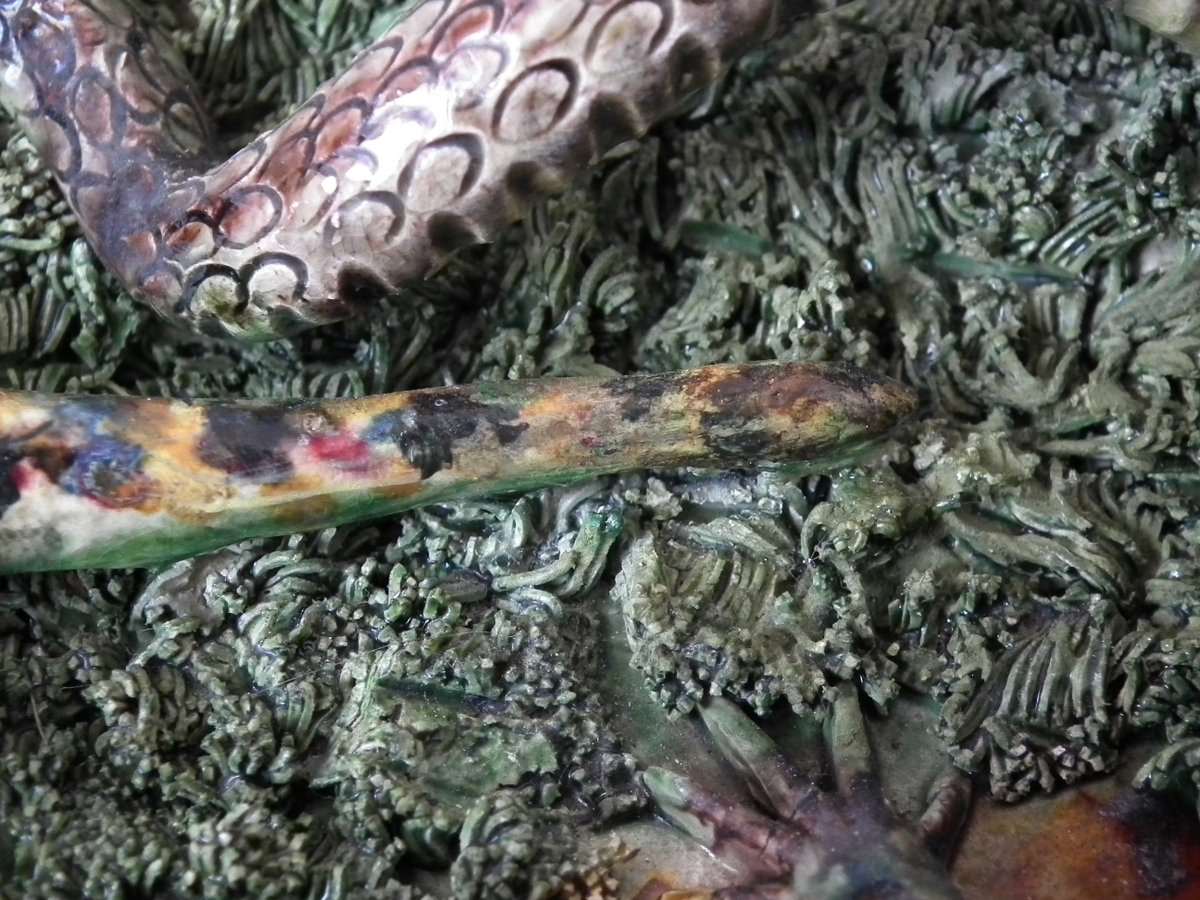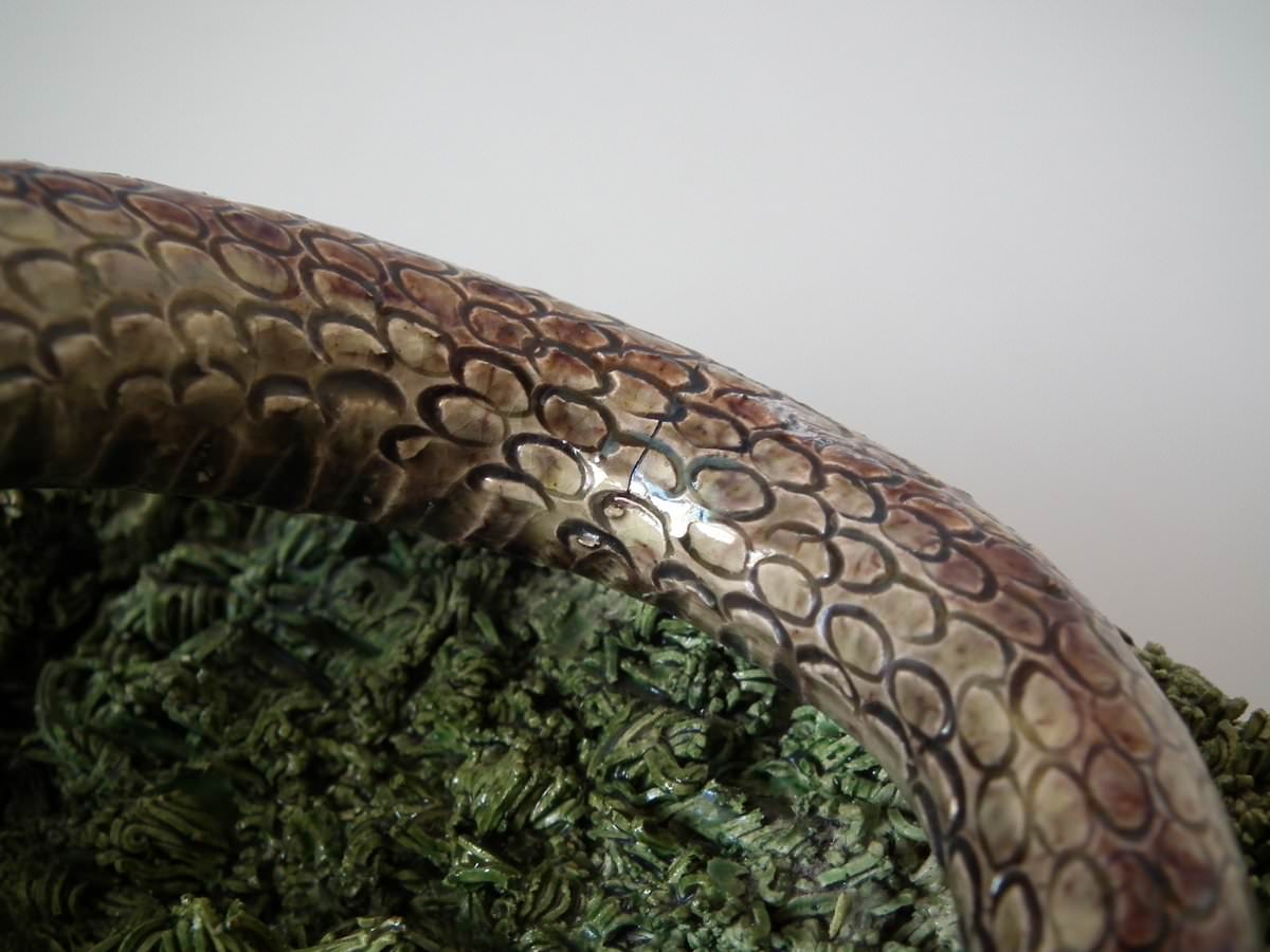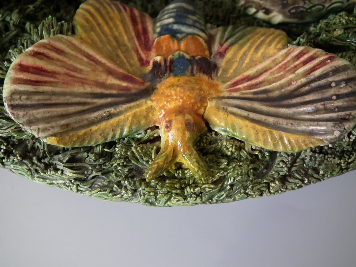 Circa 1890. 9.8ins high, 9.8ins wide, 3.9ins depth. Jose A Cunha Portuguese Palissy Majolica wall plate which features a snake attacking a lizard in a burrow.