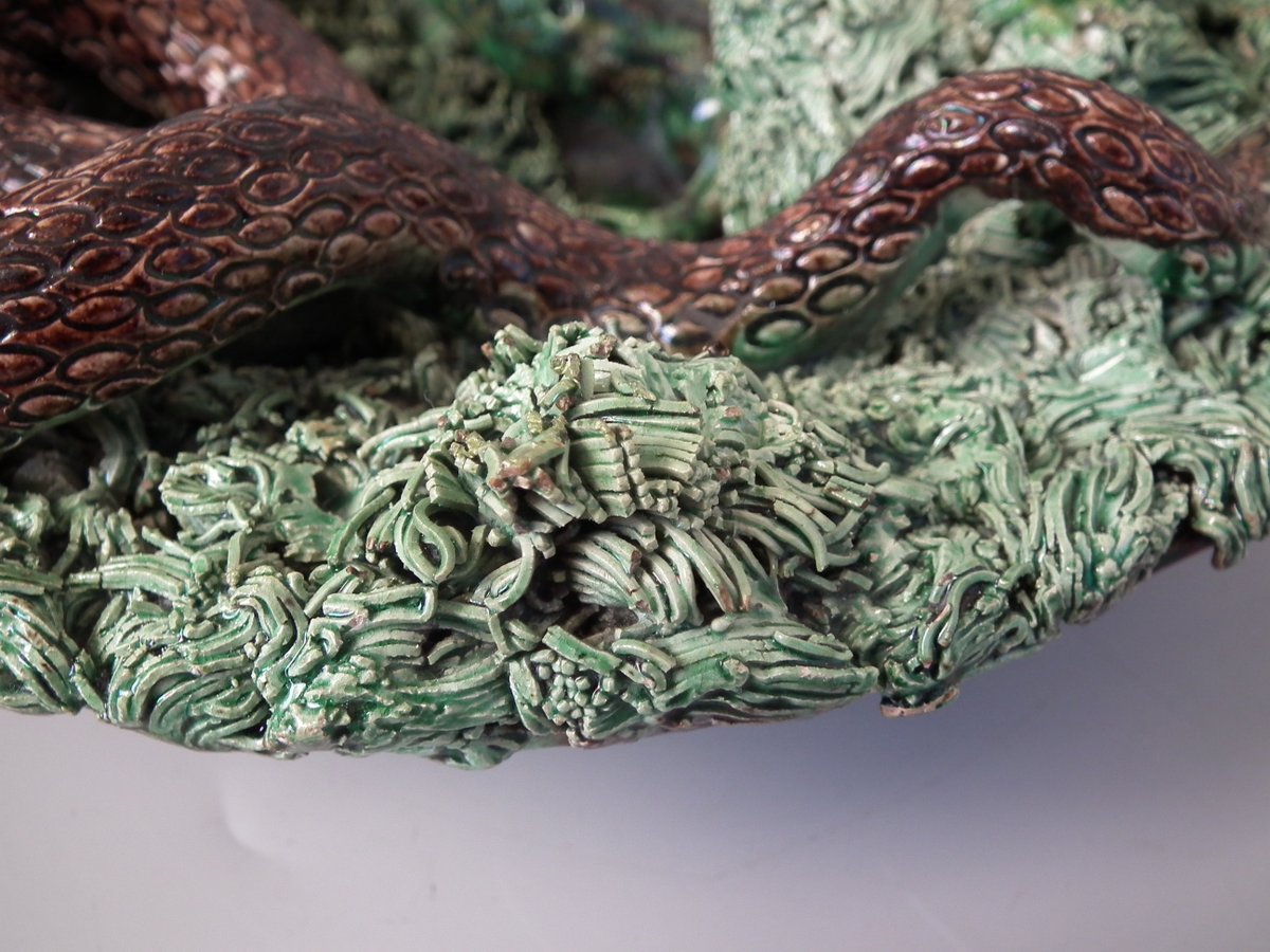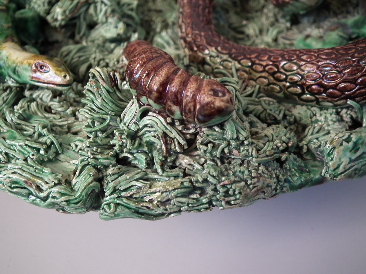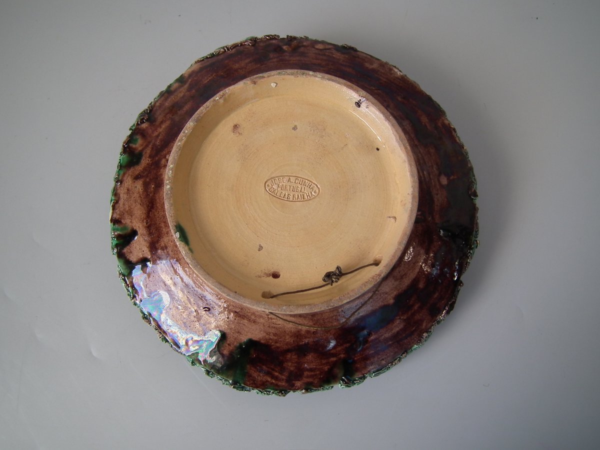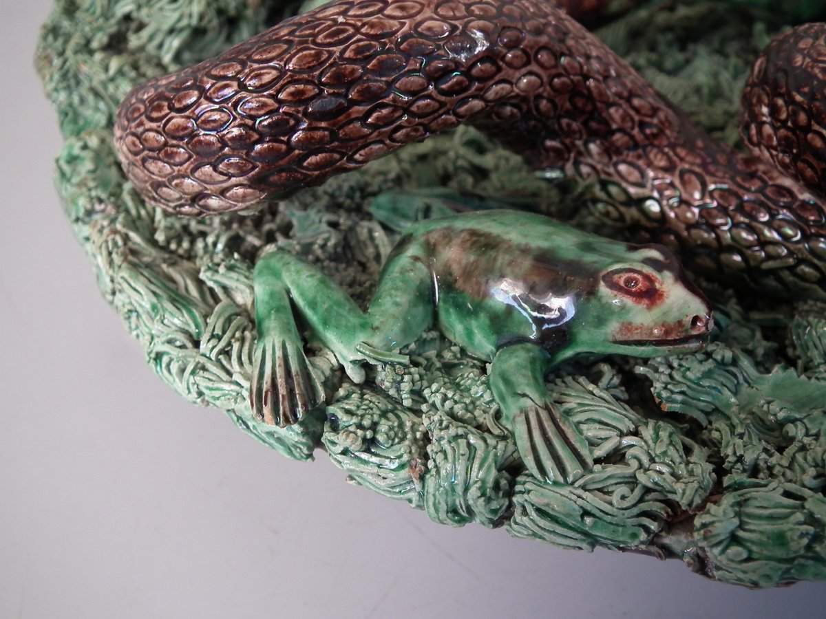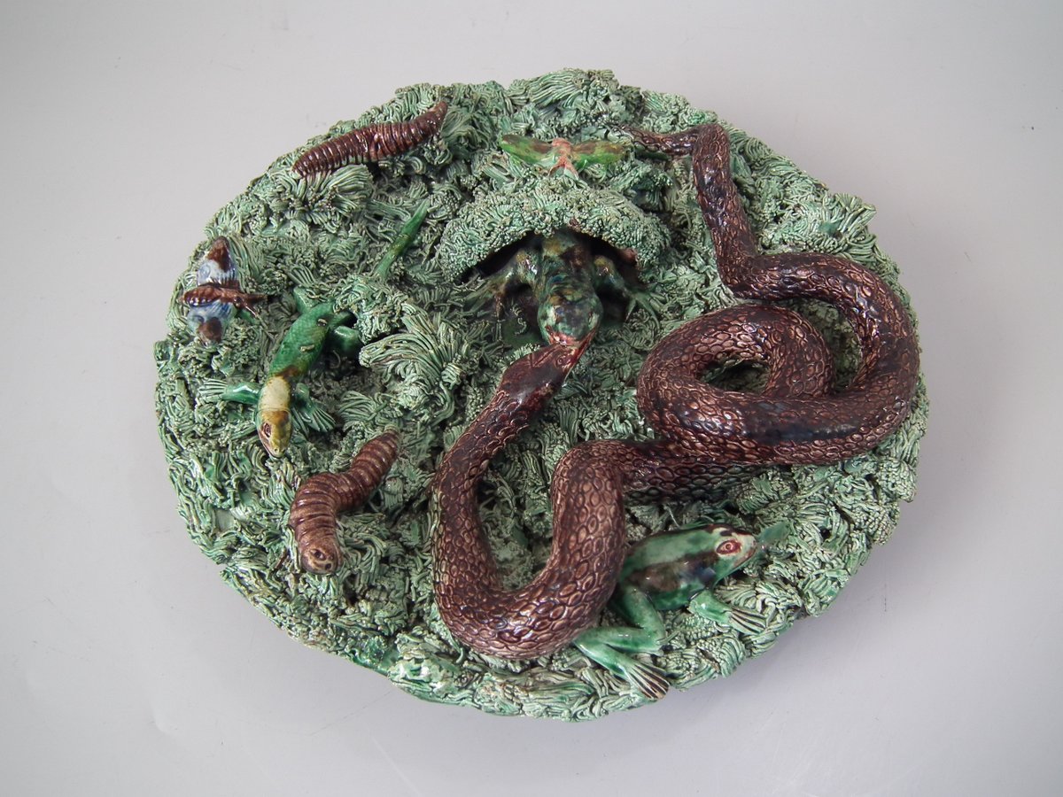 Circa 1890. 2.8ins high, 9.4ins wide, 9.4ins depth. Jose A Cunha Portuguese Palissy Majolica wall plate which features a snake, a lizard in a burrow, moths, grubs and a frog.