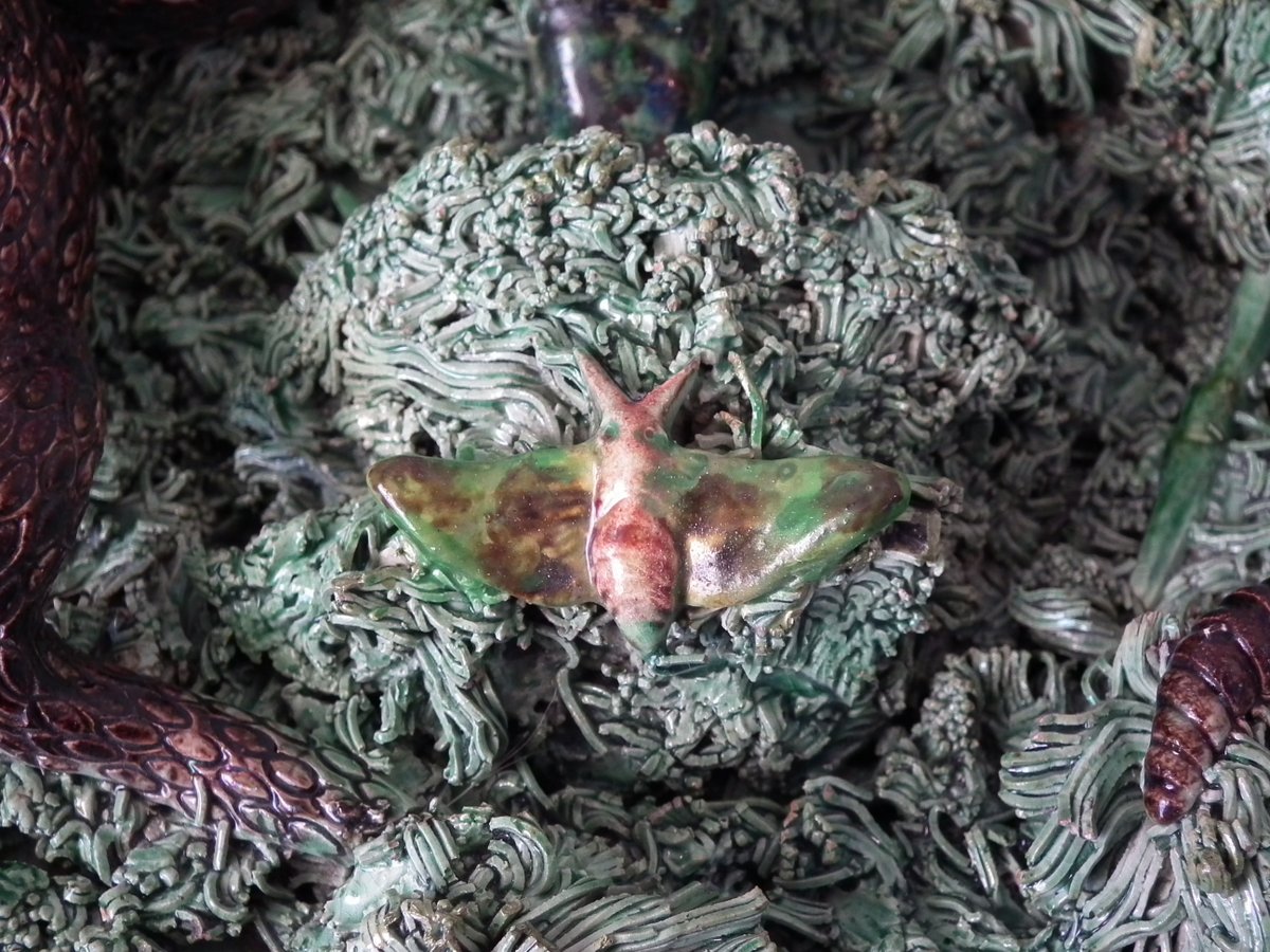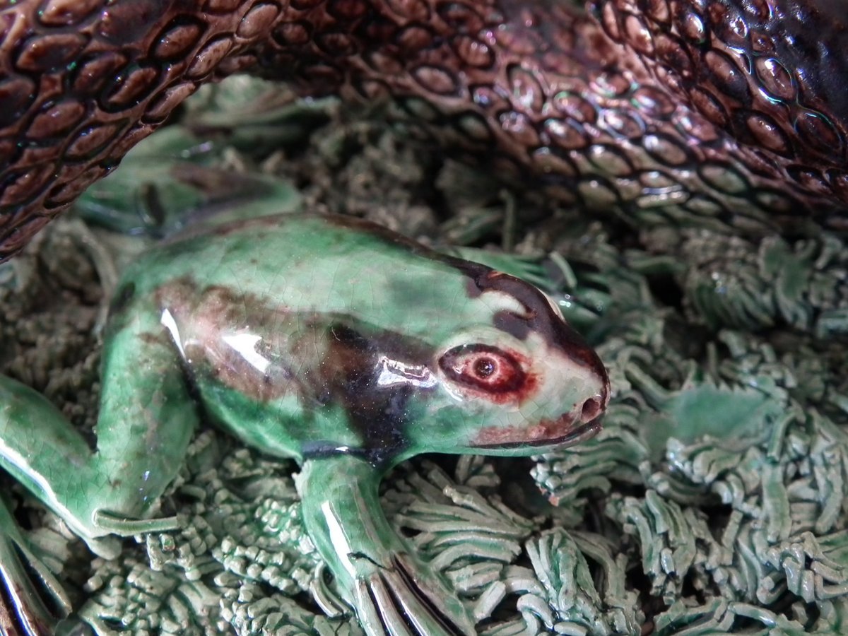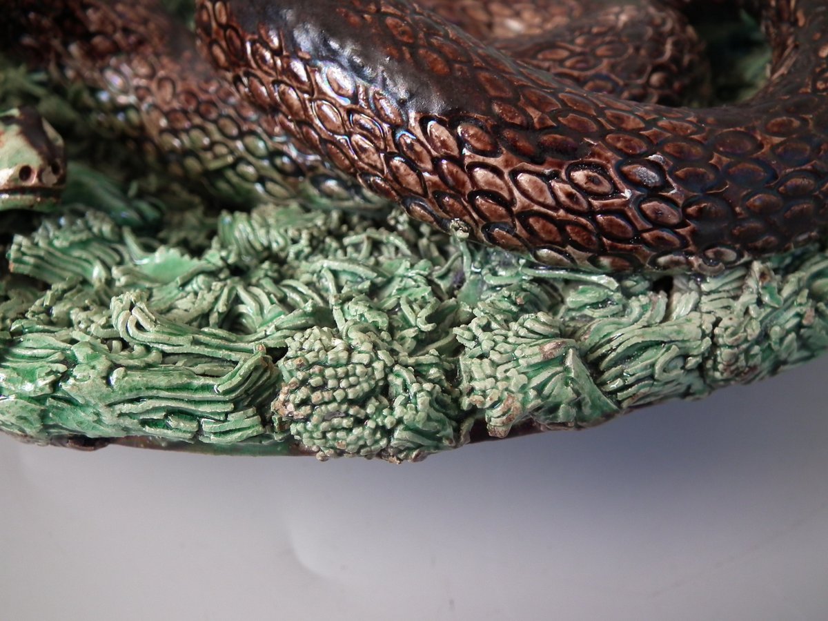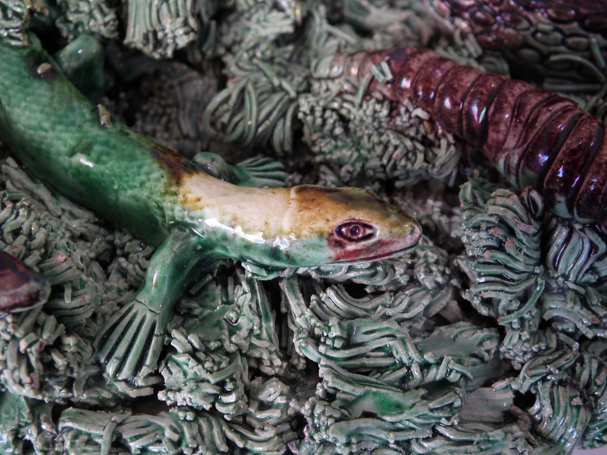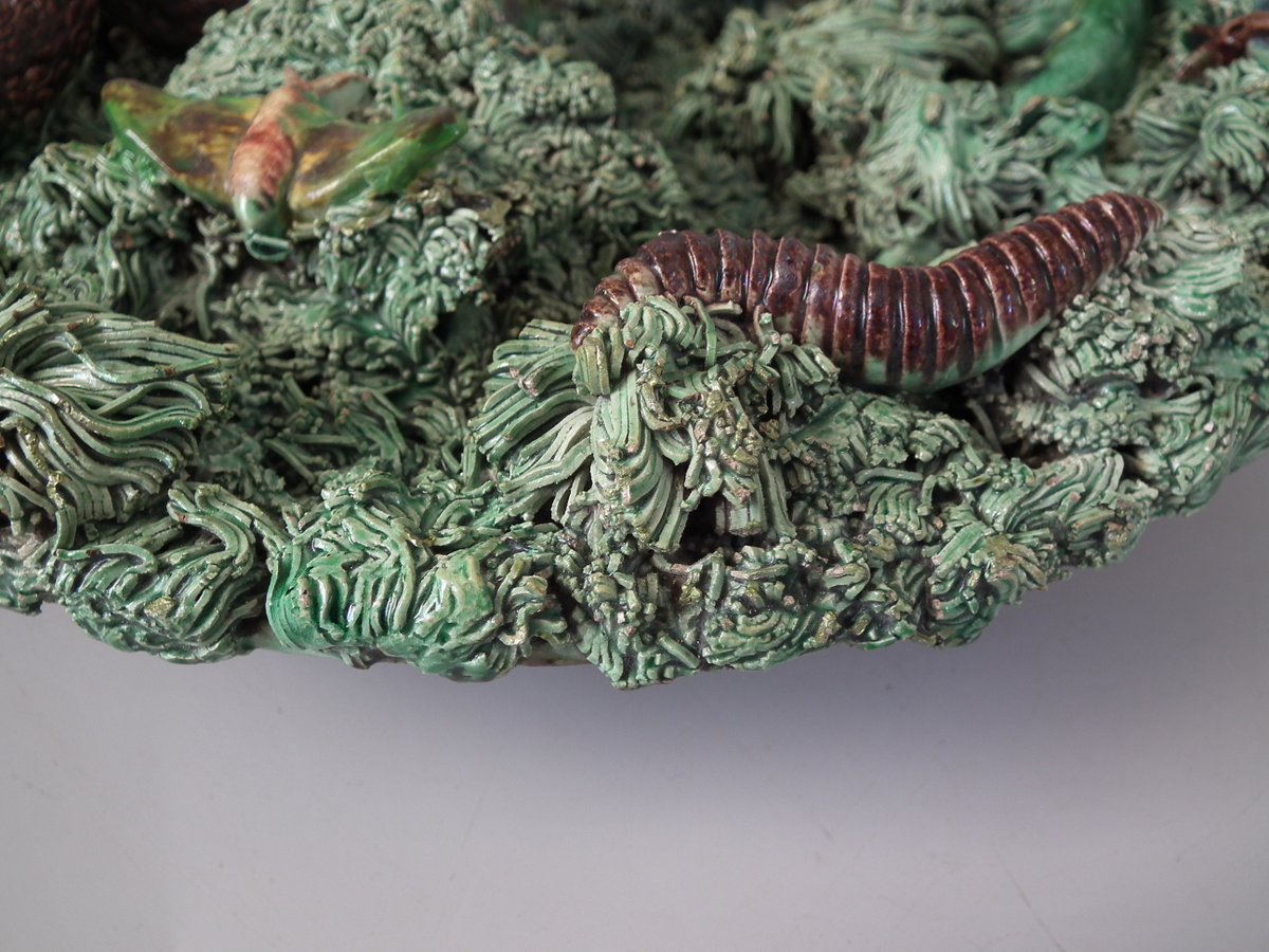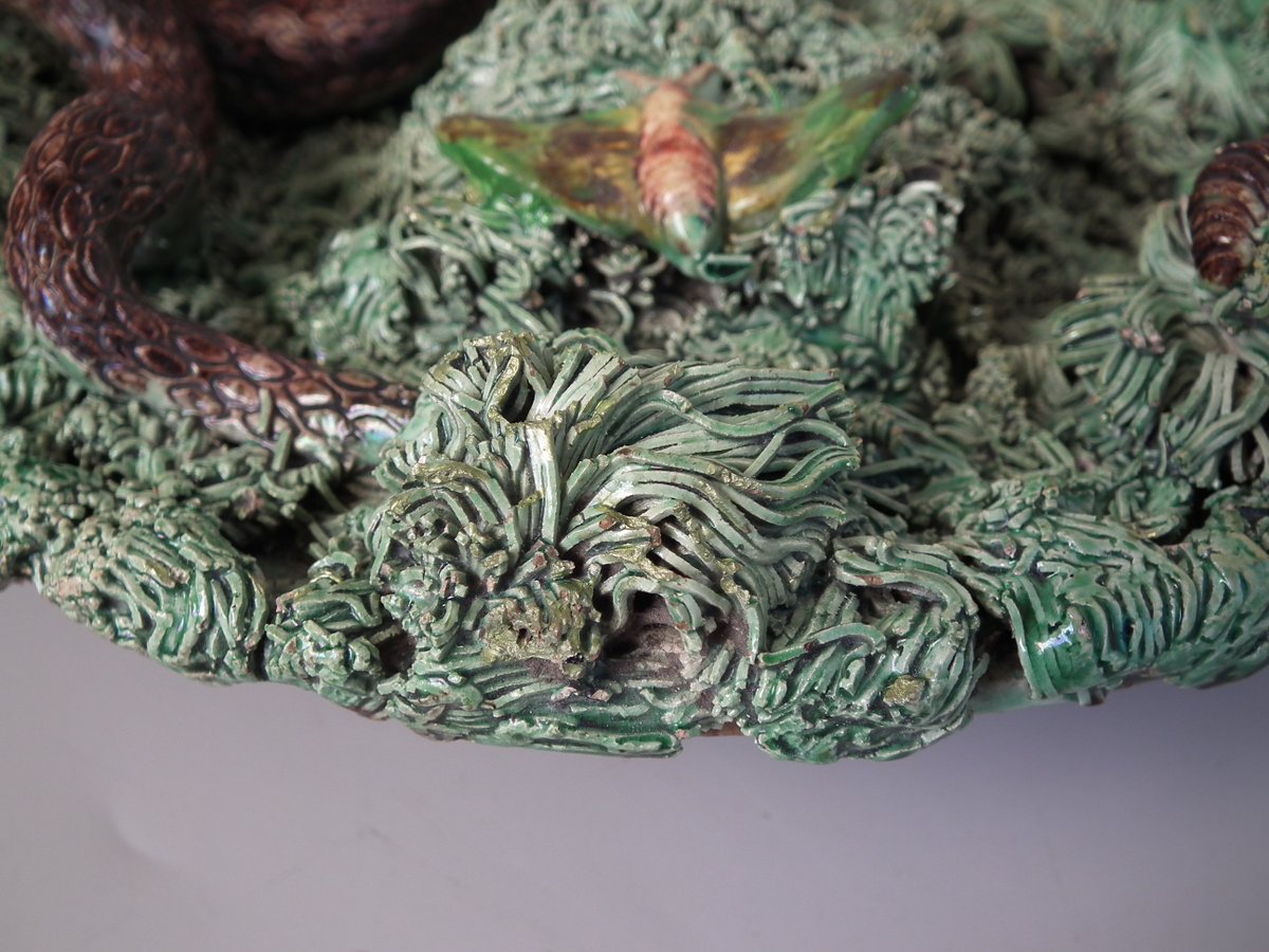 Circa 1890. 2.8ins high, 9.4ins wide, 9.4ins depth. Jose A Cunha Portuguese Palissy Majolica wall plate which features a snake, a lizard in a burrow, moths, grubs and a frog.